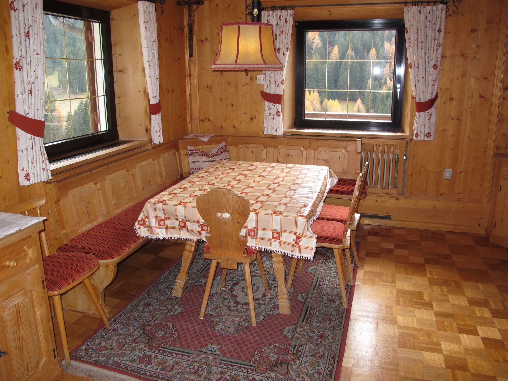 The 120-square-metre chalet welcomes guests with beautifully crafted wooden interiors and parquet floors that reflect centuries-old South Tyrolean craftsmanship. The cosy living and dining room serves as the heart of the home, featuring a dining nook and satellite television for relaxing evenings after days on the slopes. The well-appointed kitchen comes fully equipped with modern appliances including an oven, dishwasher, microwave, and electric coffee machine, making it easy to prepare hearty meals for your group.