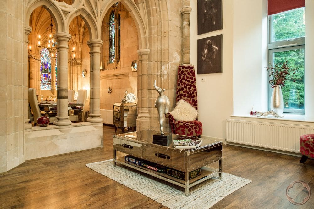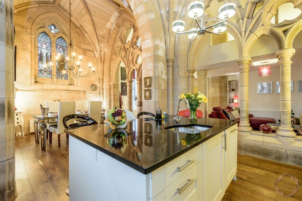 Step inside to discover a sophisticated blend of traditional and contemporary design. The living area is a masterpiece of style, featuring modern furnishings artfully juxtaposed with antique elements. The mezzanine master bedroom offers a unique vantage point, overlooking the vibrant hues cast by the stained glass windows. The second bedroom provides a cozy retreat, ensuring restful nights. A fully equipped kitchen caters to culinary enthusiasts, while the elegant dining area is perfect for intimate gatherings.