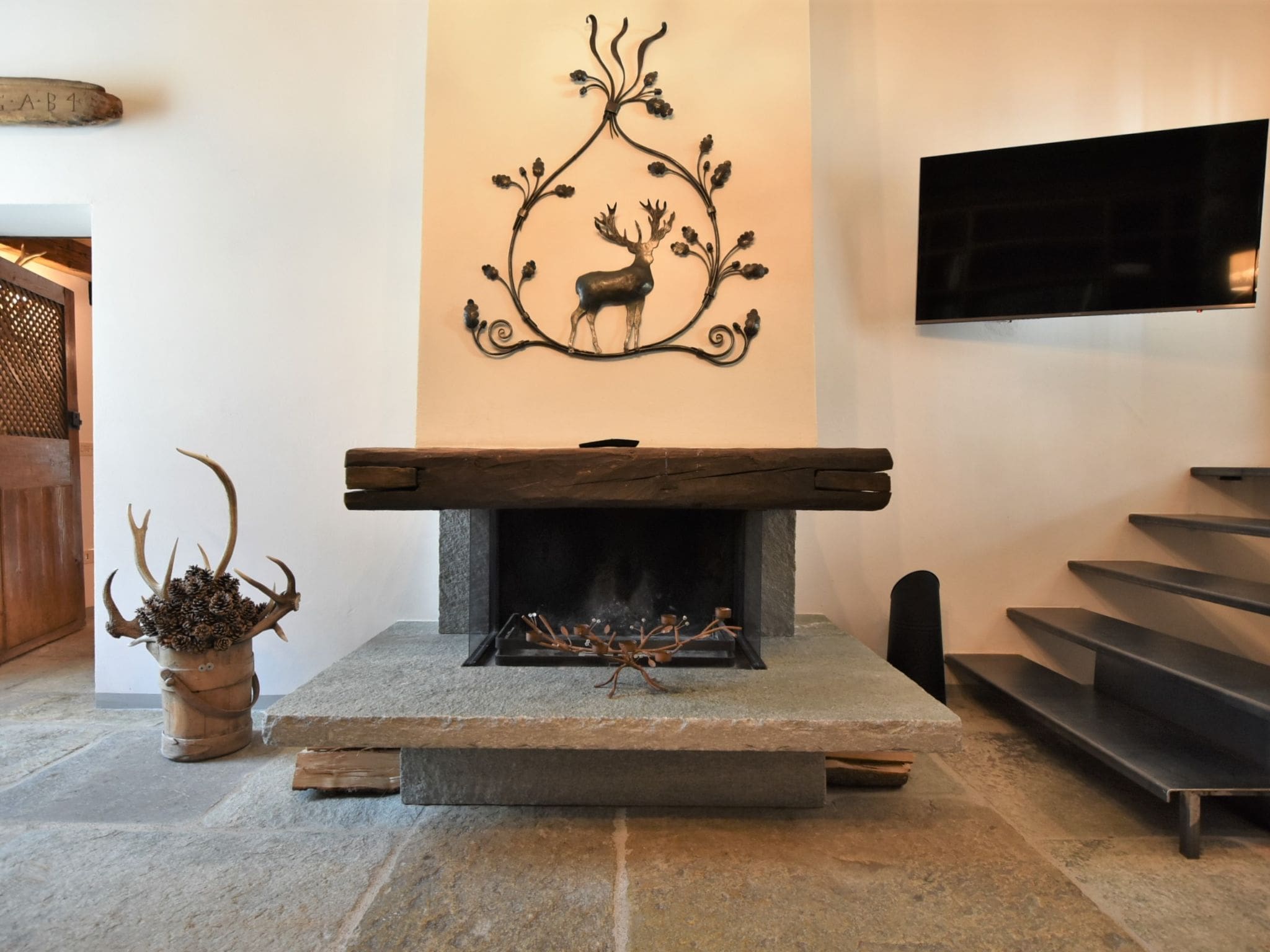 Spread across three carefully designed levels, this distinguished chalet accommodates up to eight guests in four beautifully appointed bedrooms, each with private en-suite facilities. The property features multiple living spaces, including a grand living and dining room with an open-hearth fireplace and flat-screen television, complemented by a separate large dining room that also enjoys its own fireplace. The sloping ceilings throughout the upper floors create an intimate Alpine atmosphere, while natural stone and wooden floors add warmth and character.