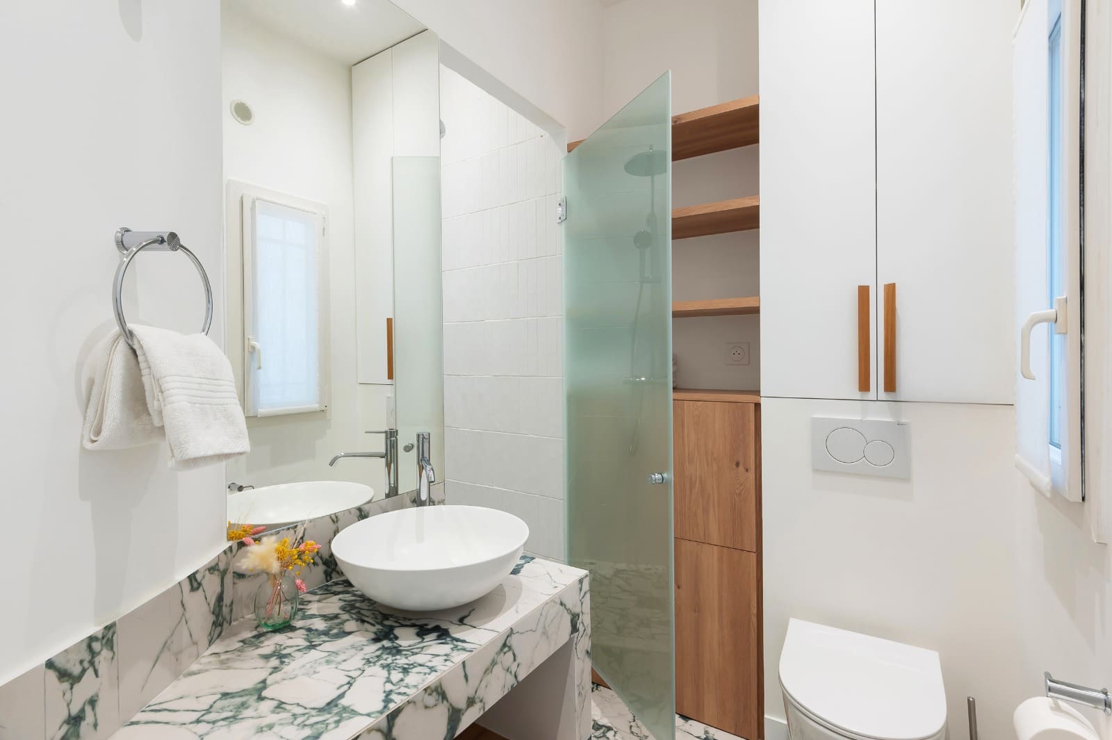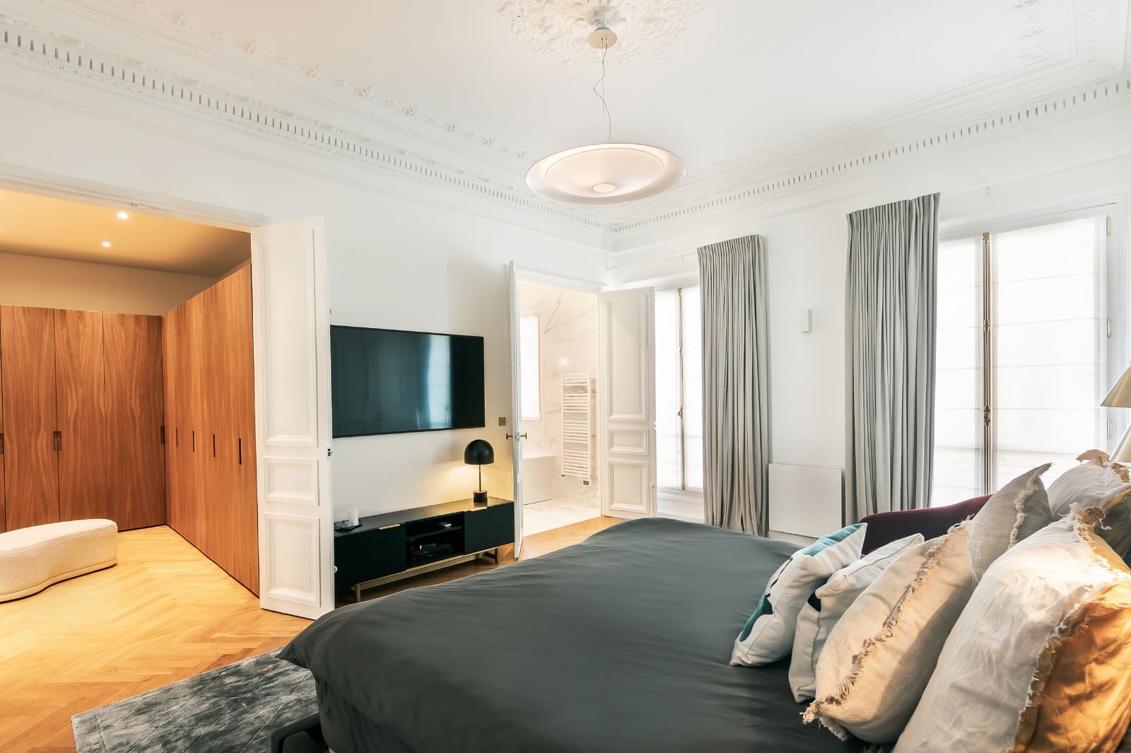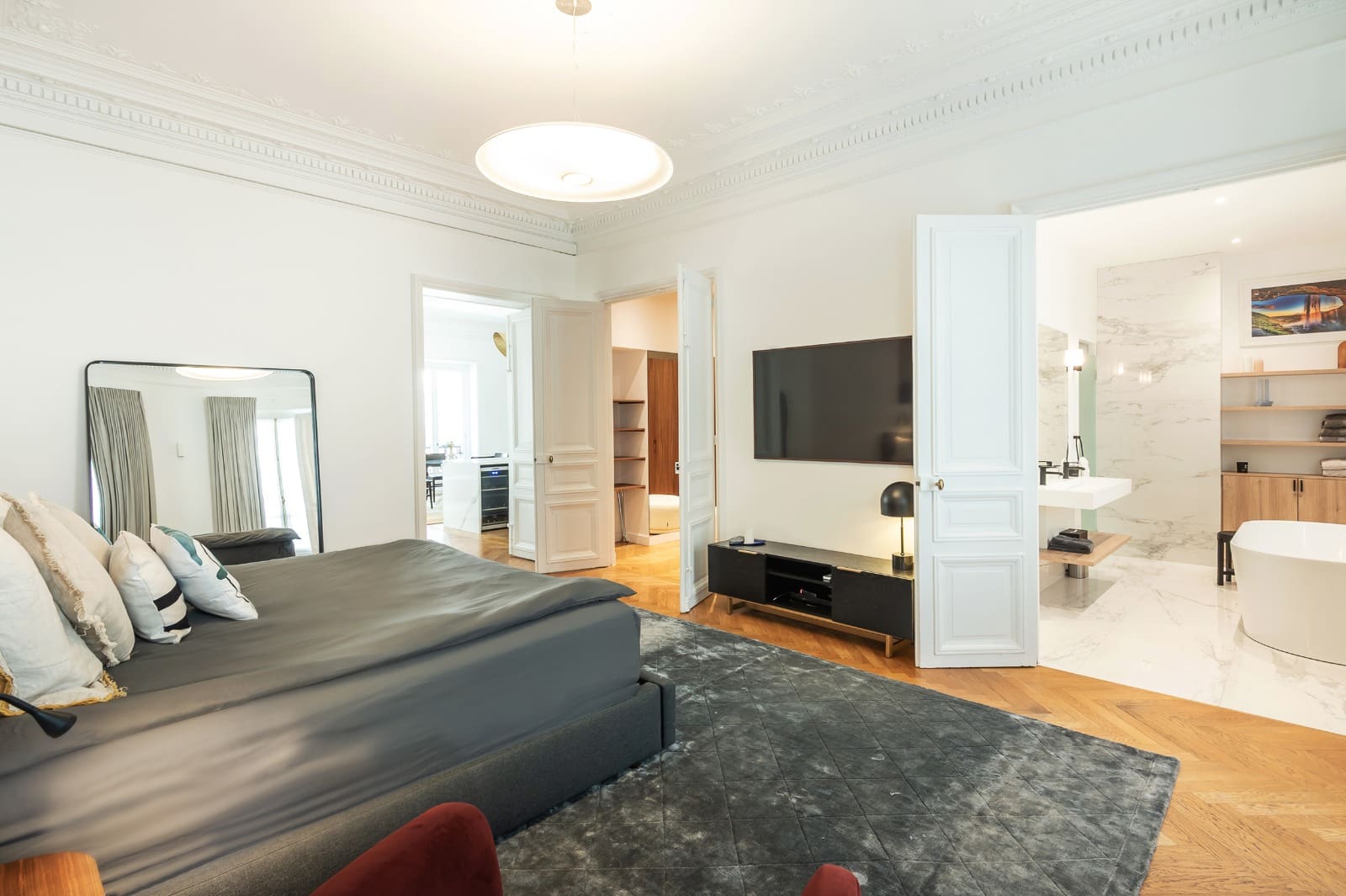 Step inside this beautifully designed apartment where high ceilings and bespoke finishes create an atmosphere of opulence. The open-plan living space, reminiscent of a grand ballroom, is ideal for entertaining or simply relaxing. A chef’s kitchen provides the perfect setting for culinary exploration, while two opulent bedrooms offer restful retreats. The master suite includes a walk-in closet and a standalone bathtub, inviting you to unwind after a day of Parisian adventures.