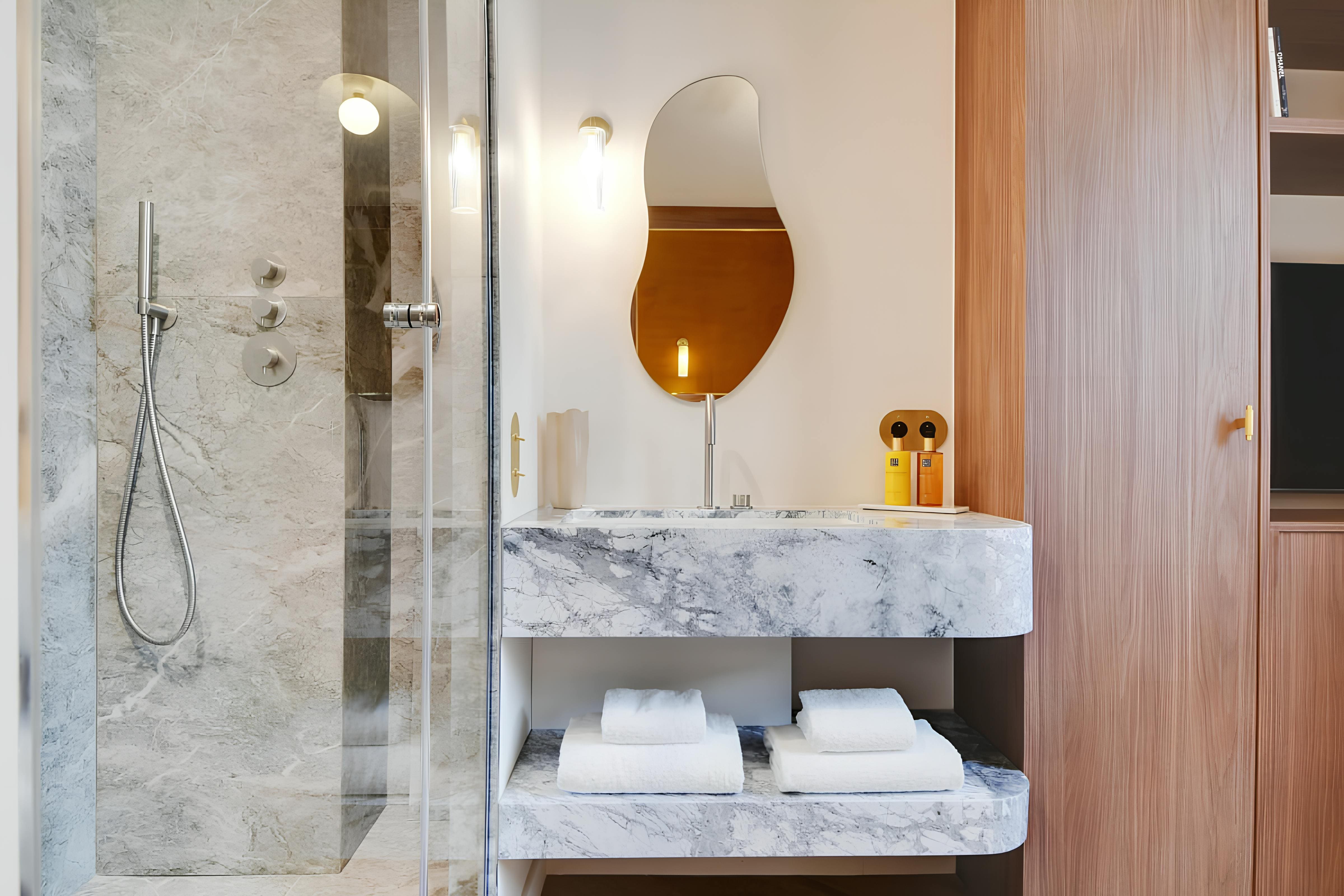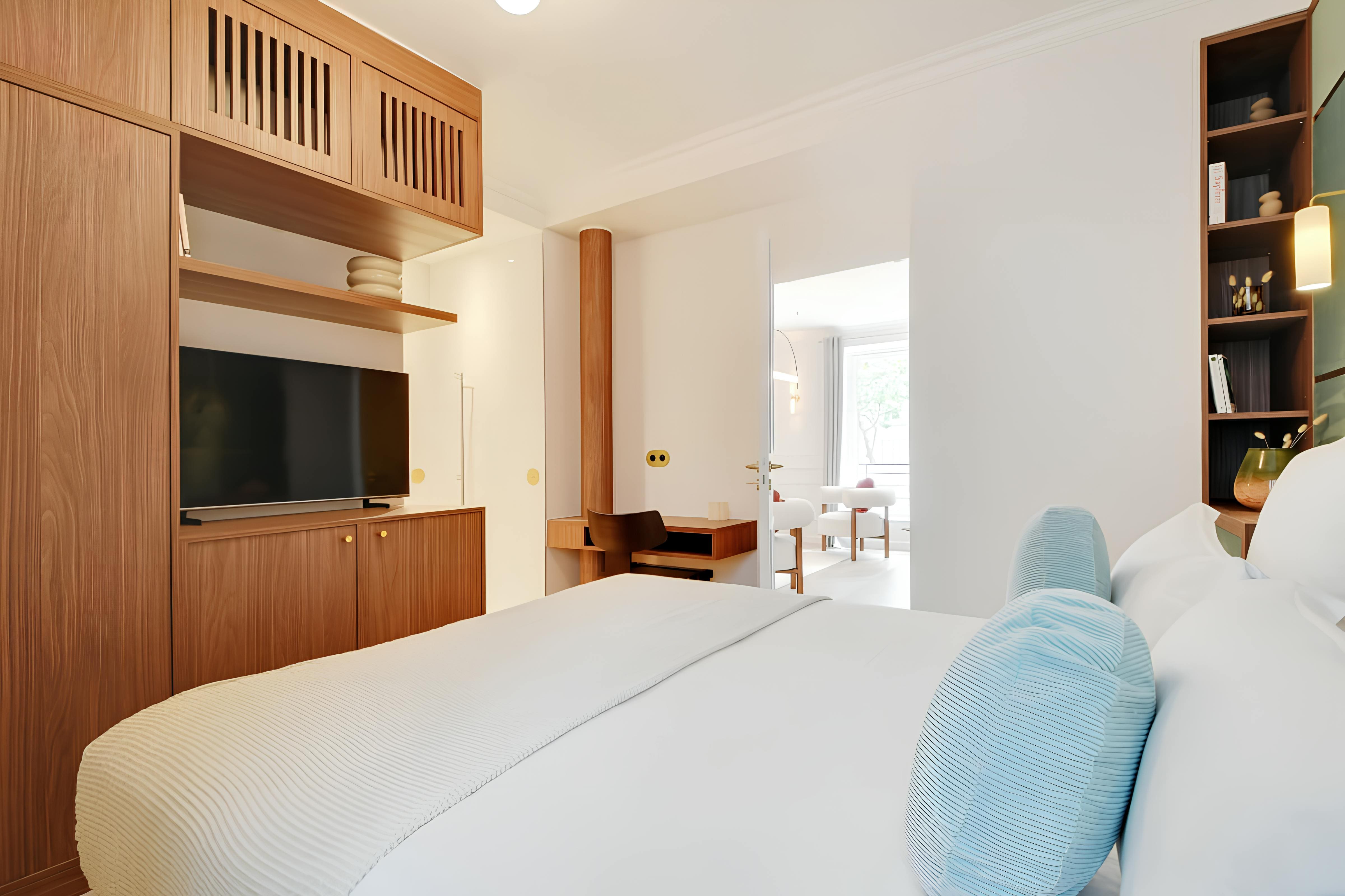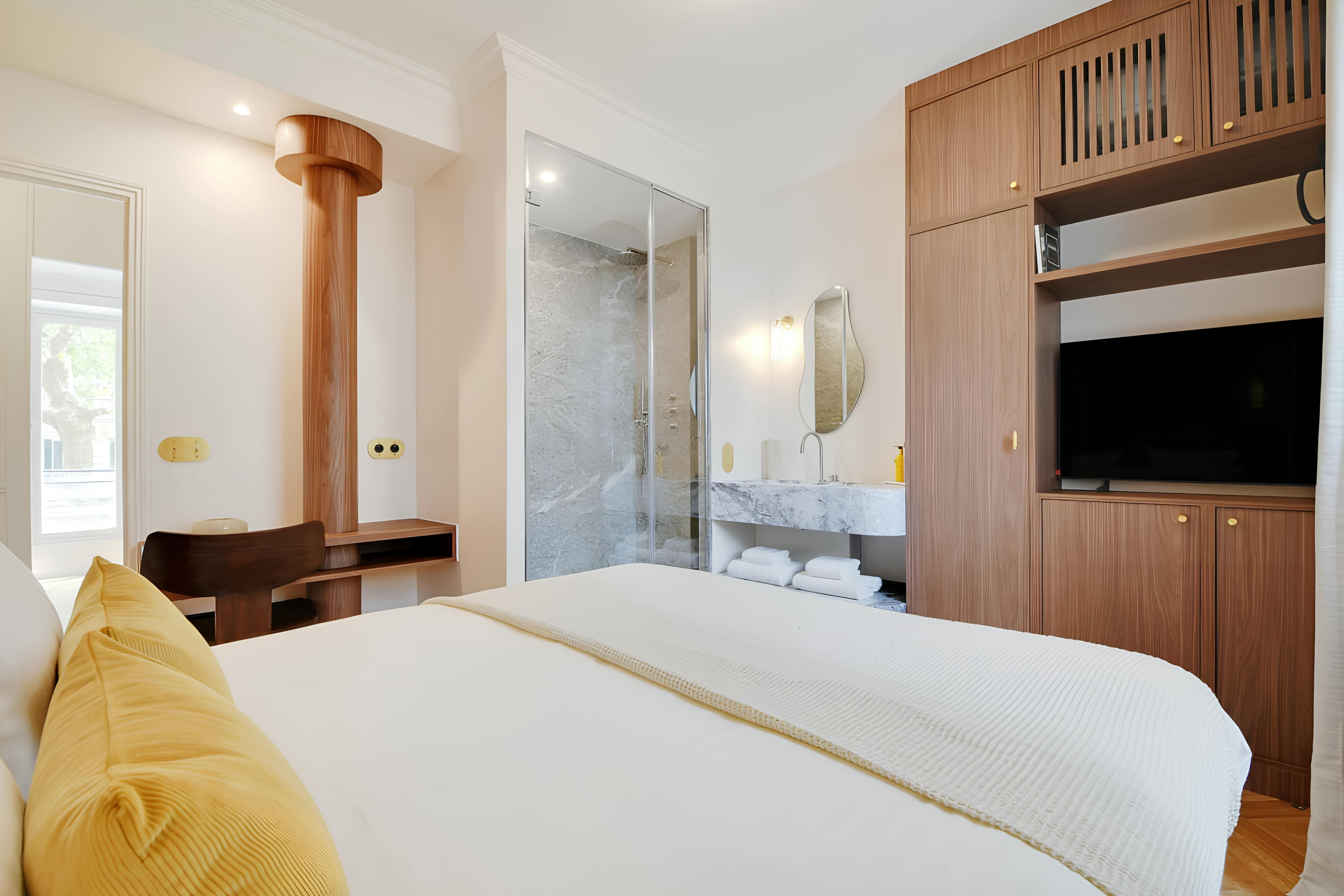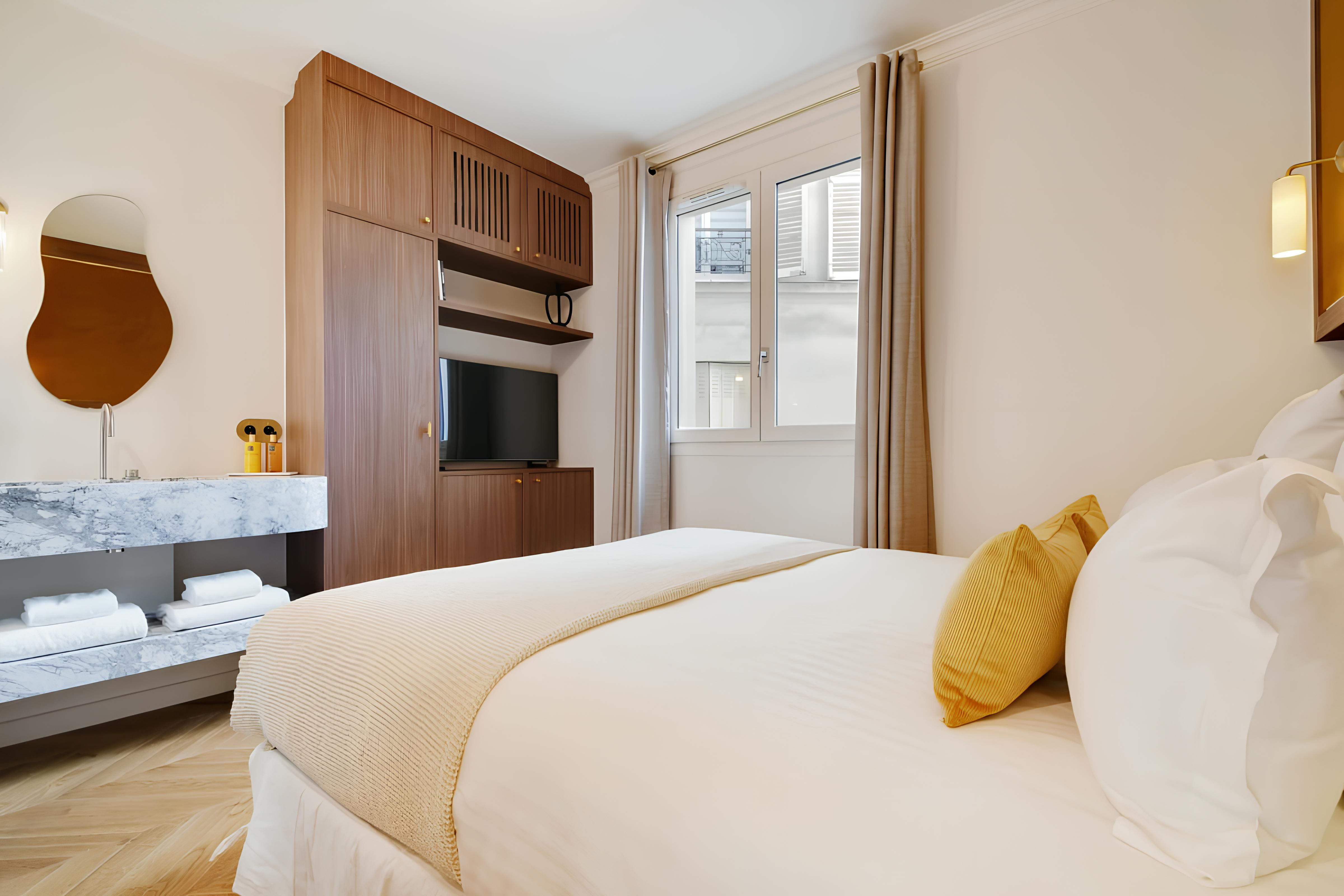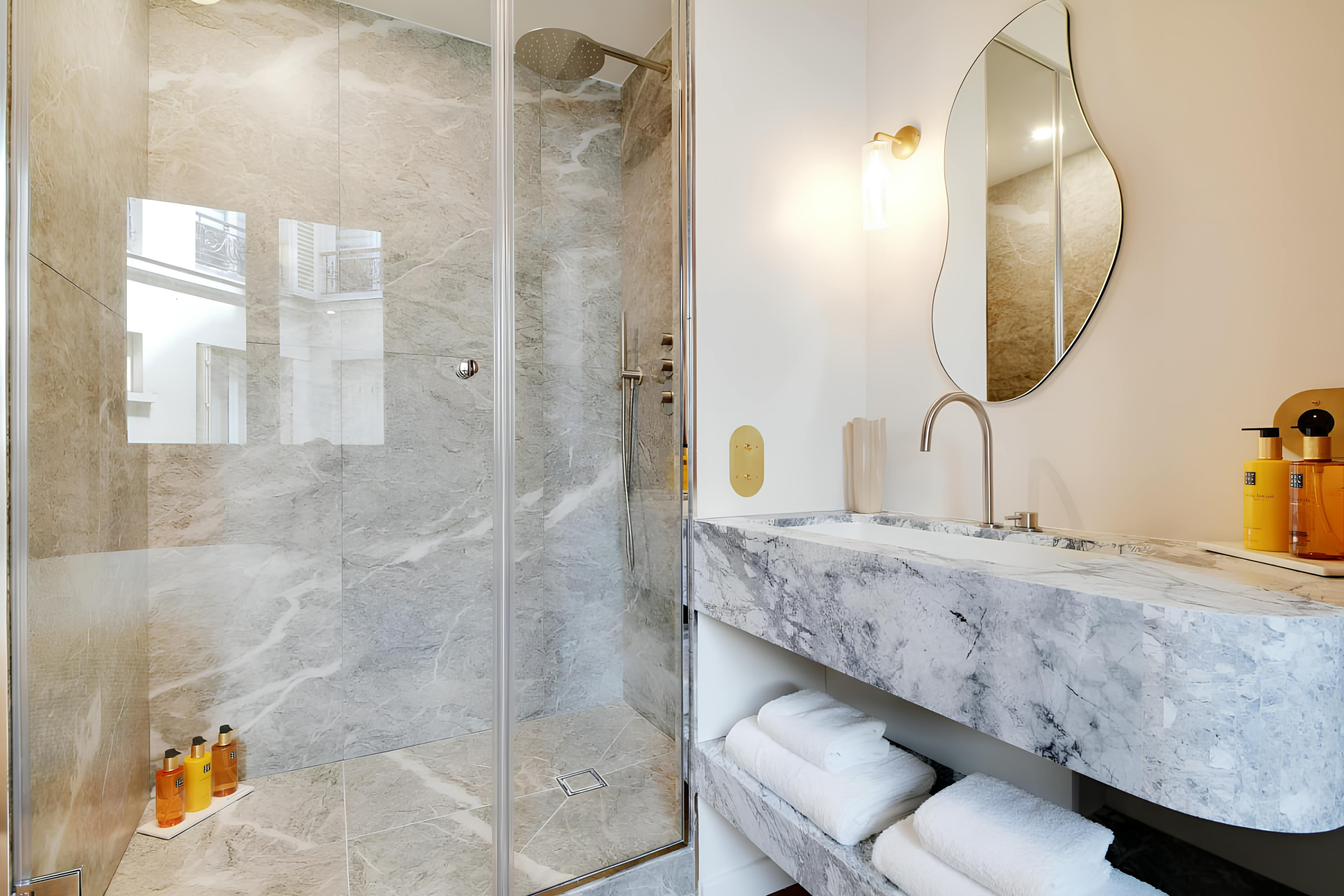 Step into a world of refined Parisian charm as you enter the spacious living areas of this elegant apartment. The open-plan design features a tastefully decorated living room where two guests can comfortably sleep on a plush sofa bed. Each bedroom is a sanctuary, complete with marble en-suites, ensuring privacy for all guests. For those balancing work and leisure, the dedicated desk spaces in each room provide the ideal setting for remote working. The modern kitchen is fully equipped, making it perfect for preparing delectable meals with local ingredients.
