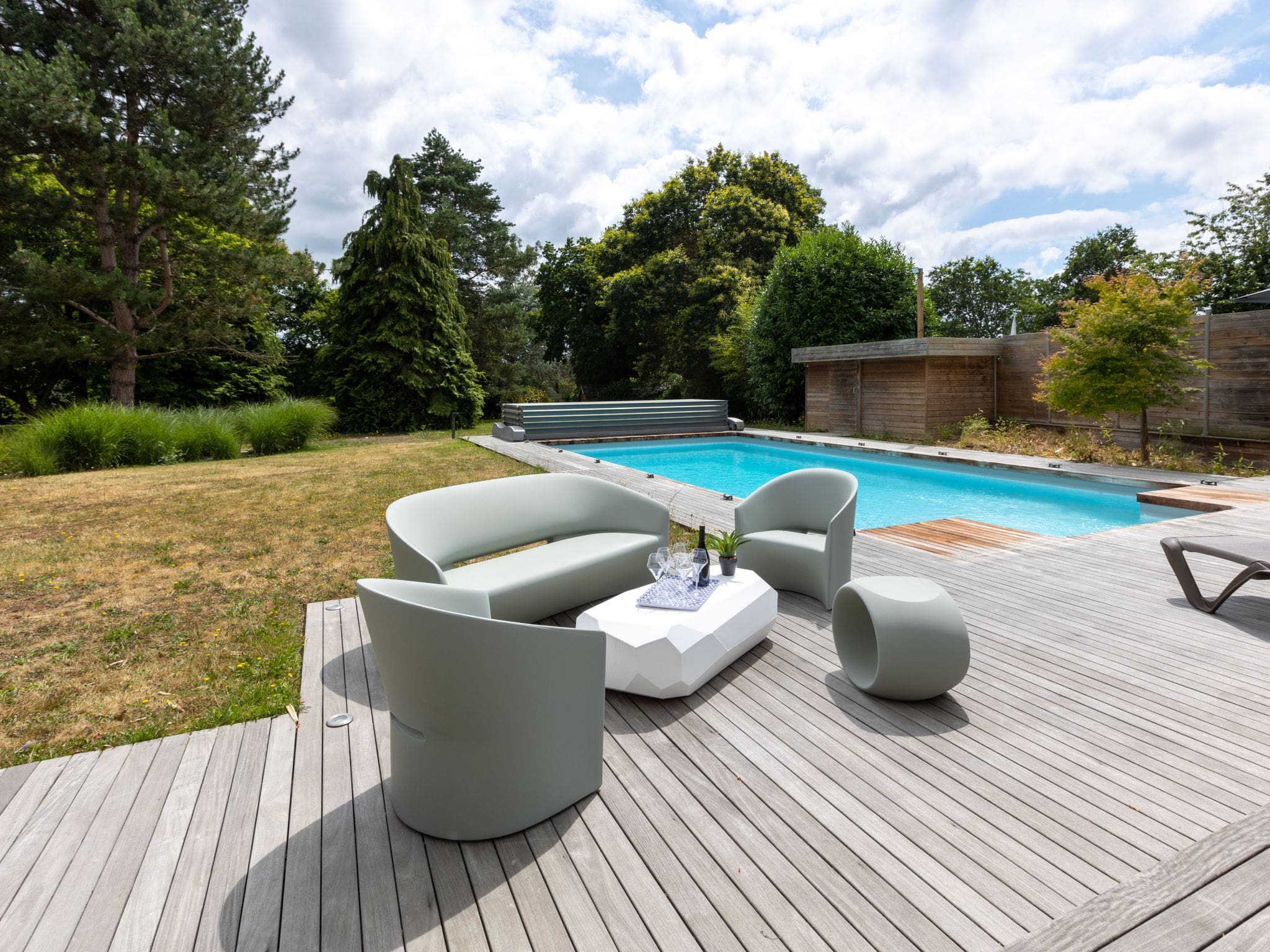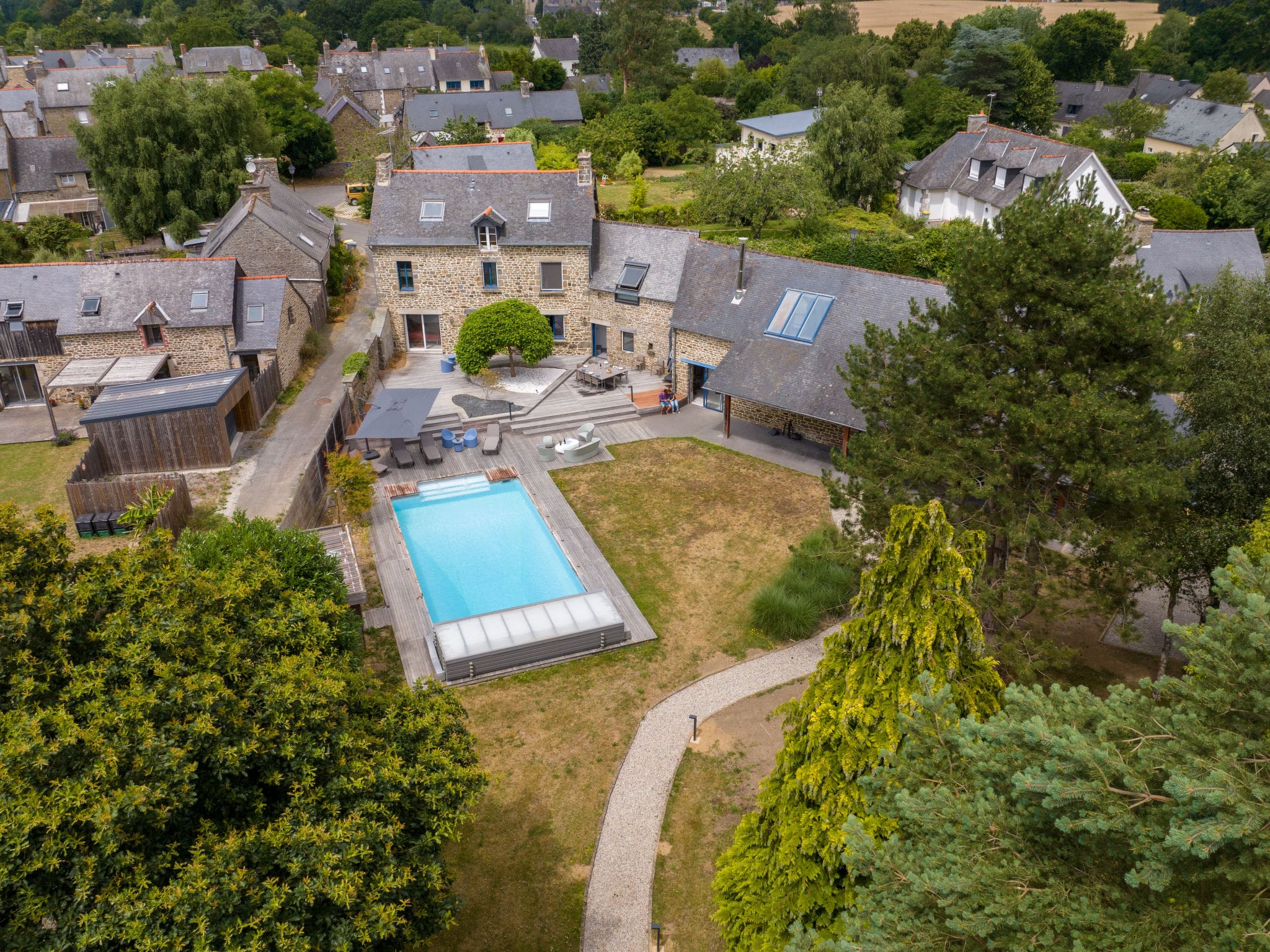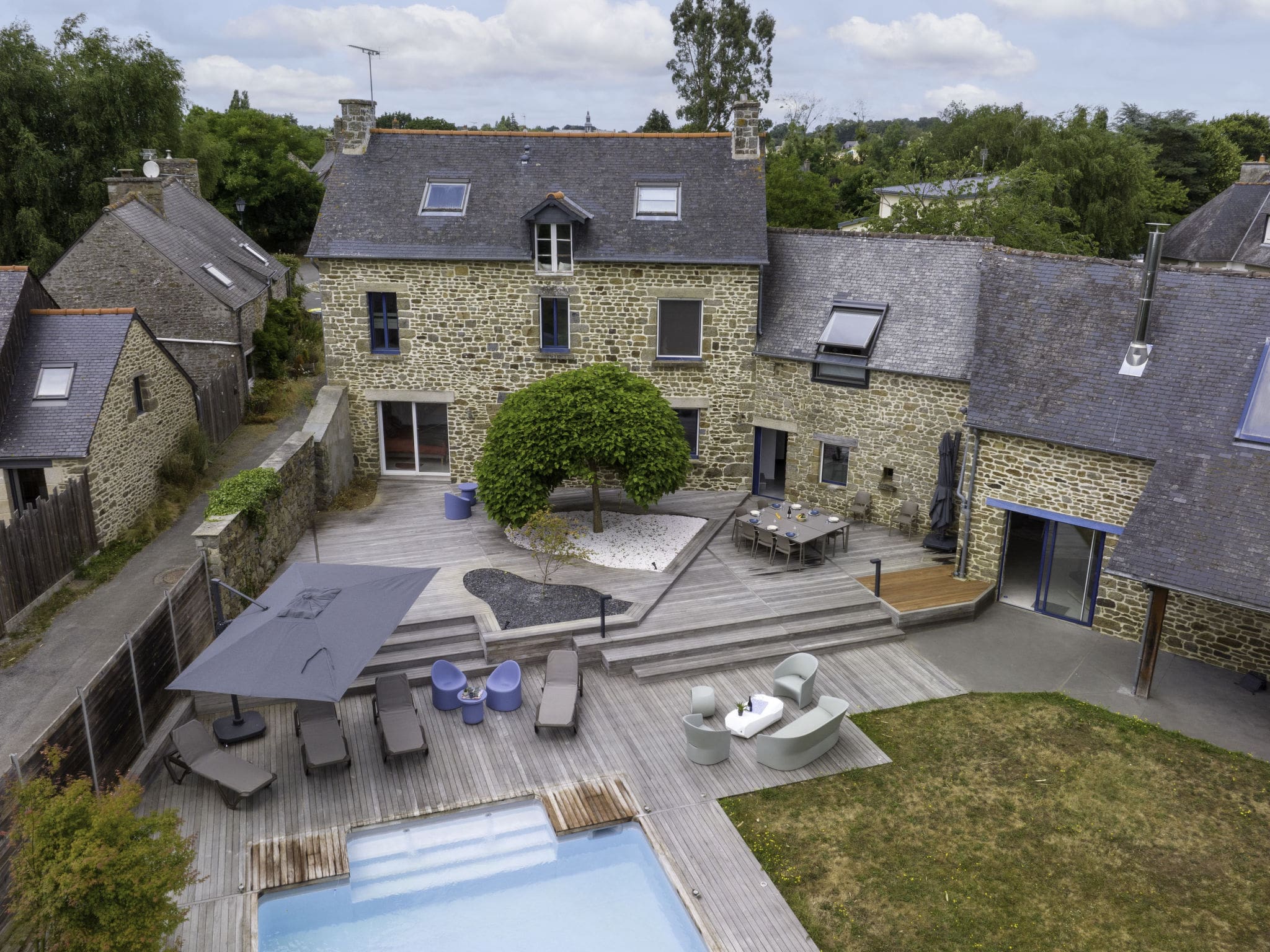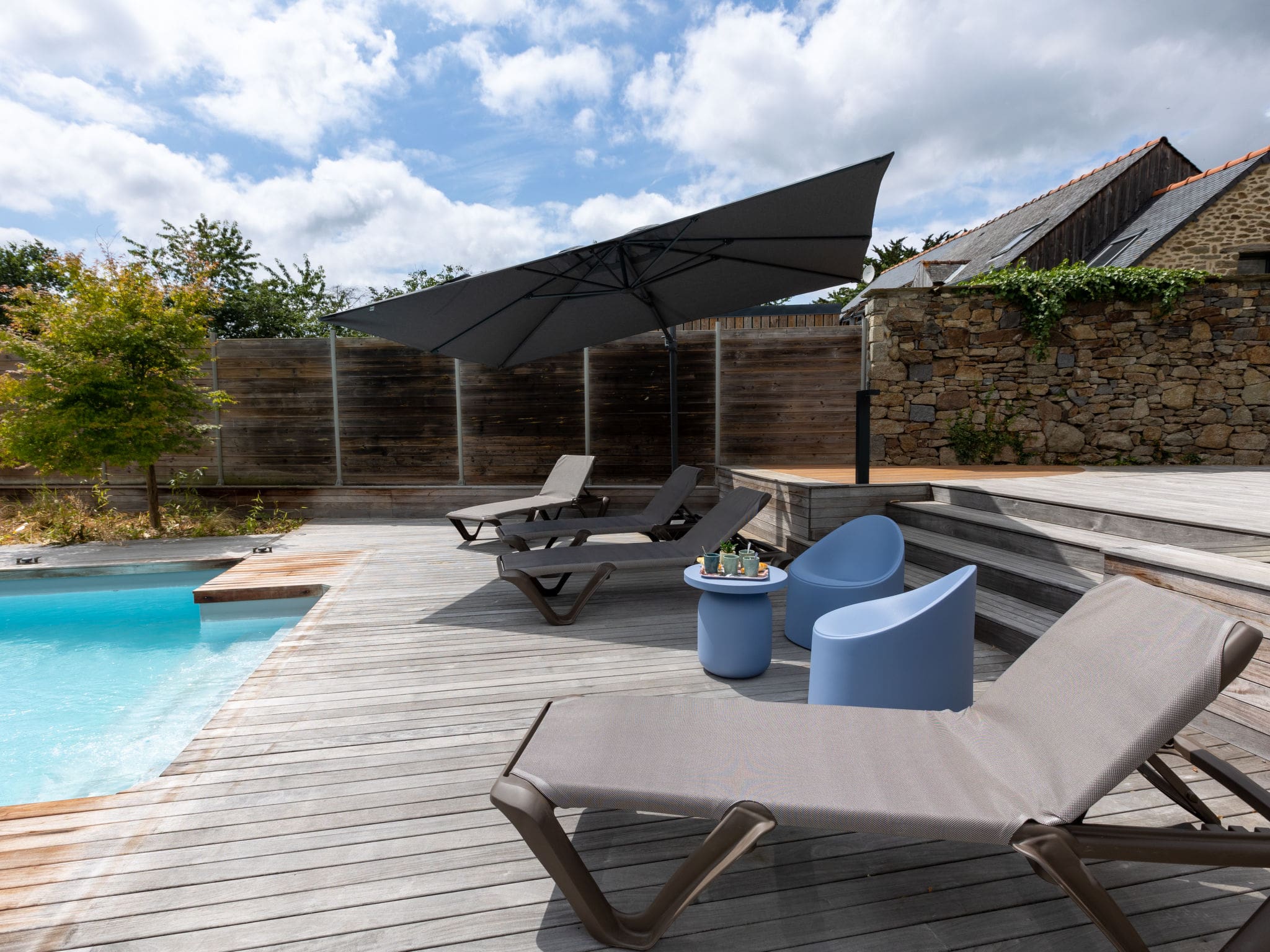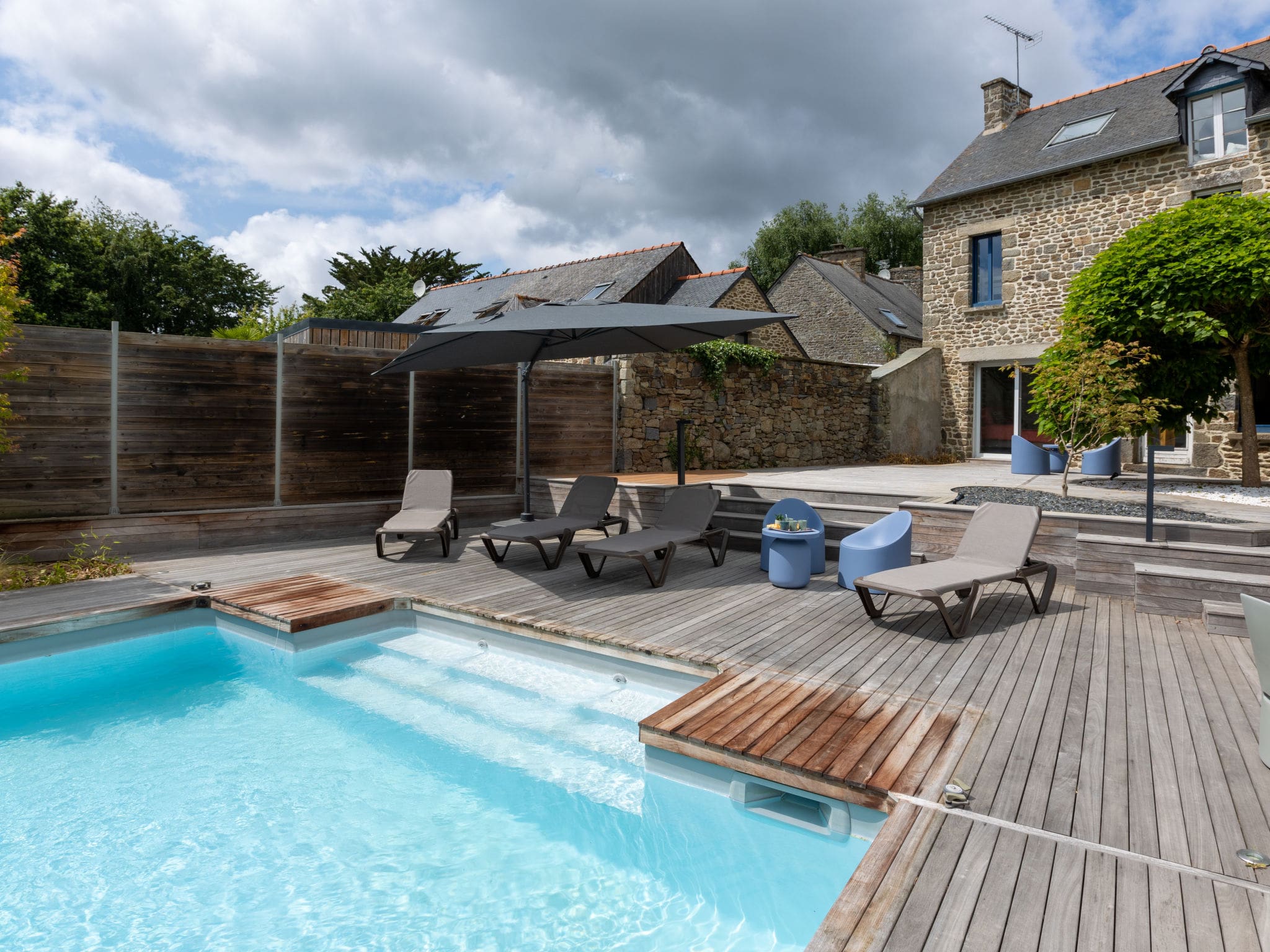The 800-square-meter fenced garden provides a private sanctuary surrounded by mature trees and landscaped lawns. The centerpiece is the angular swimming pool measuring 5 by 10 meters, available seasonally from May 15th through September 30th with professional maintenance included. Multiple terraces capture the south-facing position and sunshine throughout the day, furnished with comfortable outdoor seating and a barbecue for alfresco dining. The expansive grounds offer ample space for children to play safely while adults relax in the deck chairs or enjoy drinks on the terraces. Private parking accommodates four vehicles, essential for exploring the wider Brittany region.