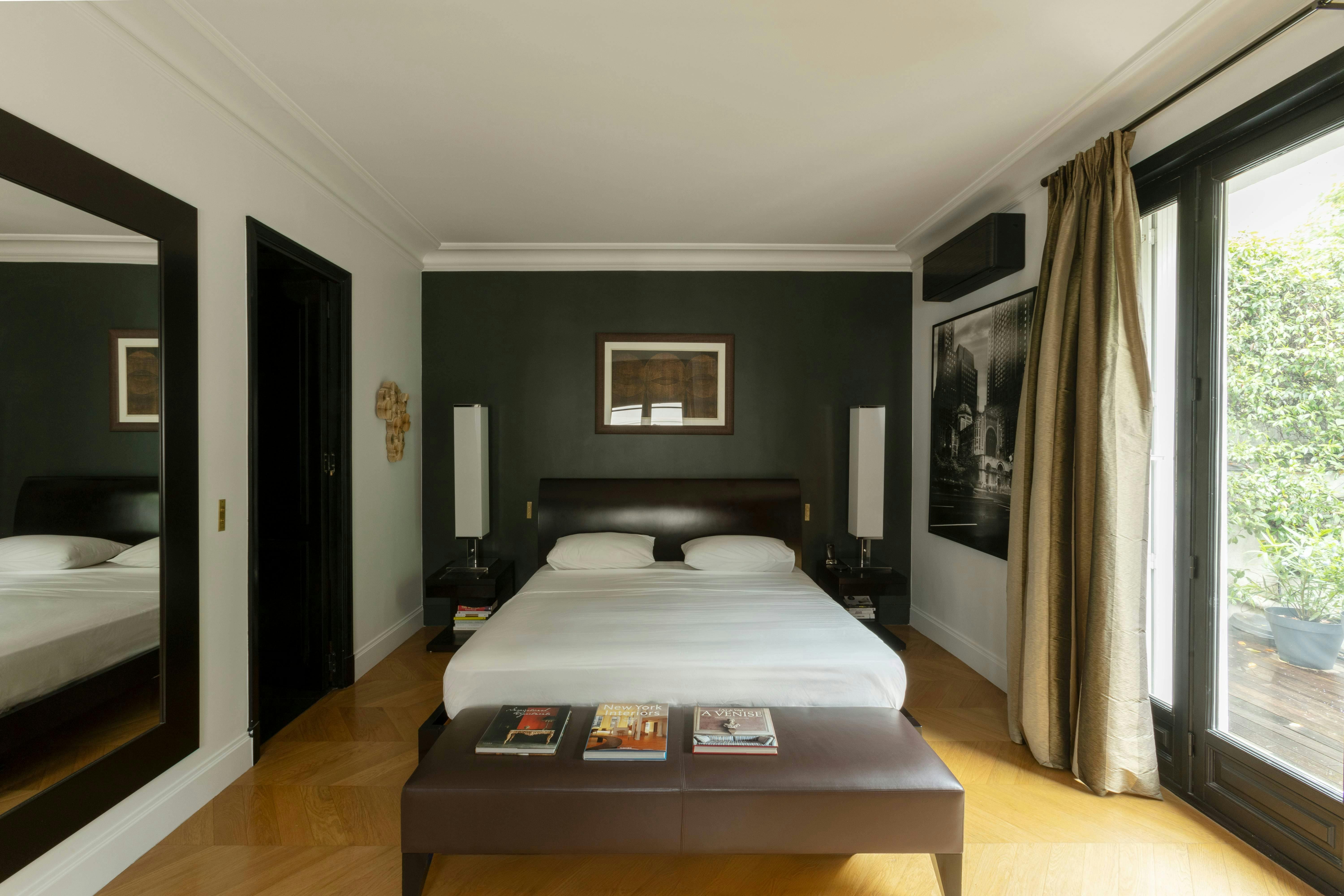 Step inside this beautifully designed two-bedroom apartment and be greeted by a harmonious blend of classic Parisian style and modern luxury. The spacious living area is perfect for relaxation, featuring plush seating and a dedicated workspace ideal for remote working. The dining area invites you to indulge in a meal crafted by a private chef, while the fully equipped kitchen offers all the amenities needed for culinary exploration. The master bedroom, overlooking a serene courtyard, boasts a walk-in closet and an en-suite bathroom, ensuring privacy and comfort.