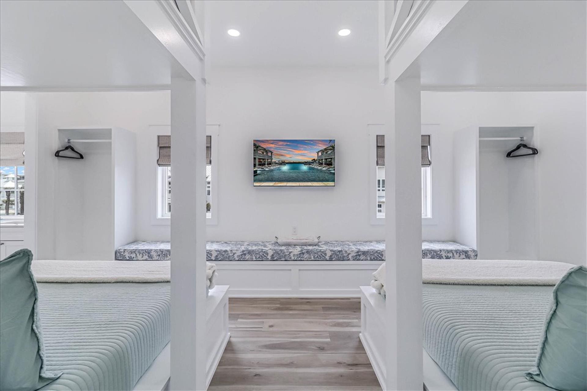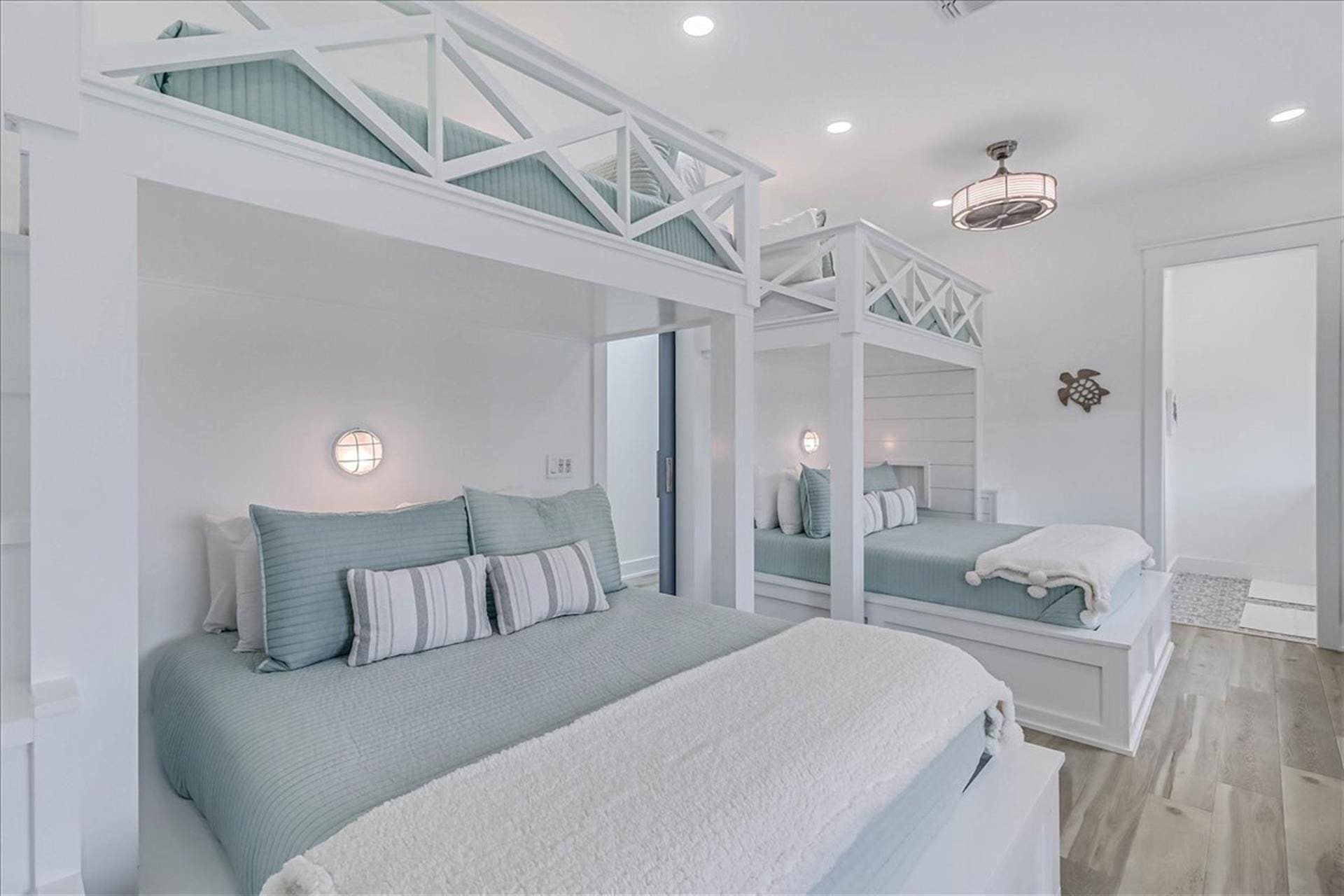 The interior showcases contemporary coastal design with expansive living spaces that maximize the stunning Gulf views. The open-plan living area features floor-to-ceiling windows, comfortable seating for 12 guests, and a fully equipped gourmet kitchen with premium appliances and granite countertops. Four thoughtfully appointed bedrooms include three traditional rooms and one unique bunk room featuring two custom bunk beds, each with a double bed below and single above, perfect for accommodating larger families. Each of the four bathrooms features modern fixtures and coastal-inspired finishes, while central air conditioning ensures comfort throughout your stay.