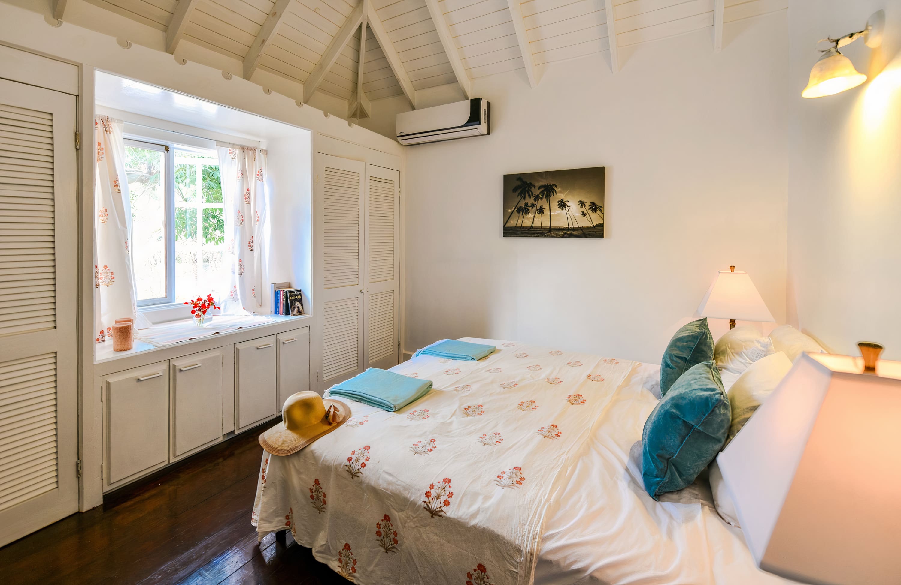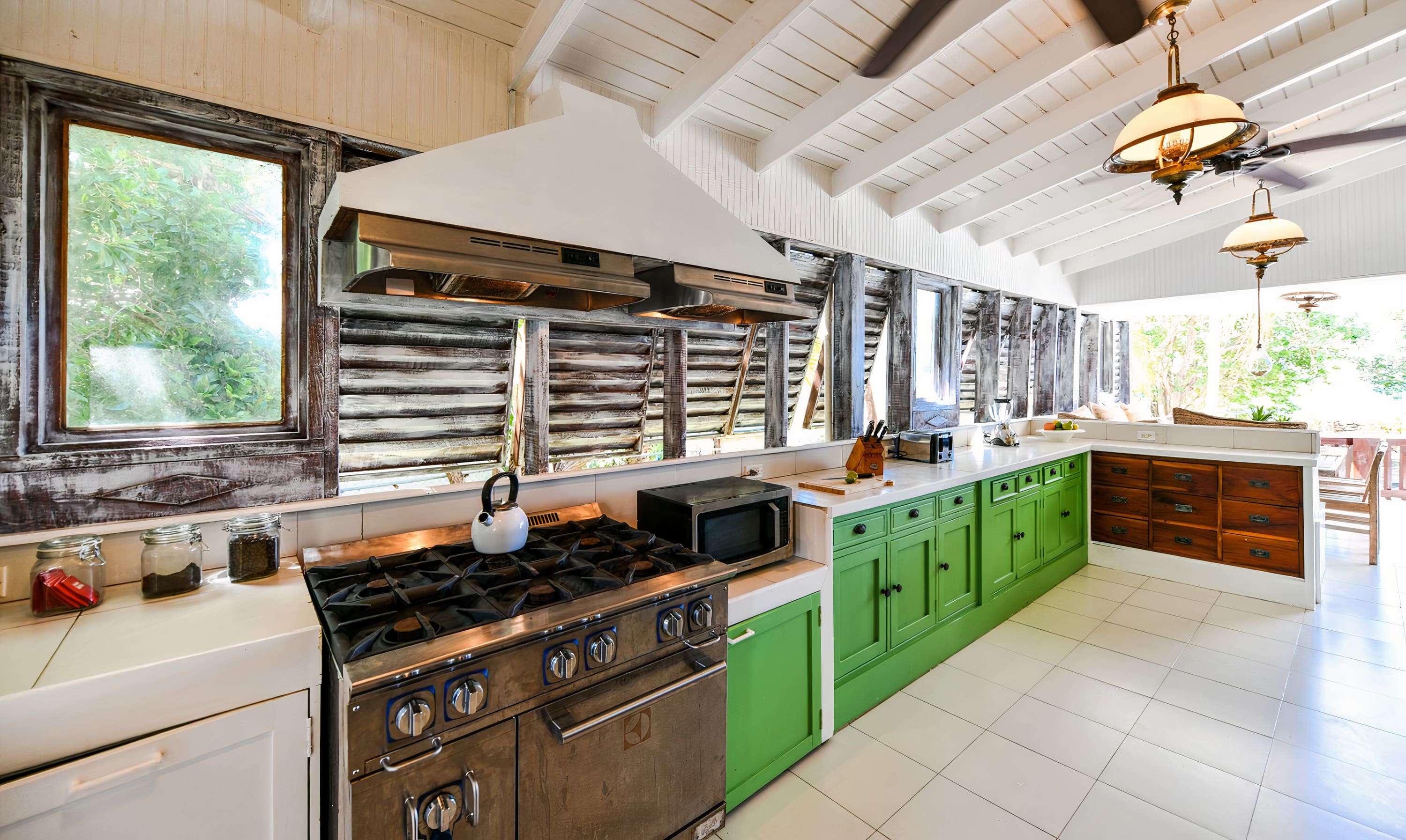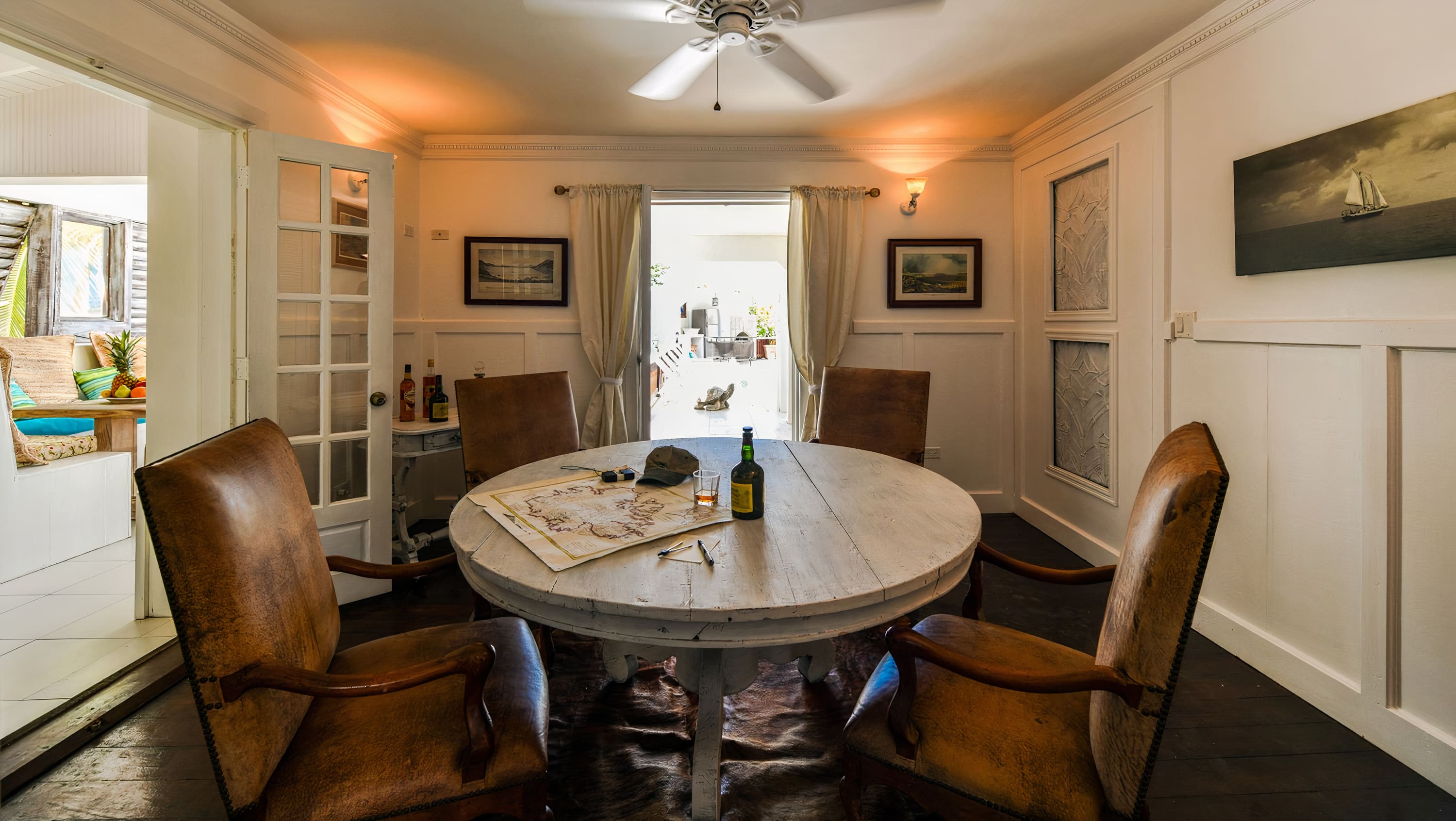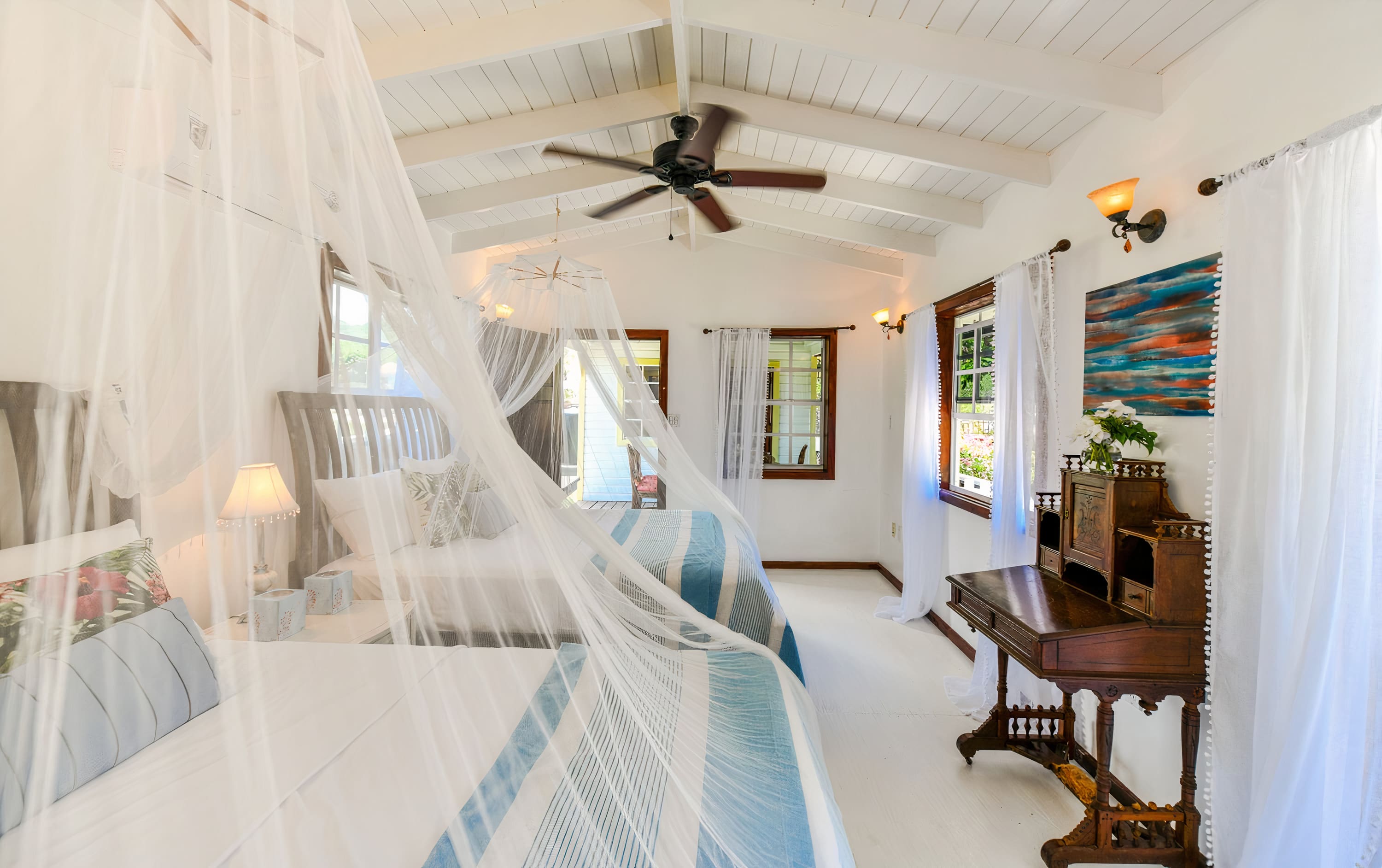The spacious interior showcases classic Caribbean colonial design with high ceilings, elegant furnishings, and abundant natural light throughout. The main house features four beautifully appointed bedrooms, each with ensuite bathrooms and air conditioning for ultimate comfort. The open-plan living areas flow seamlessly together, creating perfect spaces for gathering and relaxation. The fully equipped gourmet kitchen provides everything needed for preparing meals, while the separate dining area offers elegant indoor entertaining. Musical instruments are available for guests who enjoy creating their own entertainment during evenings at home.