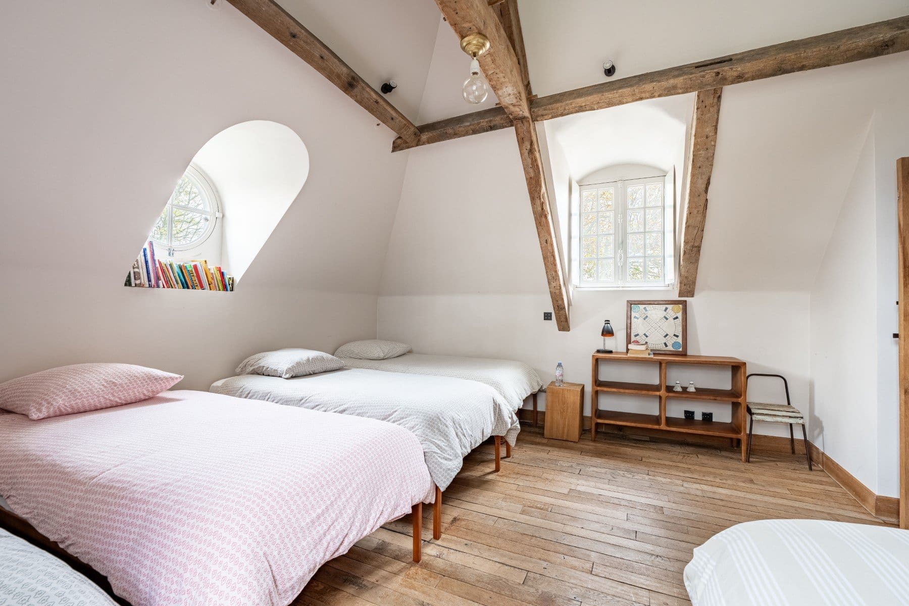 The main house showcases eight beautifully appointed bedrooms and seven bathrooms, each reflecting the property’s refined character through carefully preserved original features and thoughtful modern updates. Reception rooms flow seamlessly from one to another, with tall windows flooding the spaces with natural light and offering views across the manicured gardens. The heart of the home features a fully equipped gourmet kitchen perfect for entertaining, while comfortable living areas provide intimate spaces for relaxation. One bedroom uniquely accommodates five guests on individual beds, making it ideal for younger family members or friends sharing accommodation.
