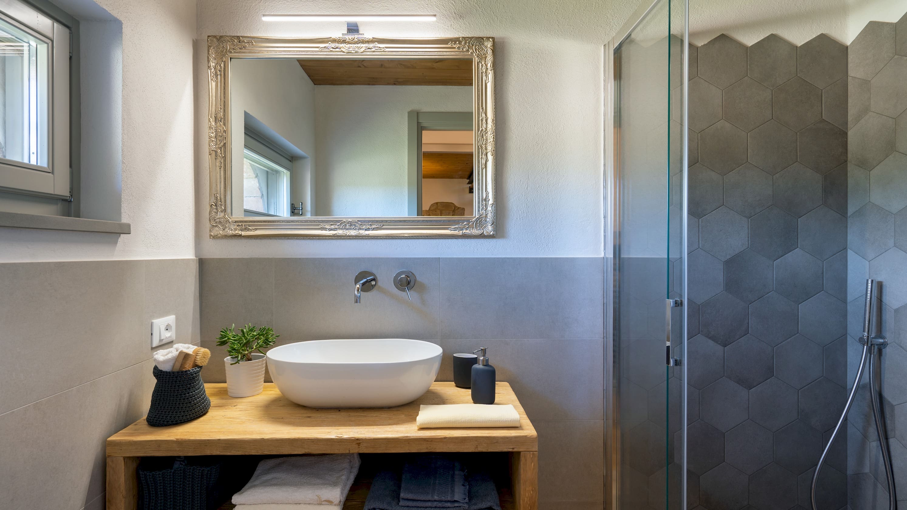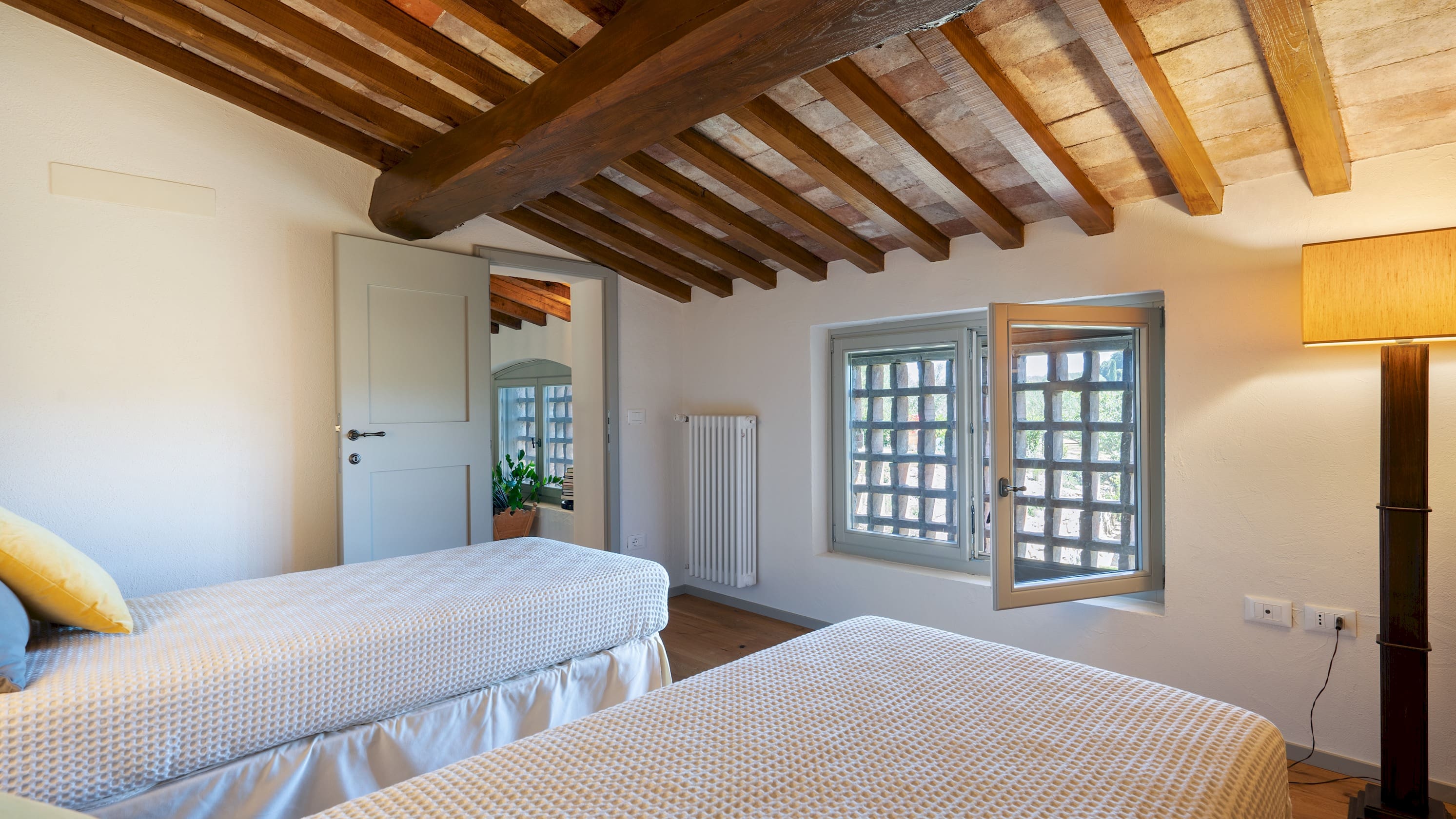 This two-storey apartment captures the essence of Italian farmhouse style, featuring original windows and tall beamed ceilings. The living area is a harmonious blend of traditional and contemporary decor, offering a cozy space for relaxation. The kitchen is fully equipped for all your culinary adventures, while the dining table doubles as a convenient workspace. The apartment includes two beautifully appointed bedrooms, with the second bedroom featuring twin beds that can be combined upon request, ensuring flexibility for families or groups.