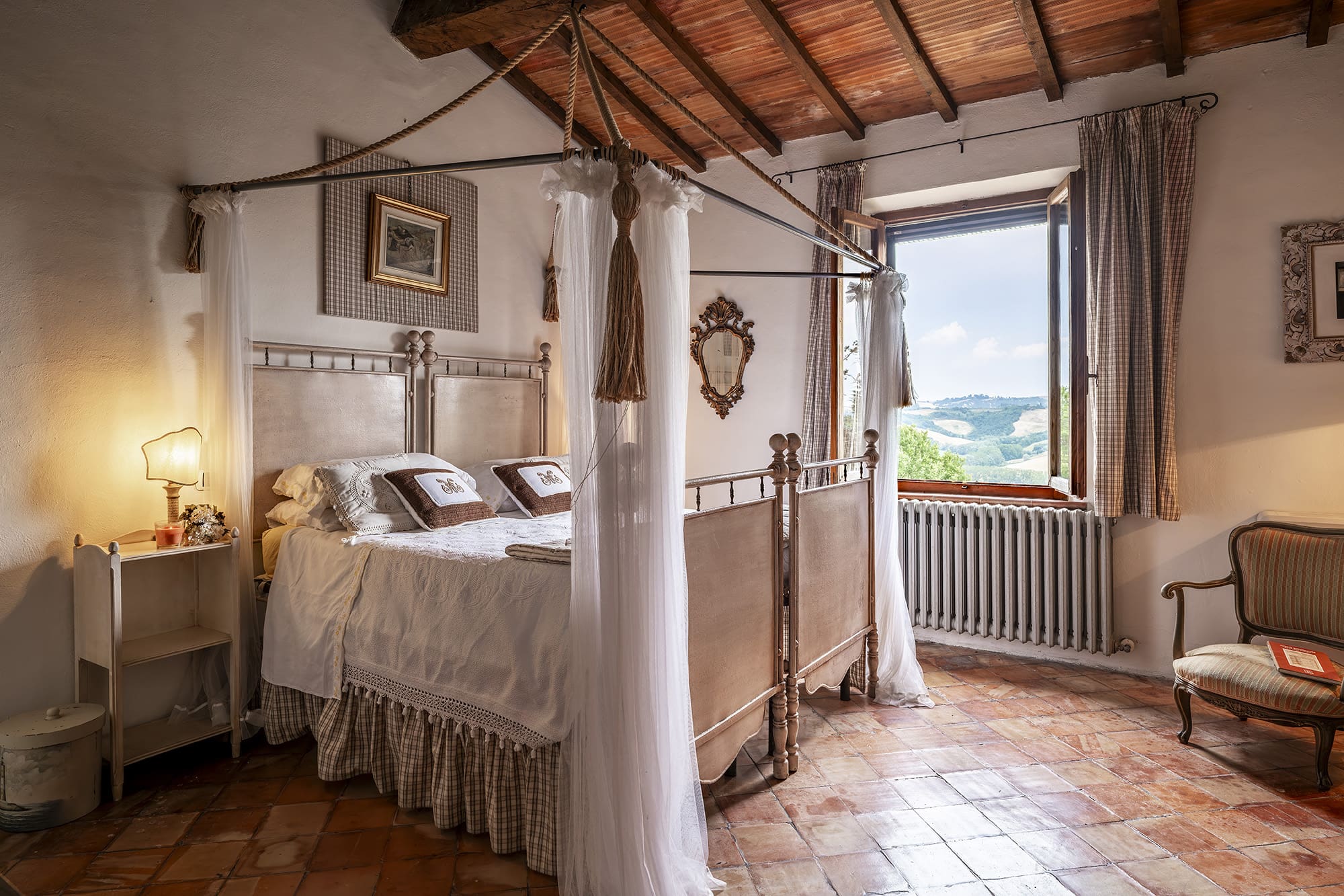 As you step inside Fattoria Crete Senesi, you’ll be greeted by spacious interiors that blend traditional Tuscan architecture with contemporary style. The villa is set across two levels, connected by two internal staircases, offering ample room for relaxation and entertainment. The six elegantly appointed bedrooms can accommodate up to 12 guests, with the flexibility to arrange two of the double bedrooms as twin rooms upon request. The living areas are designed for comfort and socializing, featuring plush furnishings, open spaces, and an abundance of natural light. While the fireplaces are ornamental, they add a touch of historical charm to the ambiance.