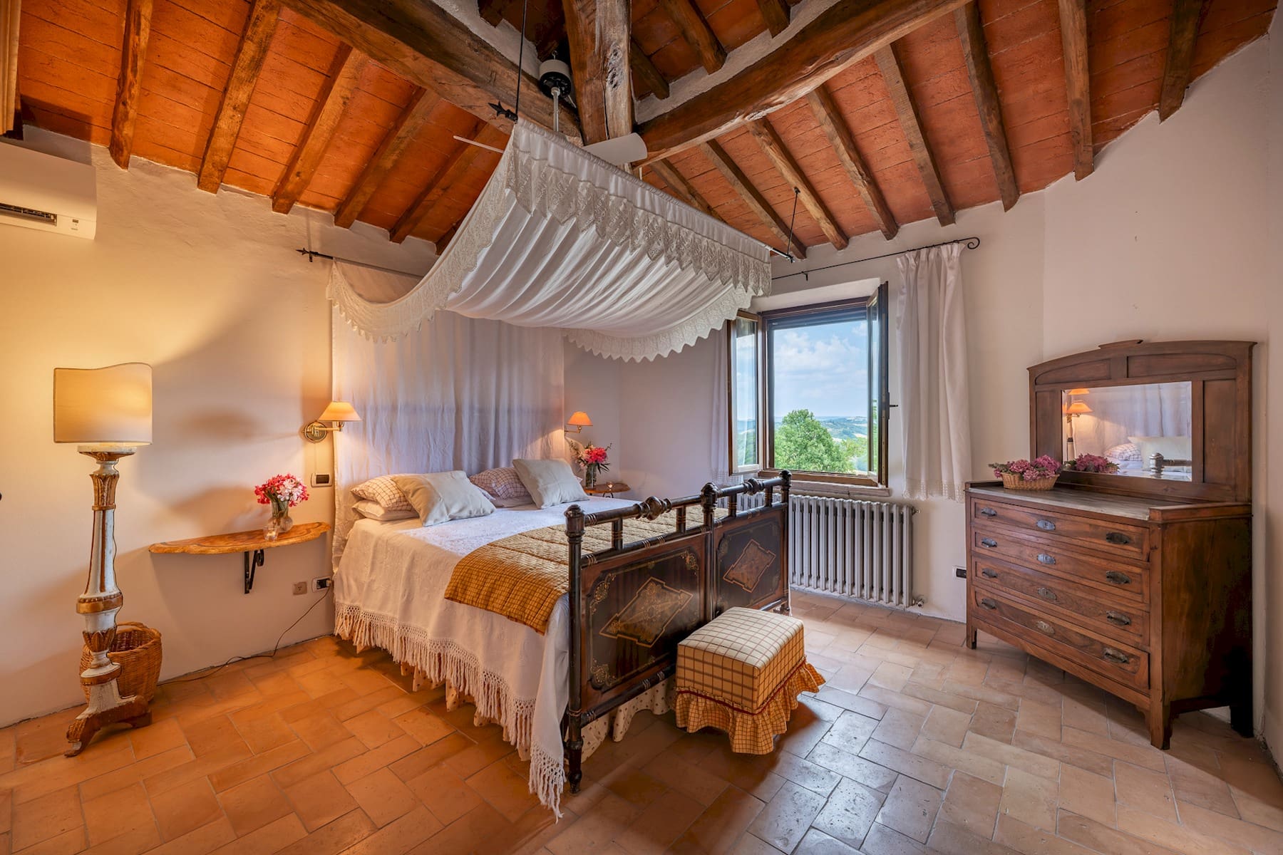 Surrounded by the breathtaking beauty of the Crete Senesi region, the villa’s outdoor spaces offer a serene escape. Enjoy leisurely afternoons by the swimming pool, available from the last Saturday of April to the first Saturday in October. The expansive gardens and terraces provide a perfect backdrop for al fresco dining, with a stone BBQ and shaded pergola for meals under the stars. The villa’s private tennis court invites guests to indulge in some friendly competition while soaking in the stunning Tuscan vistas.