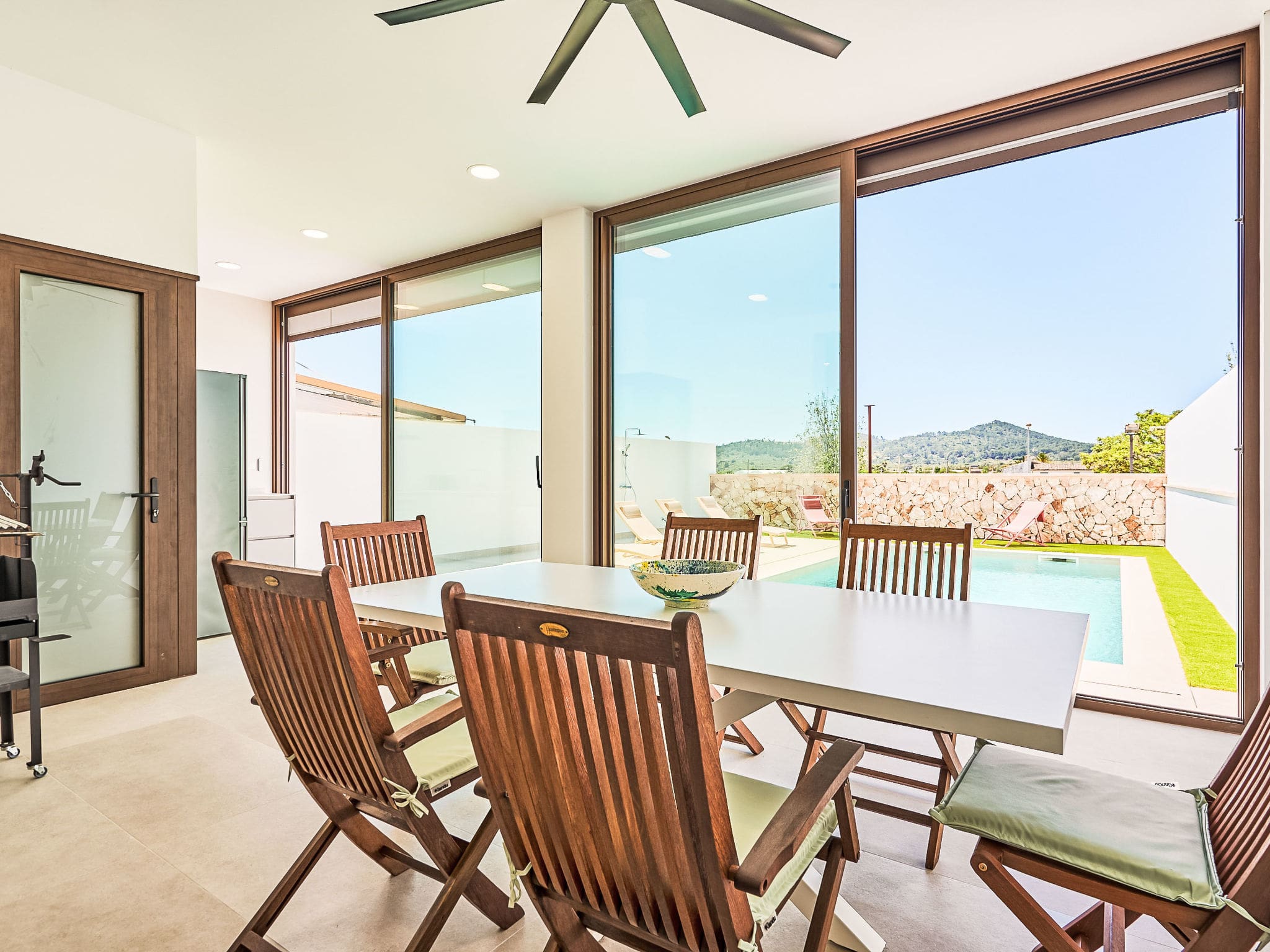 This luxury villa rental in Porreres, Mallorca offers an authentic Mallorcan experience in the heart of the island’s charming agricultural landscape. Set on a private 140m² fenced plot just 400 meters from Porreres town center, this beautifully appointed villa combines modern comfort with traditional island living, making it perfect for families and groups seeking tranquility without sacrificing convenience.