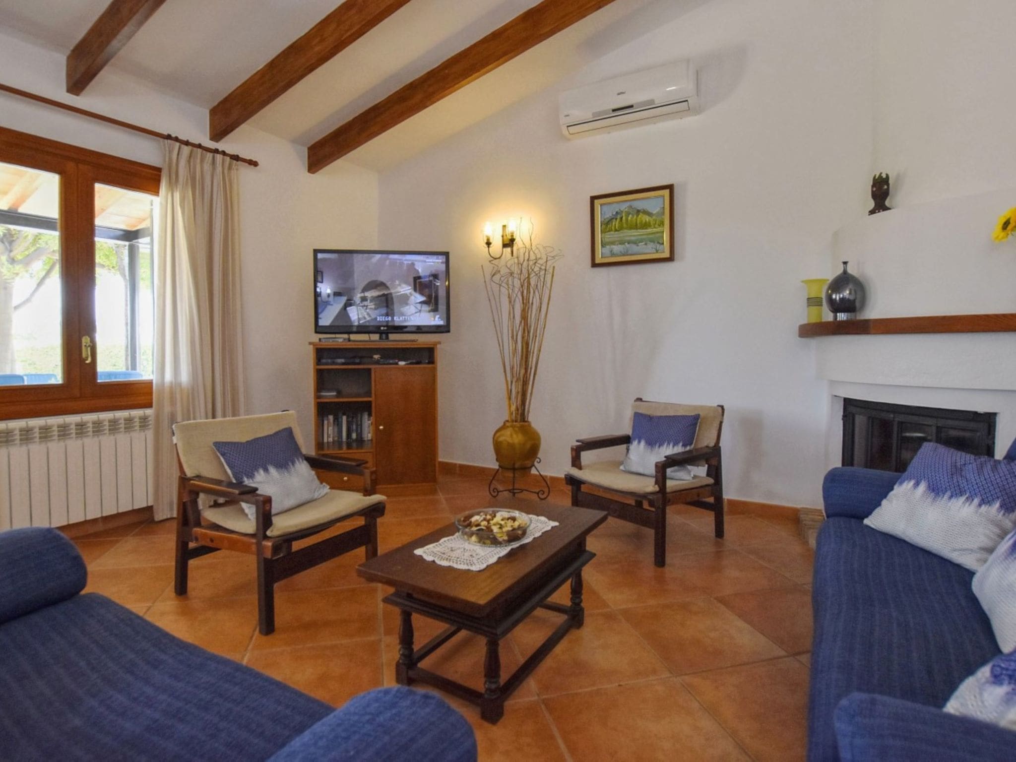 Two comfortable double bedrooms provide restful accommodation, each furnished with twin beds that can be arranged to suit your group’s needs. The property features two well-appointed bathrooms, including one with a luxurious bathtub for relaxing after days spent exploring the island. Air conditioning throughout ensures comfort during the warmer months, while the cosy fireplace provides warmth when needed.