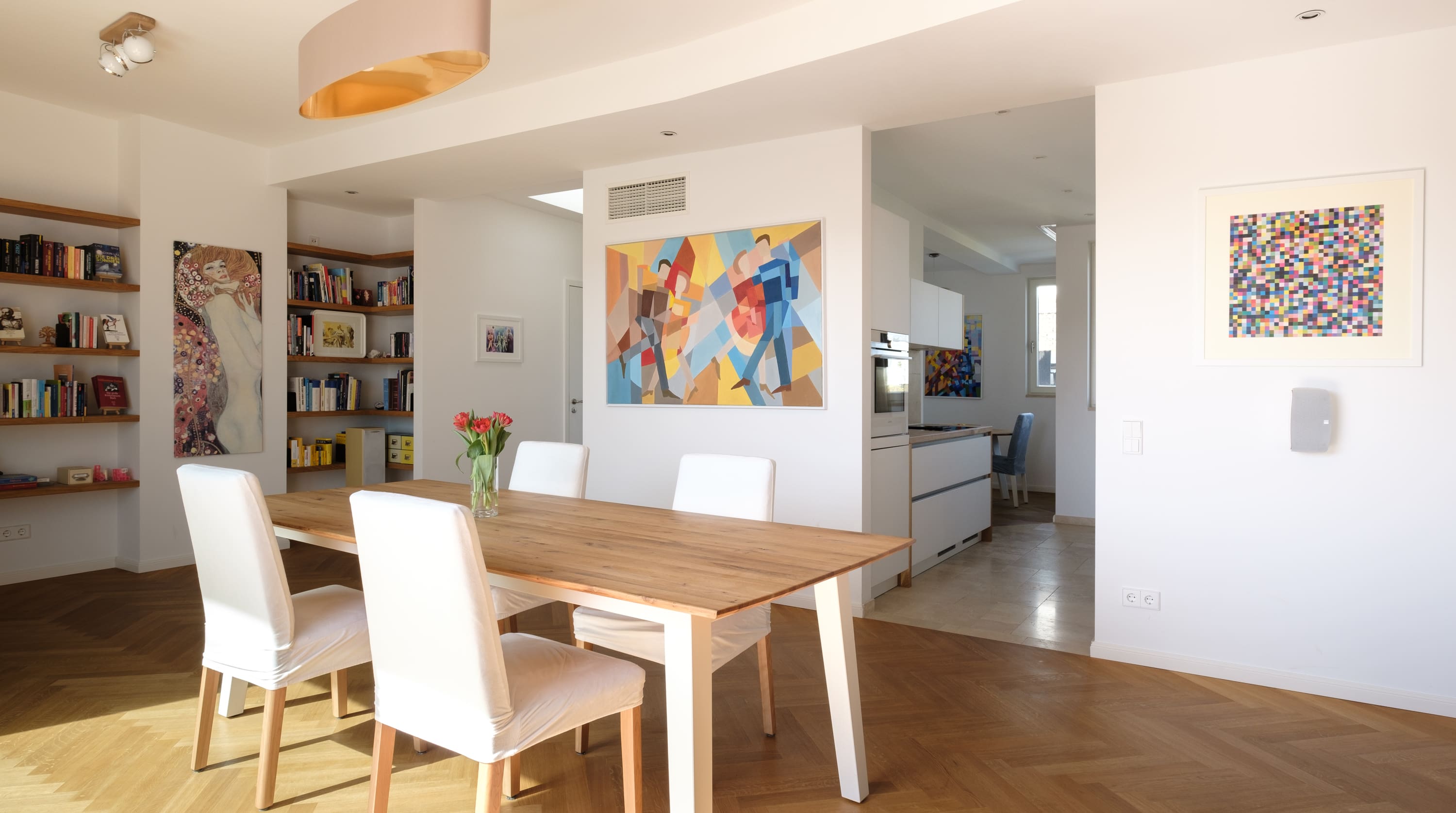 Step into a world of sophistication as you enter the open-plan living space, designed with a modern loft-style aesthetic. The apartment features oak parquet floors, white walls, and large south-facing windows that fill the rooms with natural light. The living area is adorned with vibrant artwork and stylish decor, creating a warm and inviting atmosphere. The fully-fitted kitchen boasts high-end appliances, perfect for preparing gourmet meals at home. The master bedroom offers a king-sized bed and ensuite bathroom, while the second bedroom can be configured as twin beds or a queen-sized bed upon request. A dedicated office space equipped with a laser printer is ideal for those needing to work during their stay.