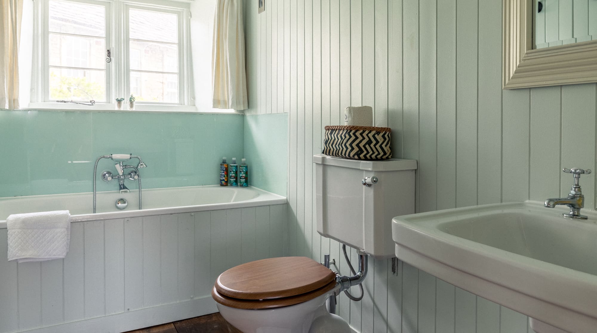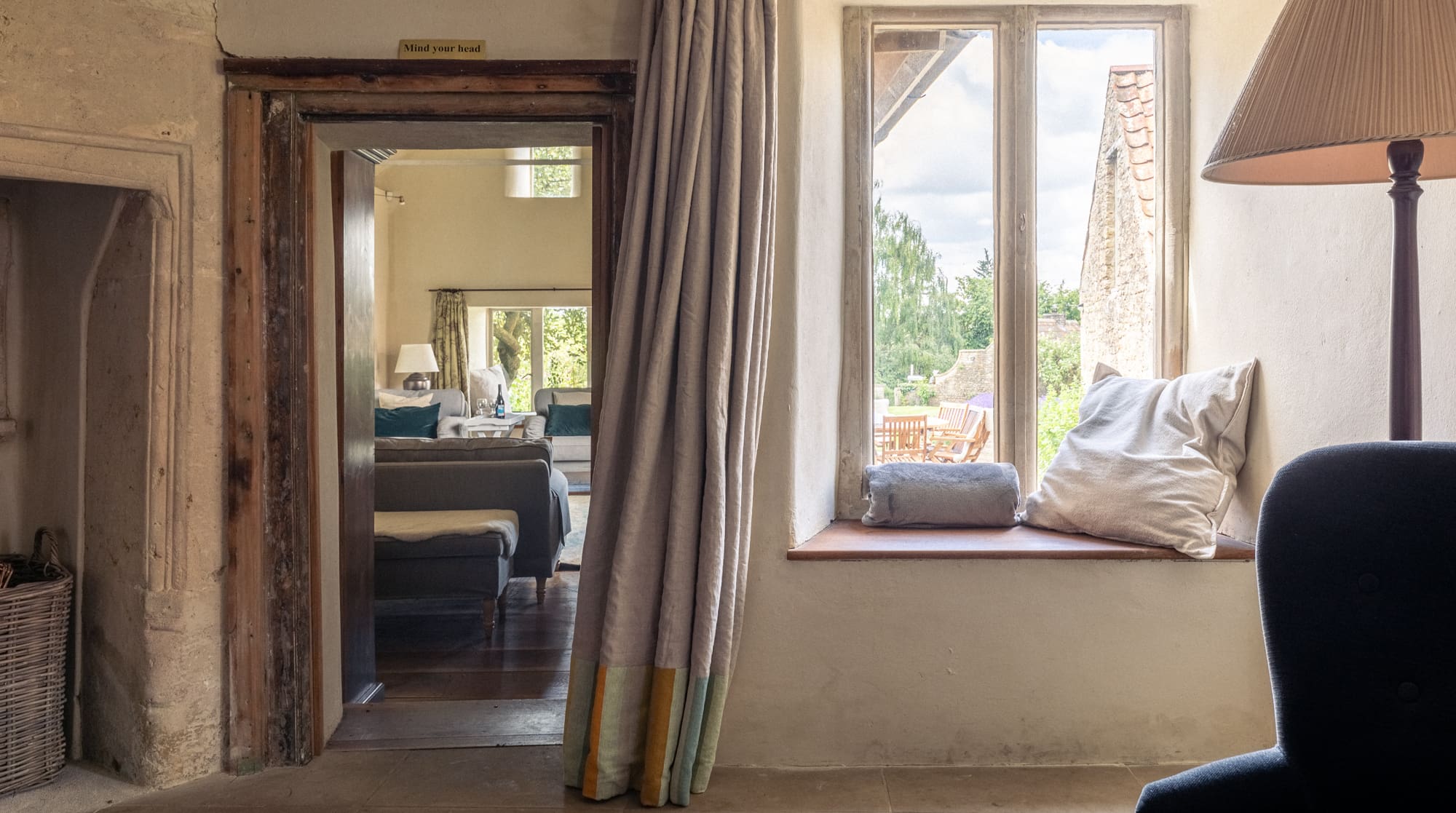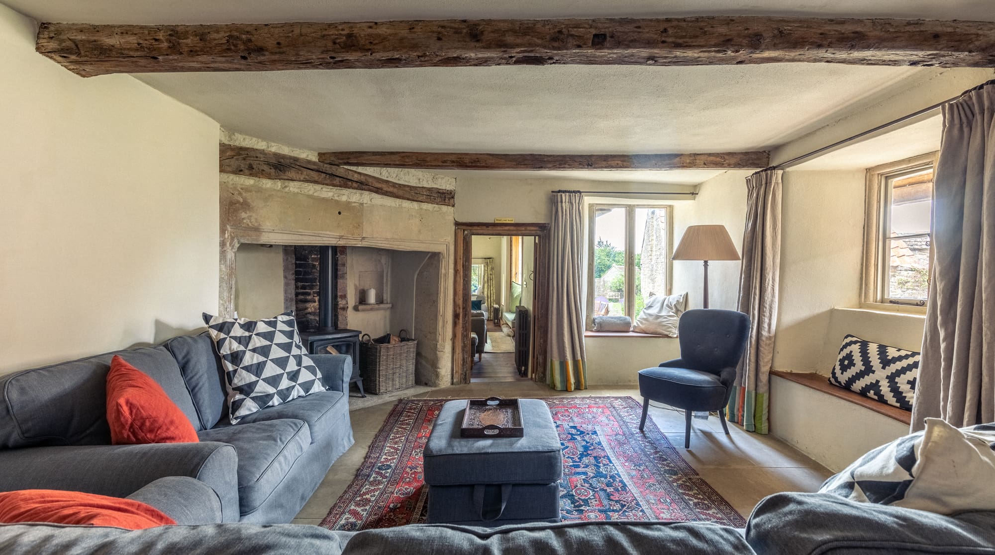 The interior seamlessly blends historical authenticity with modern sophistication across seven thoughtfully appointed bedrooms and four stylish bathrooms. Wind your way up the charming turret staircase with rope bannisters, discovering original fireplaces and exposed beams at every turn. The handcrafted kitchen features premium appliances and ample space for group cooking, while plush sofas in the living areas invite relaxation beside crackling fires. Each bedroom tells its own story, with several featuring zip-and-link beds that can be configured as super king beds or twin singles to suit your group’s needs. A peaceful window seat overlooks expansive green playing fields and the village church, creating the perfect reading nook.