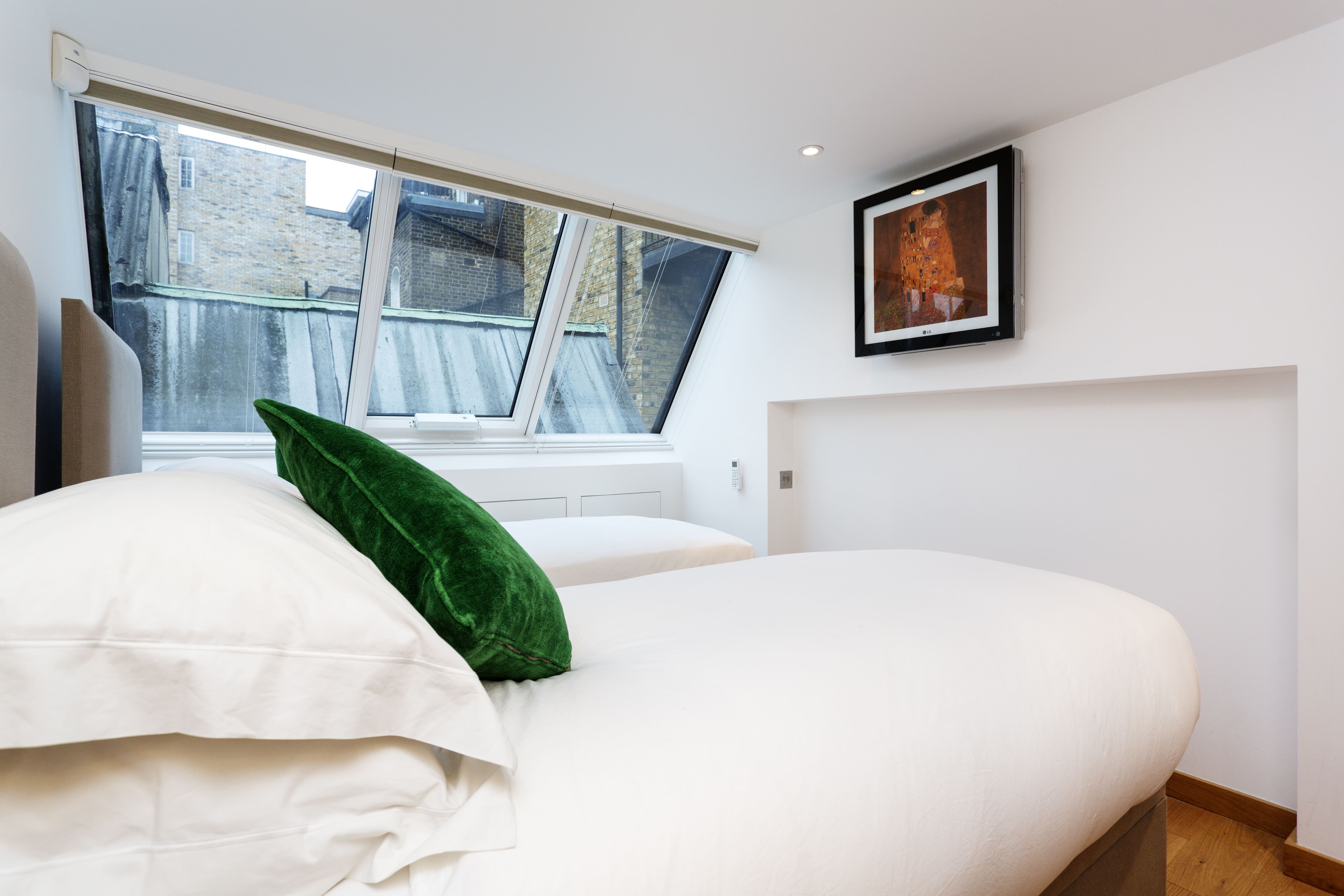 A: The apartment includes air-conditioning, Sonos music system, and electric blinds among other luxury amenities.