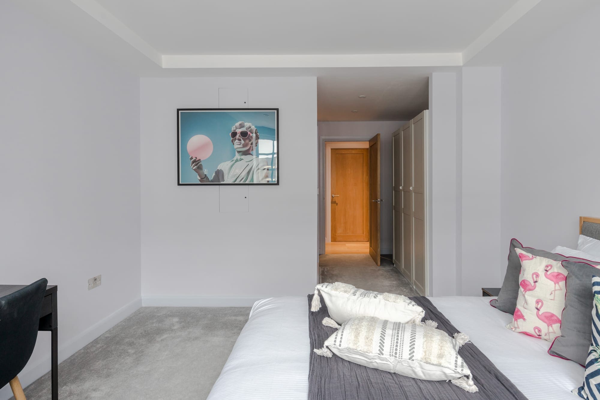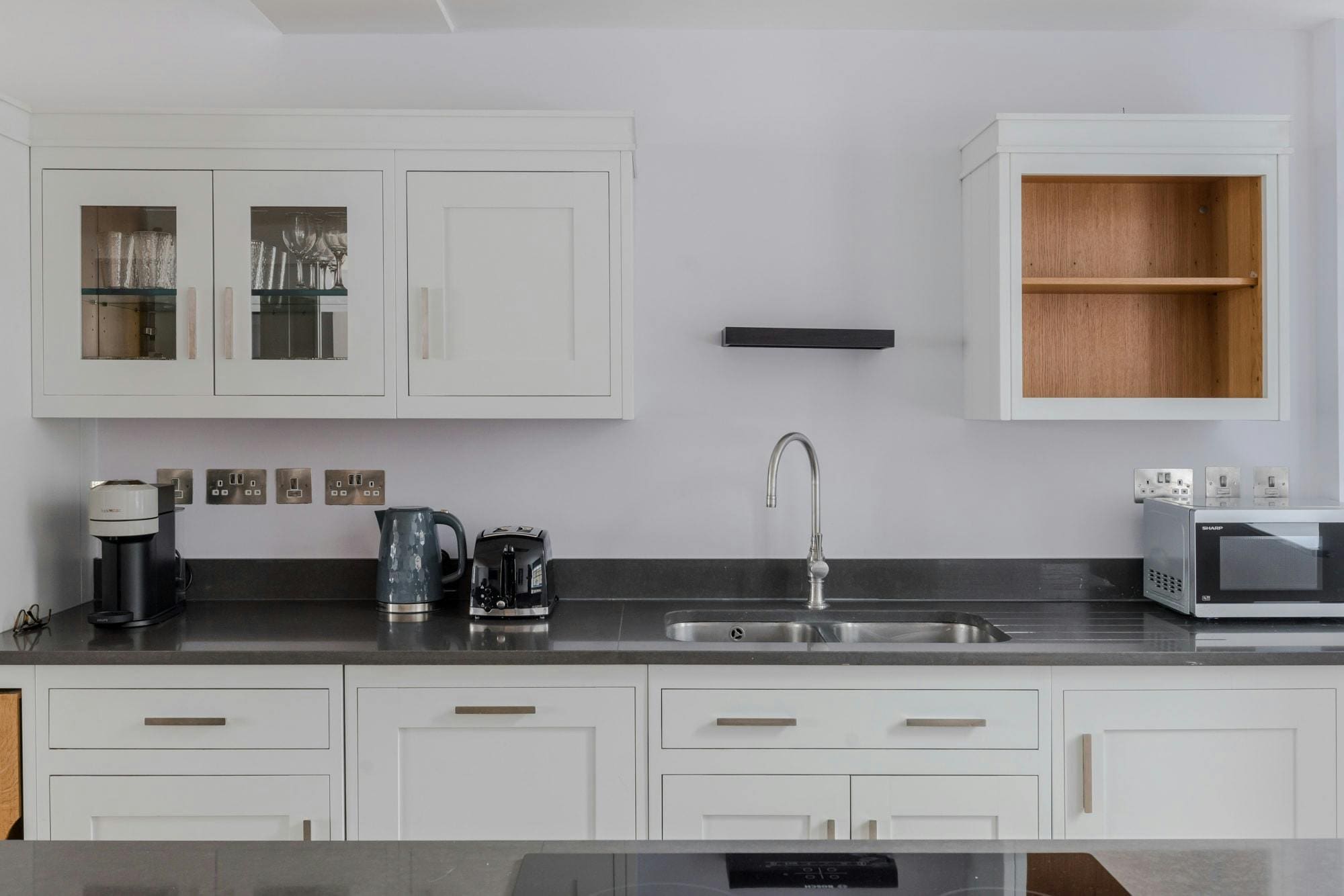 Step into a world of refined interiors where contemporary design meets timeless charm. The expansive living room is a sanctuary of comfort, featuring a plush, oversized sofa and a large flat-screen TV, ideal for unwinding after a day exploring London. The fully equipped kitchen is a culinary enthusiast’s dream, complete with state-of-the-art appliances and all the essentials for creating delightful home-cooked meals. Each of the three well-appointed bedrooms offers ample storage and serene aesthetics, ensuring restful nights for every guest.