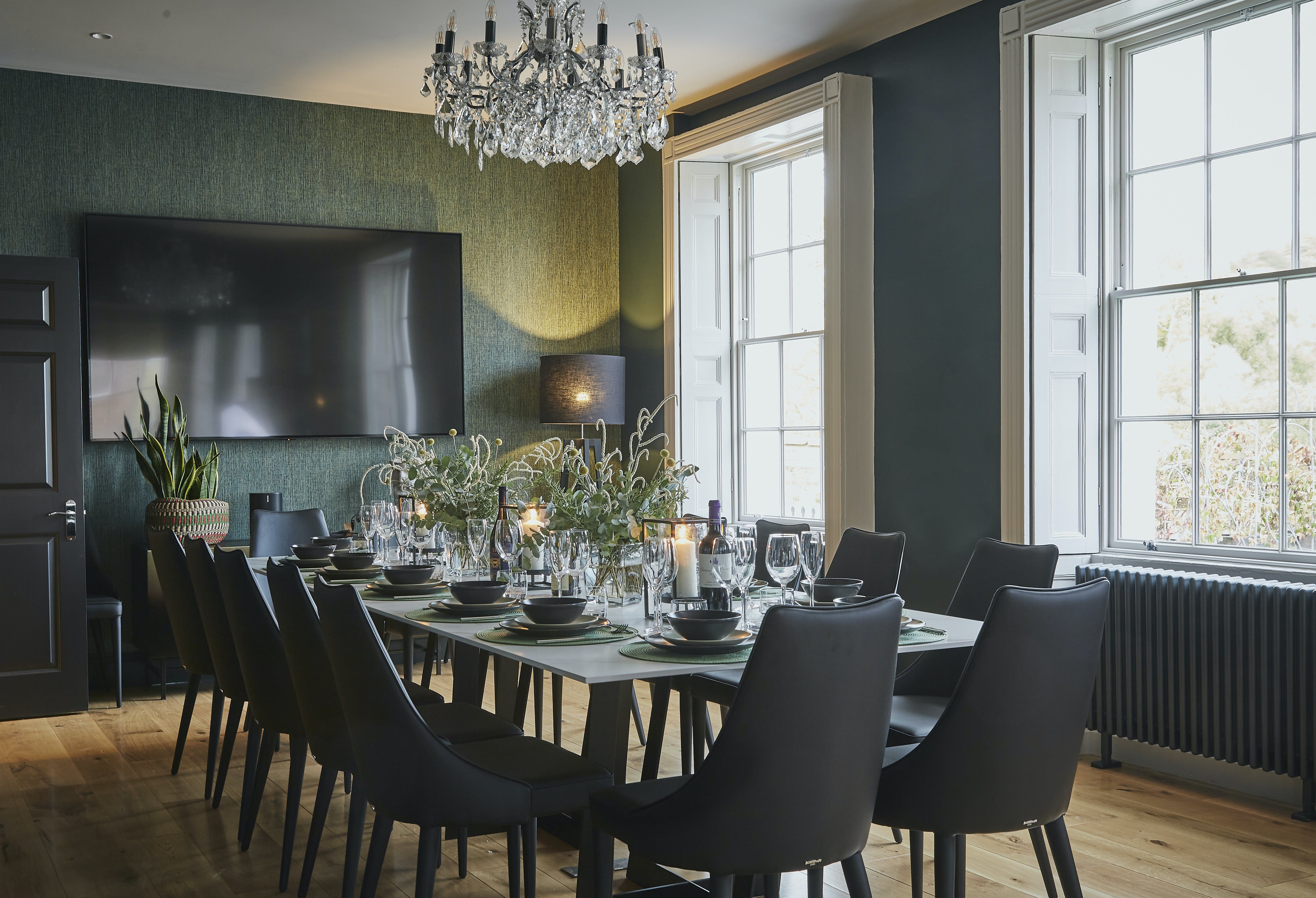 The interior of this luxury house rental in Liverpool exudes sophistication, with tall windows and high ceilings that create a sense of grandeur. The contemporary design seamlessly blends with classic elements like chandeliers and wood-panelled bookshelves. The state-of-the-art kitchen and inviting living room with a cozy fireplace are perfect for gatherings. With seven bedrooms, four of which offer flexible zip and link beds, this house accommodates up to 16 guests comfortably.