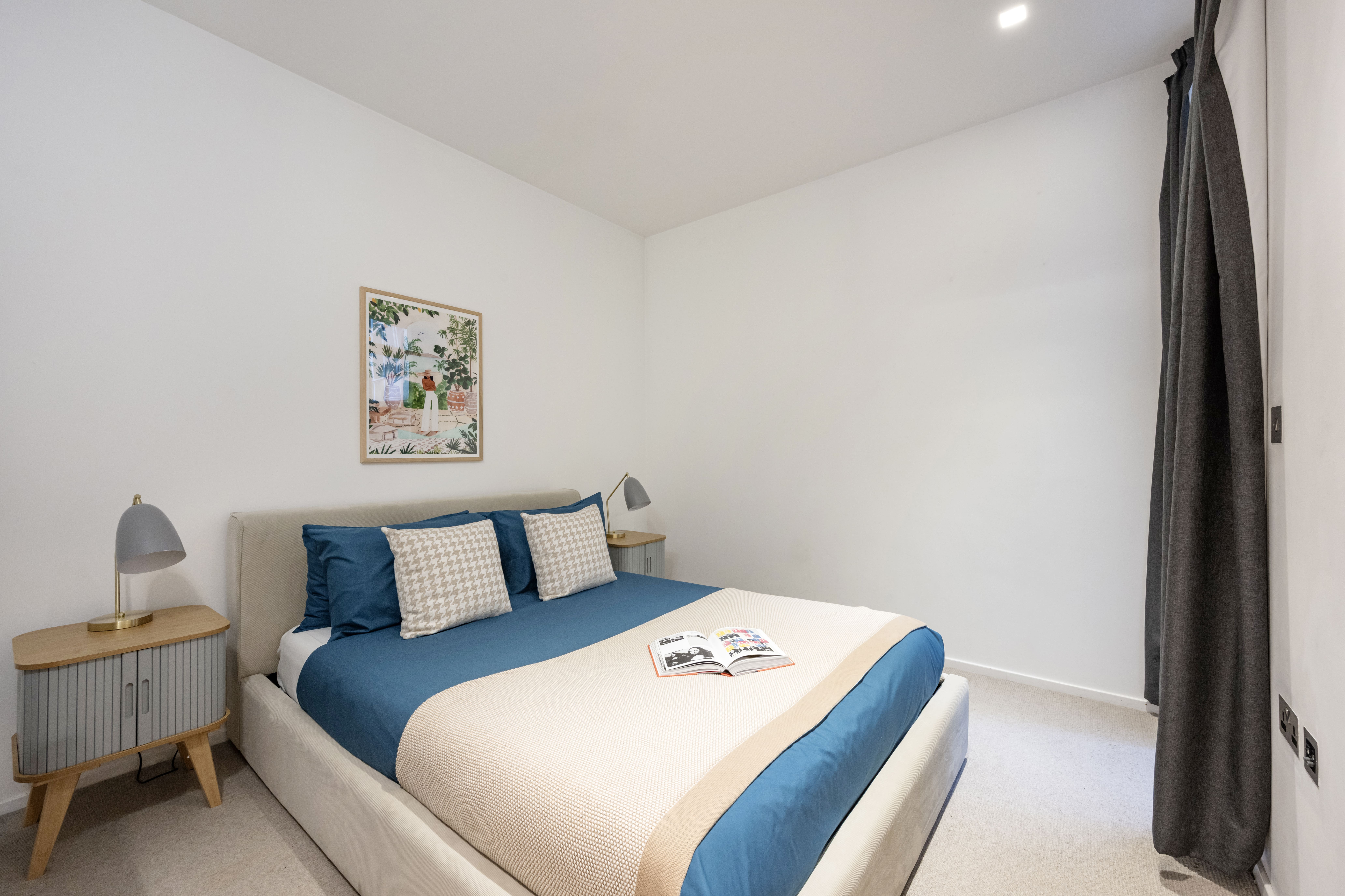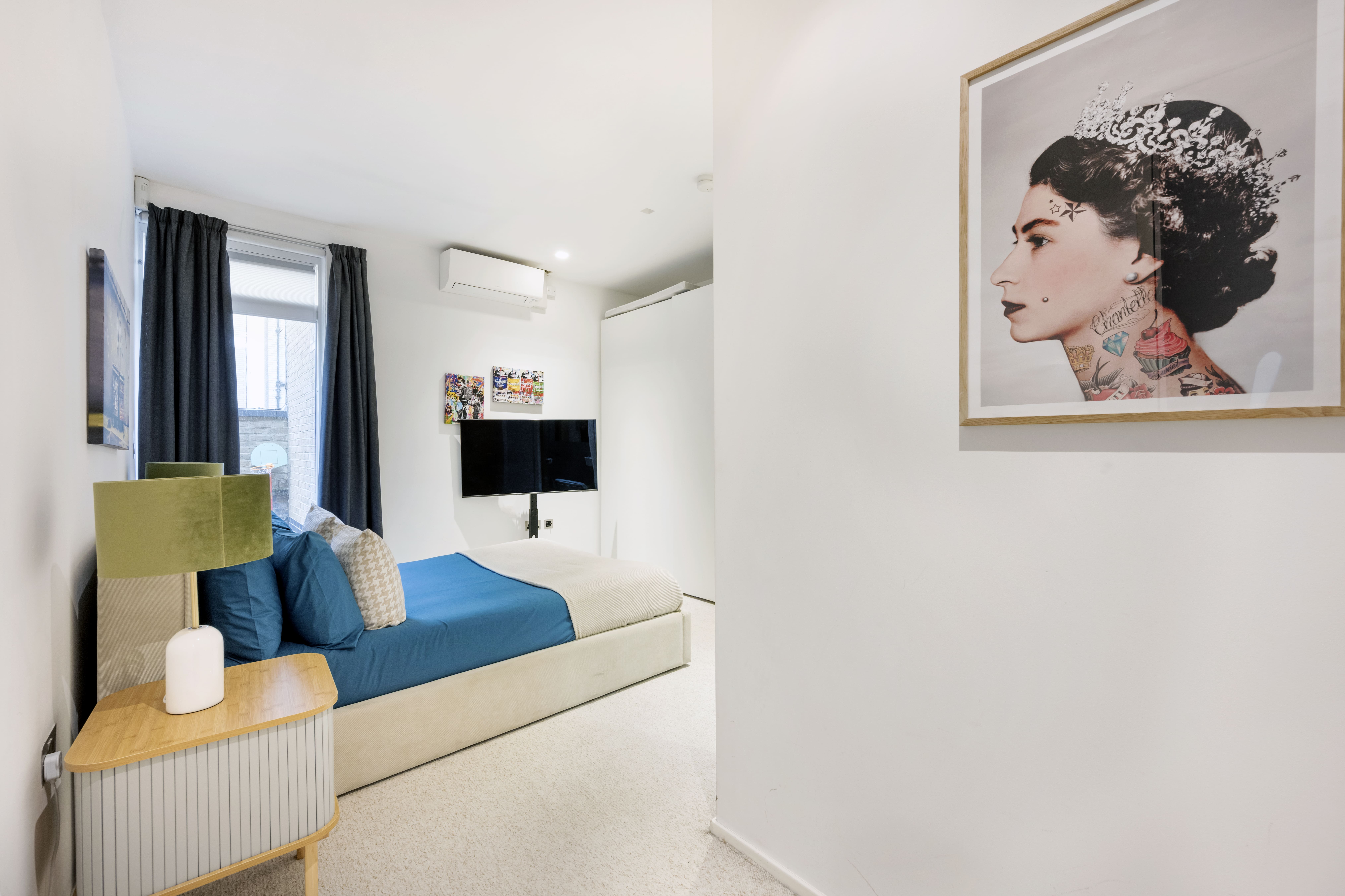 Step inside this elegant fourth-floor apartment, where contemporary design meets classic London architecture. The open-plan living area features vaulted ceilings and hardwood floors, creating a bright and airy space. Large windows allow natural light to flood in, highlighting the chic decor and industrial touches like exposed brick walls and pendant lighting. The fully equipped kitchen and dining area provide everything you need for a comfortable stay, while the bedrooms offer a tranquil retreat with their minimalist design and pops of color. Both bathrooms are equipped with luxurious rainfall showers, ensuring a relaxing start or end to your day.