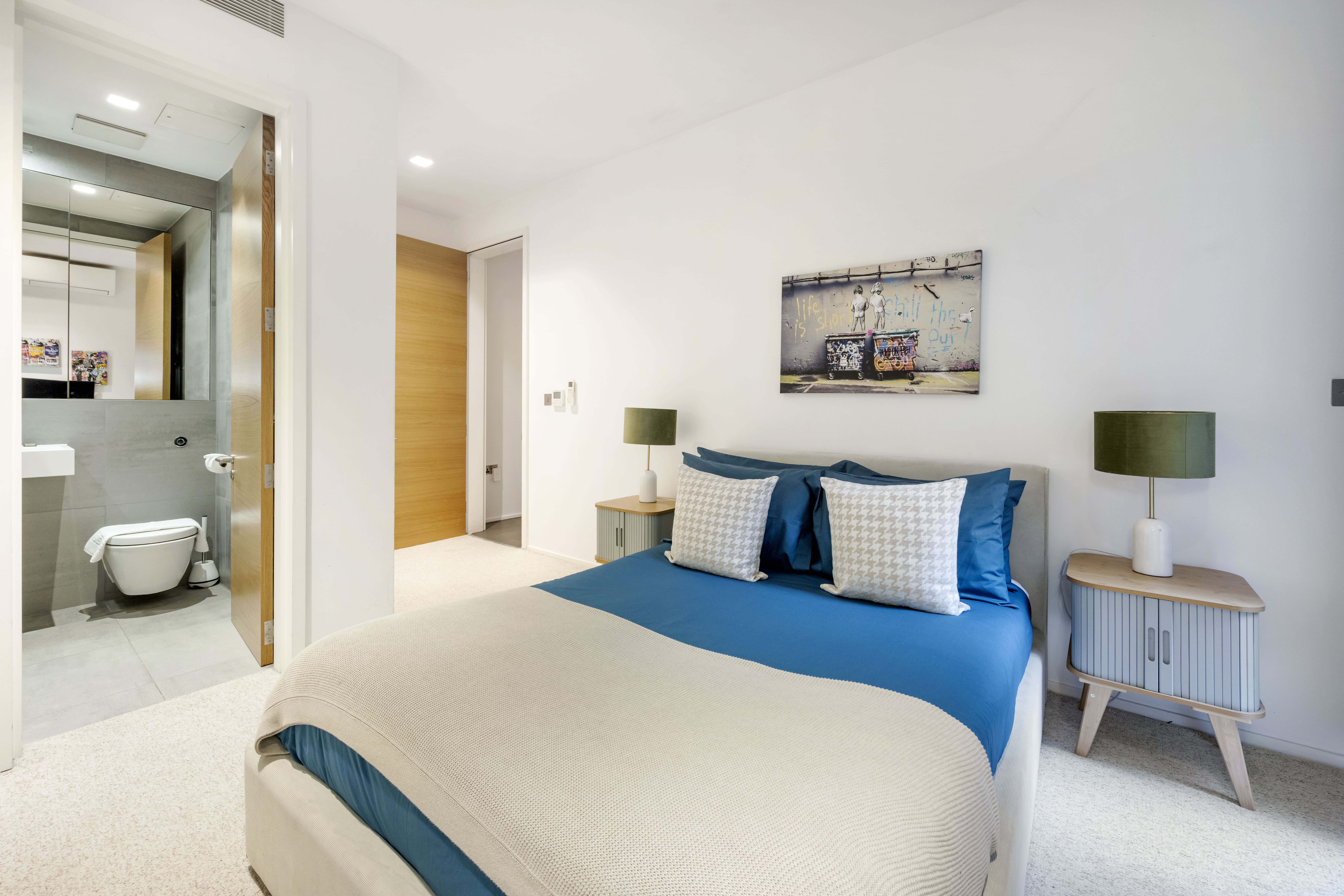 Step into a world of elegance within this 3-bedroom, 3-bathroom apartment, beautifully designed to accommodate up to six guests. The spacious living area is illuminated by large windows, allowing natural light to cascade through the room, highlighting the contemporary furnishings and tasteful decor. The dining area, adjacent to the living room, is versatile enough to serve as a workspace, should you need it. Each bedroom is a sanctuary of comfort, boasting plush bedding and ample storage space. The fully equipped kitchen caters to all culinary needs, featuring high-end appliances and sleek countertops.