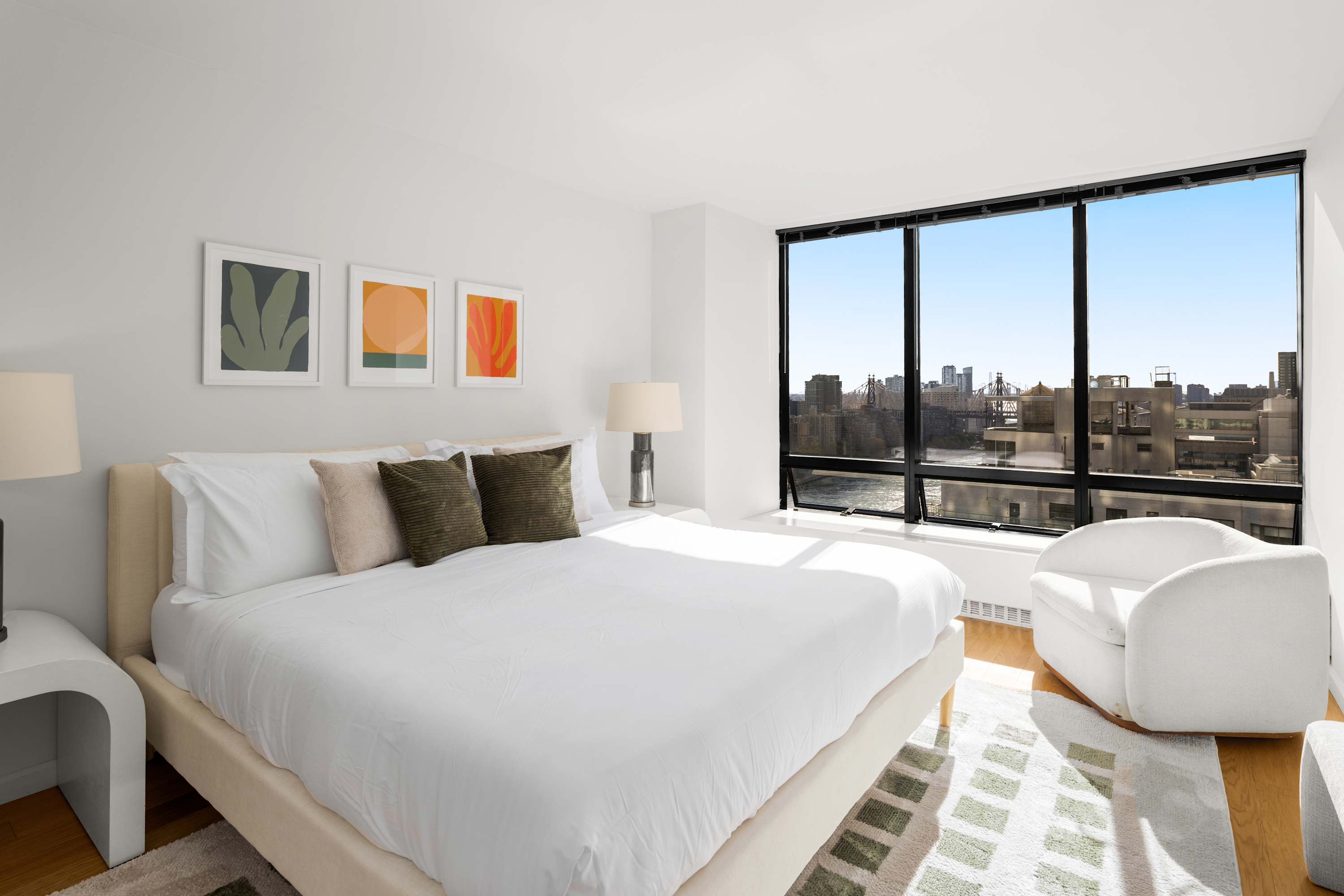 Step inside this sophisticated villa to find a beautifully designed interior that exudes comfort and style. The open-plan living area is perfect for both relaxation and entertainment, featuring plush seating, elegant decor, and large windows that flood the space with natural light. The modern kitchen is fully equipped with high-end appliances, making it easy to prepare gourmet meals. The villa boasts two luxurious bedrooms, each offering a serene retreat with sumptuous bedding and stunning East River views. Two well-appointed bathrooms complete the indoor space, ensuring every comfort is met.