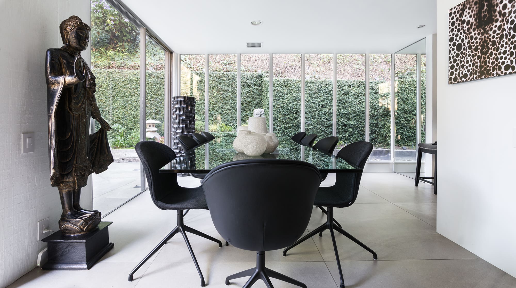 Outside, a 30-foot heated swimming pool beckons guests to unwind under the Californian sun. Lush Zen gardens provide a peaceful backdrop for meditation or leisure, while the alfresco dining area invites evenings of delicious meals and good company. As day turns to night, the grounds transform with magical lighting, creating an enchanting atmosphere perfect for gatherings around the fire pit.