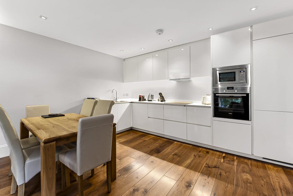The interior of this Bloomsbury apartment is a testament to modern elegance and comfort. The living area is bright and airy, featuring plush seating where you can unwind after a day of exploration. The apartment accommodates up to six guests across two spacious king-sized bedrooms, each designed with relaxation in mind. The open-plan kitchen and dining area provide a welcoming space for meals and conversations, with the dining table doubling as a laptop-friendly workspace for those traveling on business.