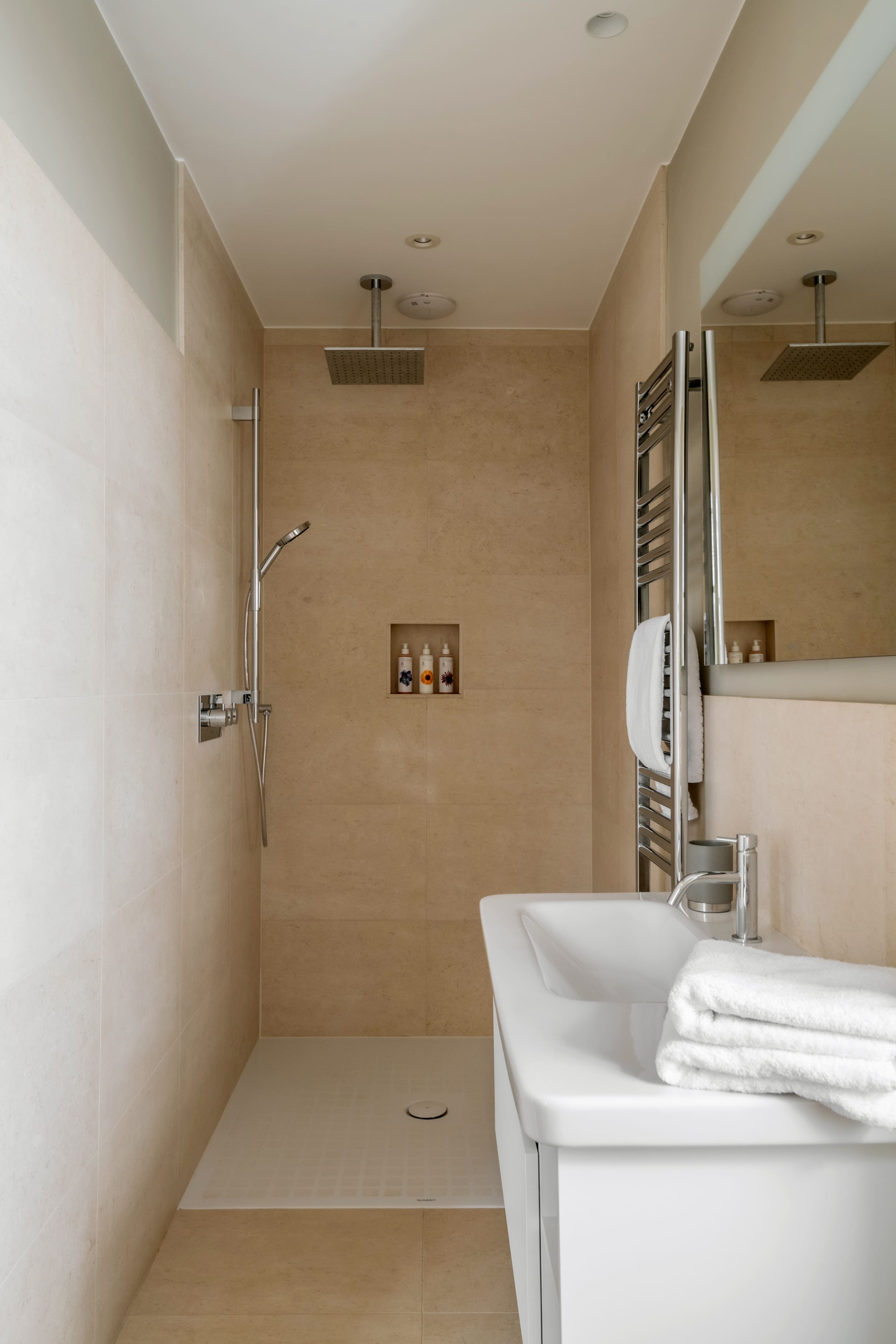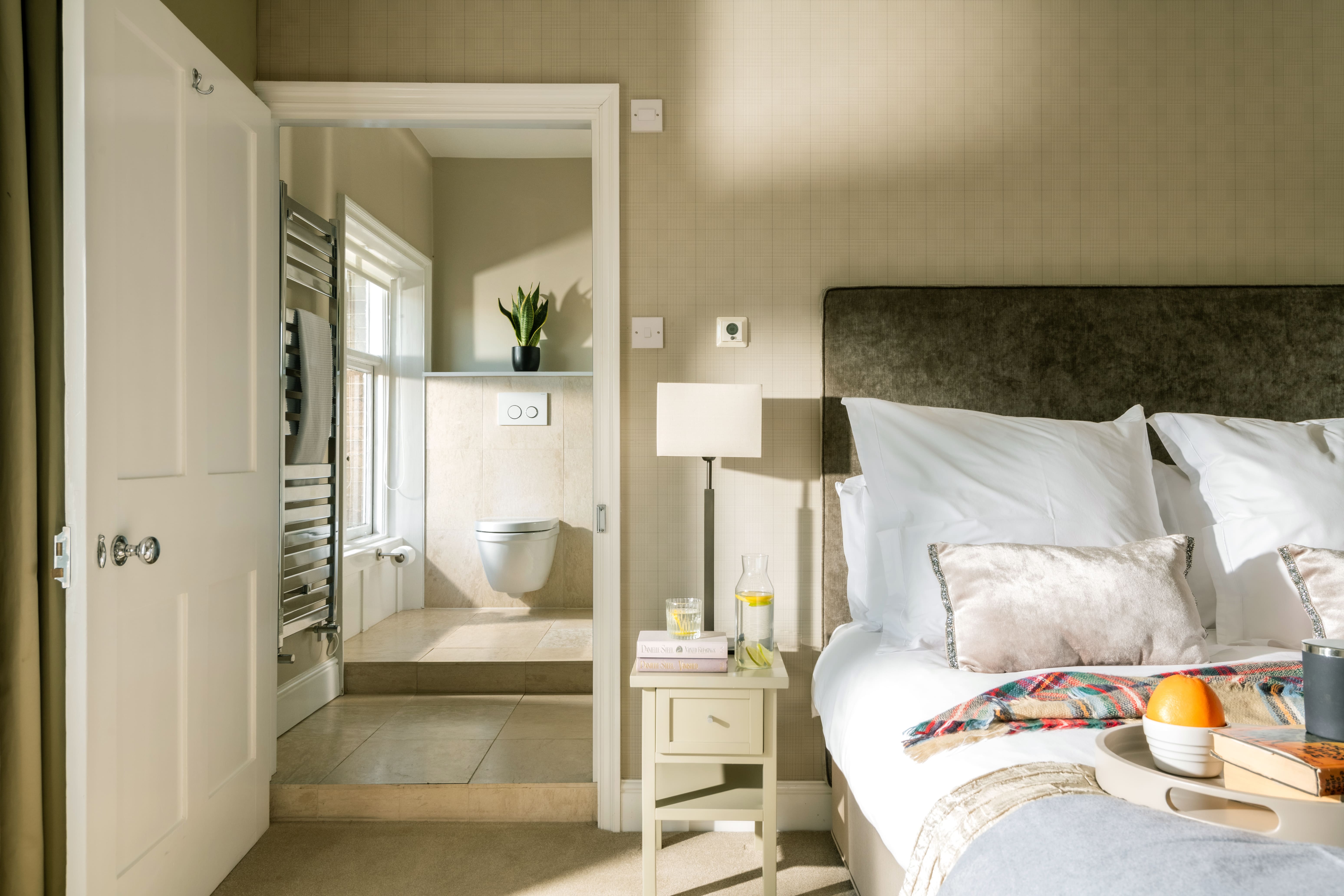 The apartment accommodates up to 14 guests with seven bedrooms and seven bathrooms. One bedroom features a private bathroom across the hall. Pets are welcome, and there is plenty of private parking available. For larger groups, consider booking the additional ensuite shepherd’s huts on the grounds. Browse our luxury villa rentals in United Kingdom for more properties.