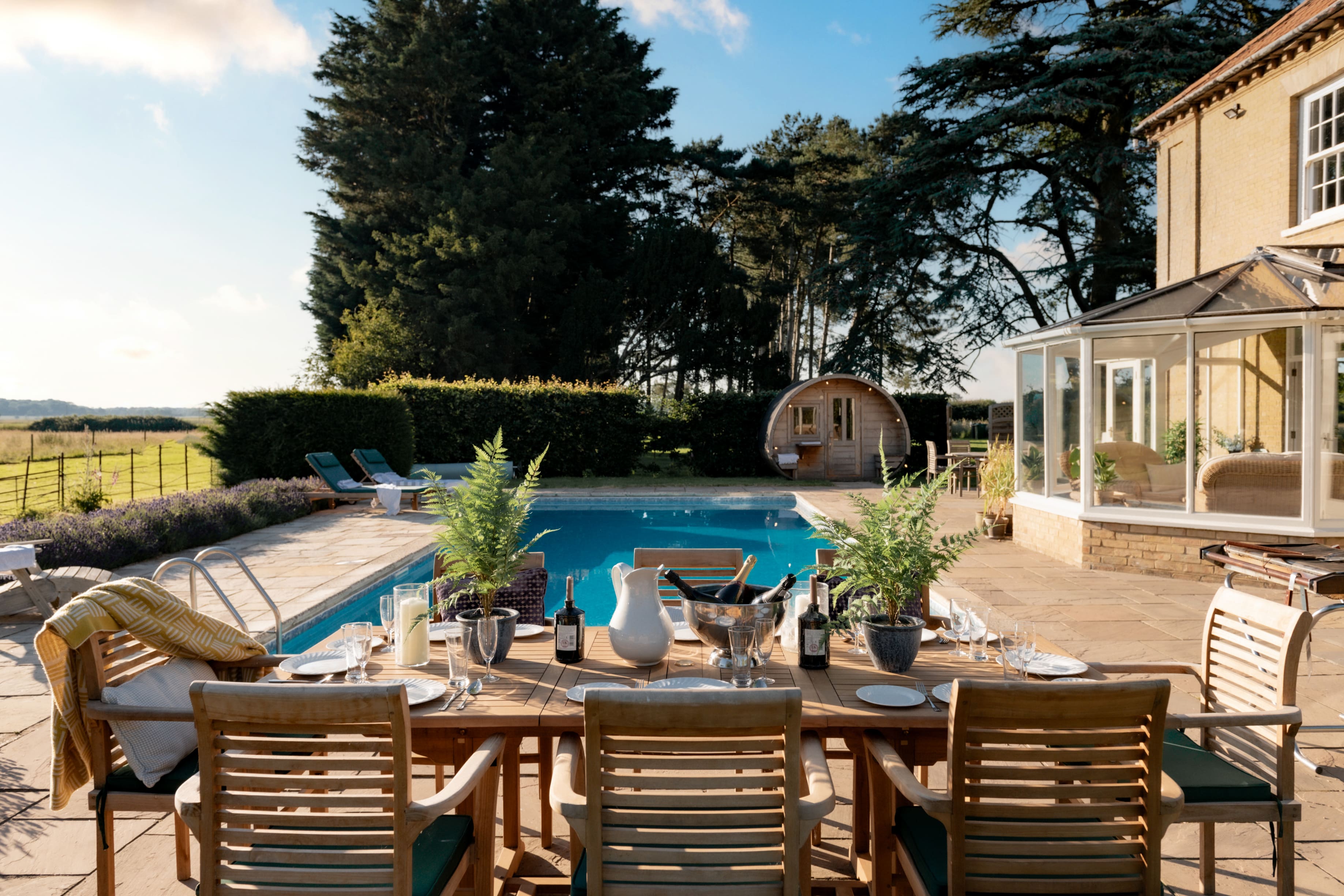 The interiors of this luxury apartment rental in Reepham are a testament to refined taste and comfort. Each of the seven bedrooms is a sanctuary, uniquely decorated to provide a distinct ambiance. The spacious living areas offer ample room for relaxation and entertainment, featuring a cozy games room complete with pool and foosball tables by a wood-burning stove. The fully-equipped kitchen, boasting a gas range cooker and extensive prep space, is designed to cater to culinary enthusiasts, while the charming dining room with views of the surrounding fields invites convivial gatherings.