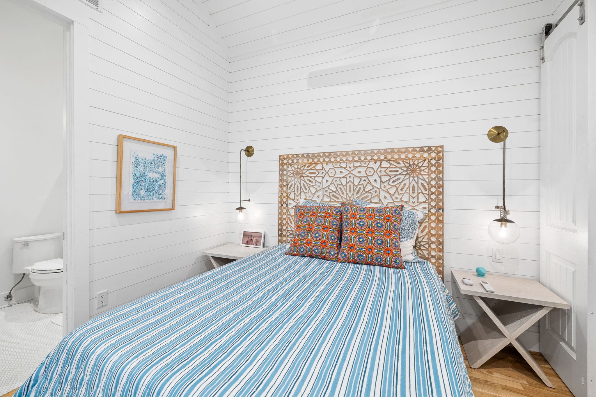 The interiors of this villa are a celebration of light and space, designed with a bright, bohemian flair. The living area, adorned with plush seating and artistic touches, invites you to relax and unwind. The fully-equipped kitchen, featuring modern appliances, is perfect for preparing meals to enjoy in the adjacent dining area. Each of the three spacious bedrooms is a haven of comfort, complete with en-suite bathrooms that offer a touch of luxury. The villa can comfortably accommodate up to eight guests.
