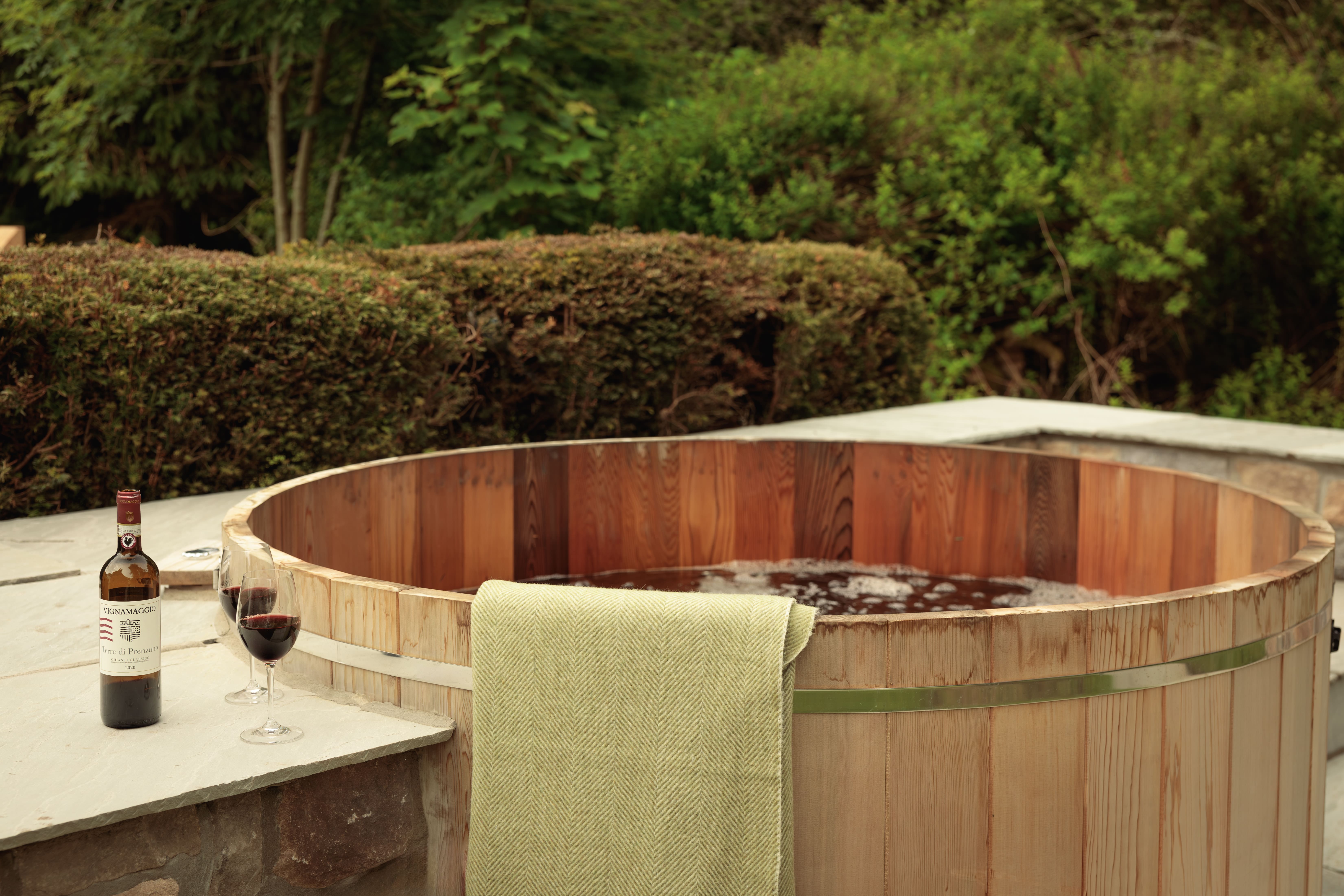 A: The cedar hot tub provides a relaxing experience surrounded by nature, perfect for unwinding after a day of adventures.