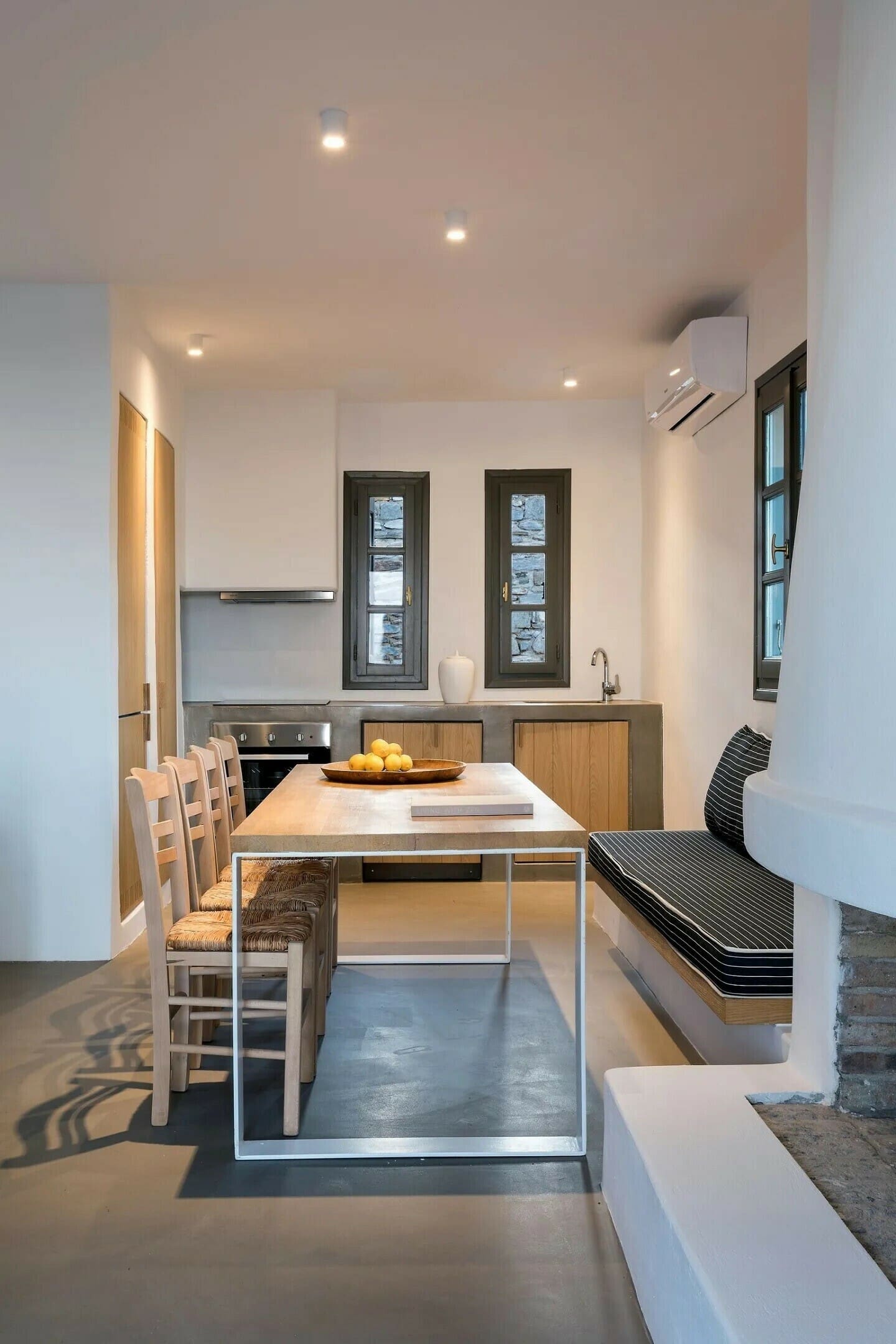 The interior of Kastelli Melissourgou is thoughtfully designed, combining comfort and elegance. The spacious living area features a contemporary aesthetic with plush furnishings and an inviting ambiance, ideal for relaxation after a day of exploring. The villa boasts five beautifully appointed bedrooms, each designed with a touch of sophistication and equipped with air conditioning for your comfort. The open-plan kitchen is a chef’s delight, fully equipped with modern appliances, allowing for effortless meal preparation. With indoor and outdoor dining options, you can enjoy delightful meals with family and friends against the backdrop of the stunning Paros landscape.