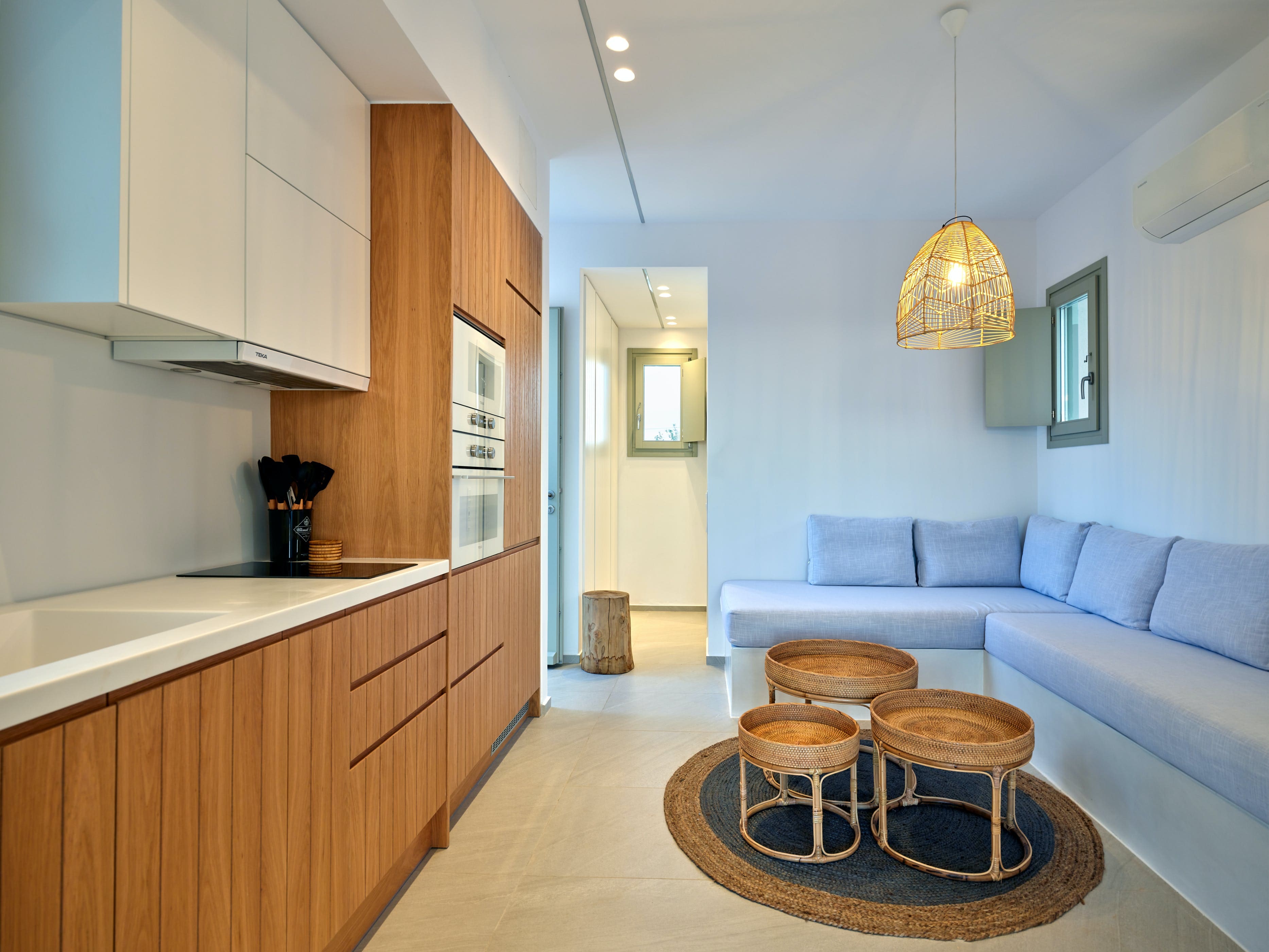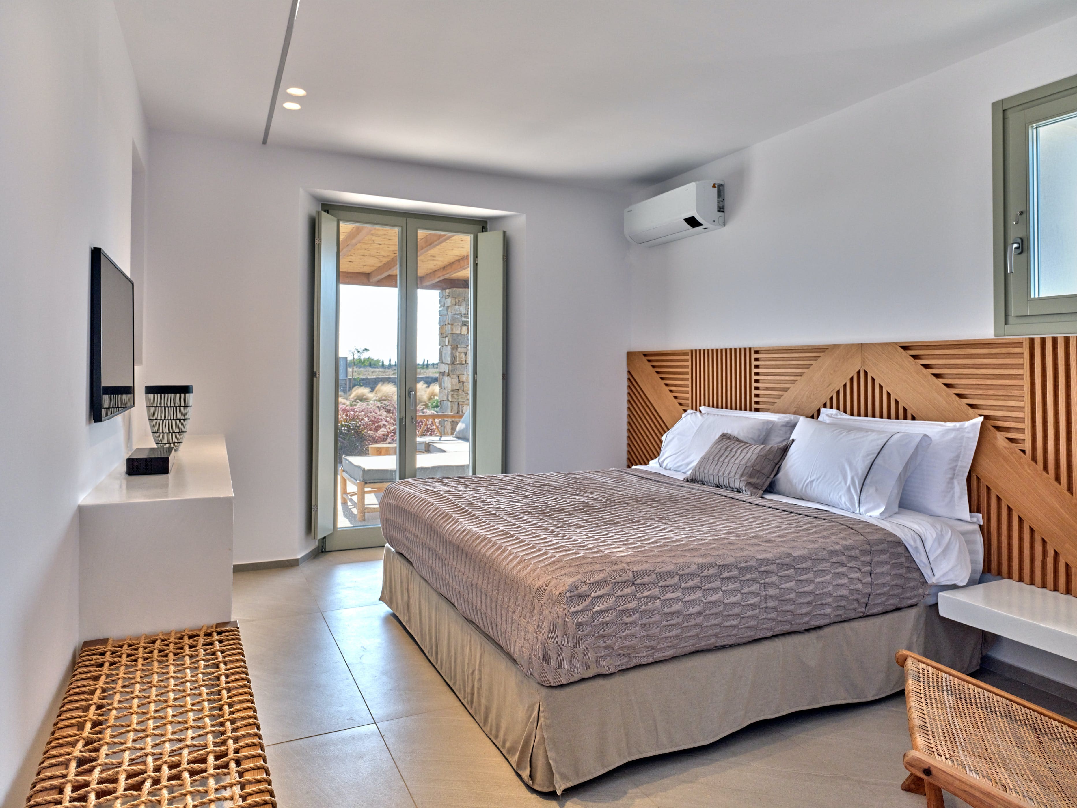 Step inside Kastro Asteri to discover a beautifully designed interior characterized by soft hues and natural textures that create a calming atmosphere. The main villa features a spacious living area perfect for relaxation, a fully equipped kitchen for culinary adventures, and four en-suite bedrooms that promise restful nights. The separate guest house offers an additional two en-suite bedrooms along with its own living room and kitchen, ensuring ample space and privacy for all guests. While some bathrooms may not be photographed, their style and quality are consistent with the rest of the home.