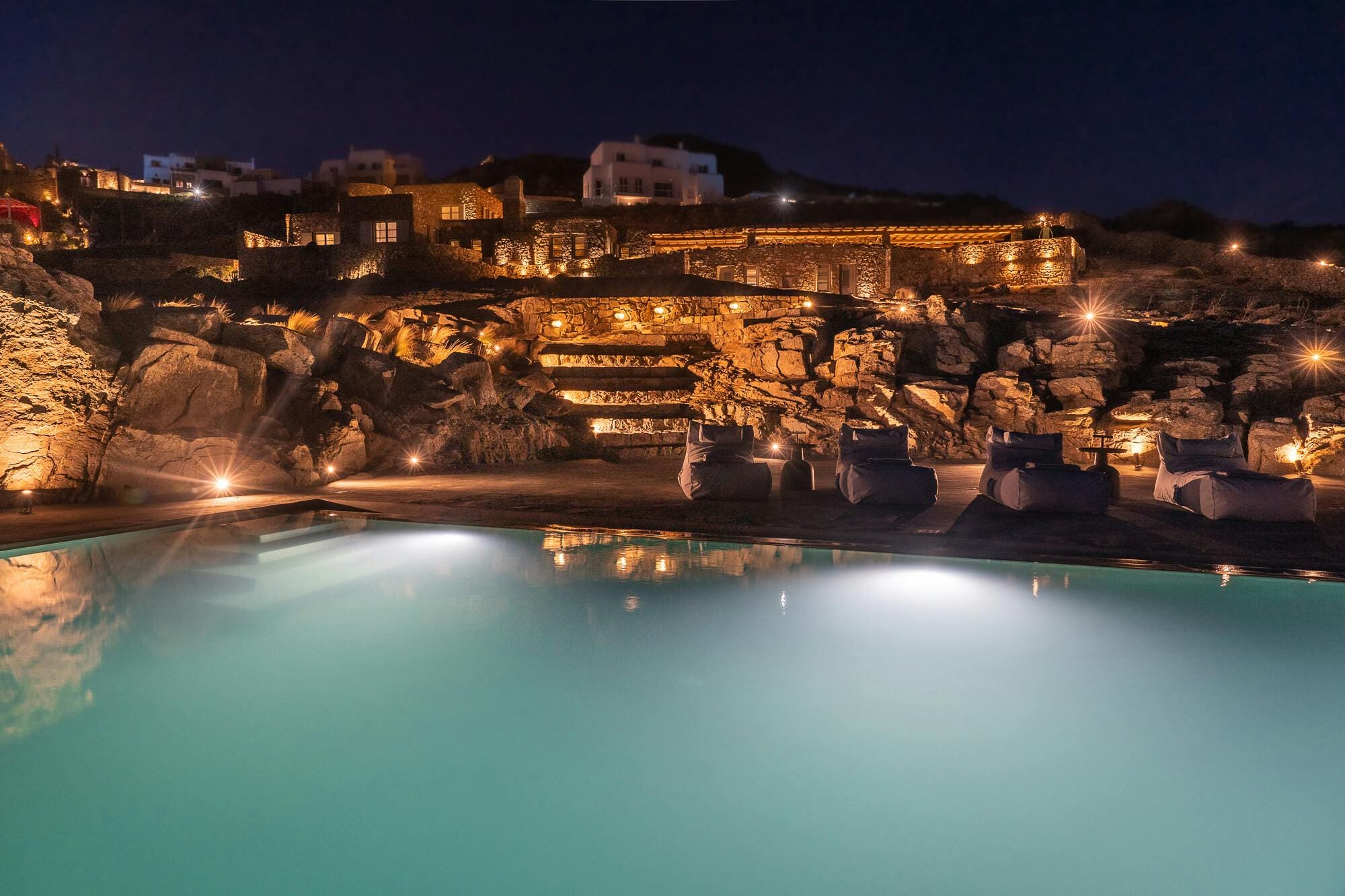 The outdoor areas of Kastro Thalassia are nothing short of spectacular. An infinity pool stretches out towards the horizon, offering stunning vistas of the sun setting over the sea. Surrounding the pool, you will find generous lounging and dining spaces, ideal for alfresco dinners under the stars. Lush gardens enhance the ambiance, providing a tranquil retreat where guests can unwind and soak in the idyllic Mykonos lifestyle.