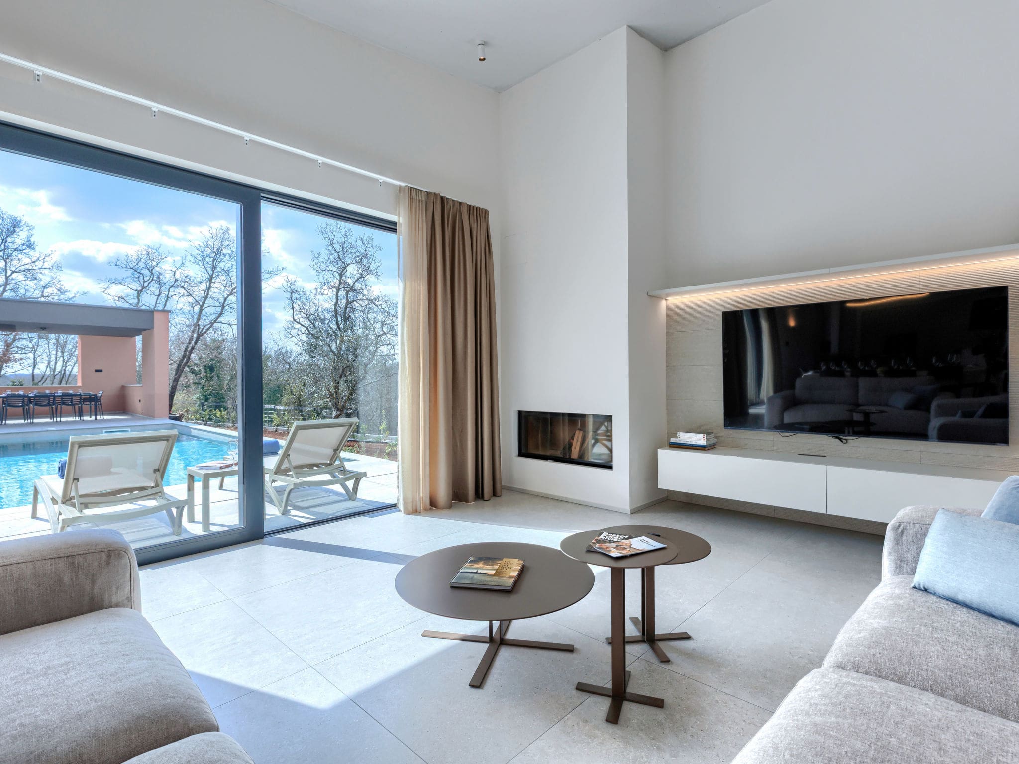 Spanning 327 square metres across two thoughtfully designed levels, this contemporary villa accommodates up to 10 guests in five beautifully appointed bedrooms, each featuring its own en-suite bathroom with shower, bidet and WC. The ground floor presents an impressive open-plan living space where the dining area flows seamlessly into a lounge centred around a decorative fireplace. Floor-to-ceiling windows flood the space with natural light while offering direct access to the outdoor terraces. The state-of-the-art kitchen features an island design with induction cooking plates, integrated dishwasher, and premium appliances including an electric coffee machine and microwave. Each bedroom is equipped with a king-size bed, flat-screen satellite television, and individual air conditioning, ensuring comfort throughout your stay. The upper floor bedrooms provide enchanting views across the swimming pool and surrounding Istrian countryside.