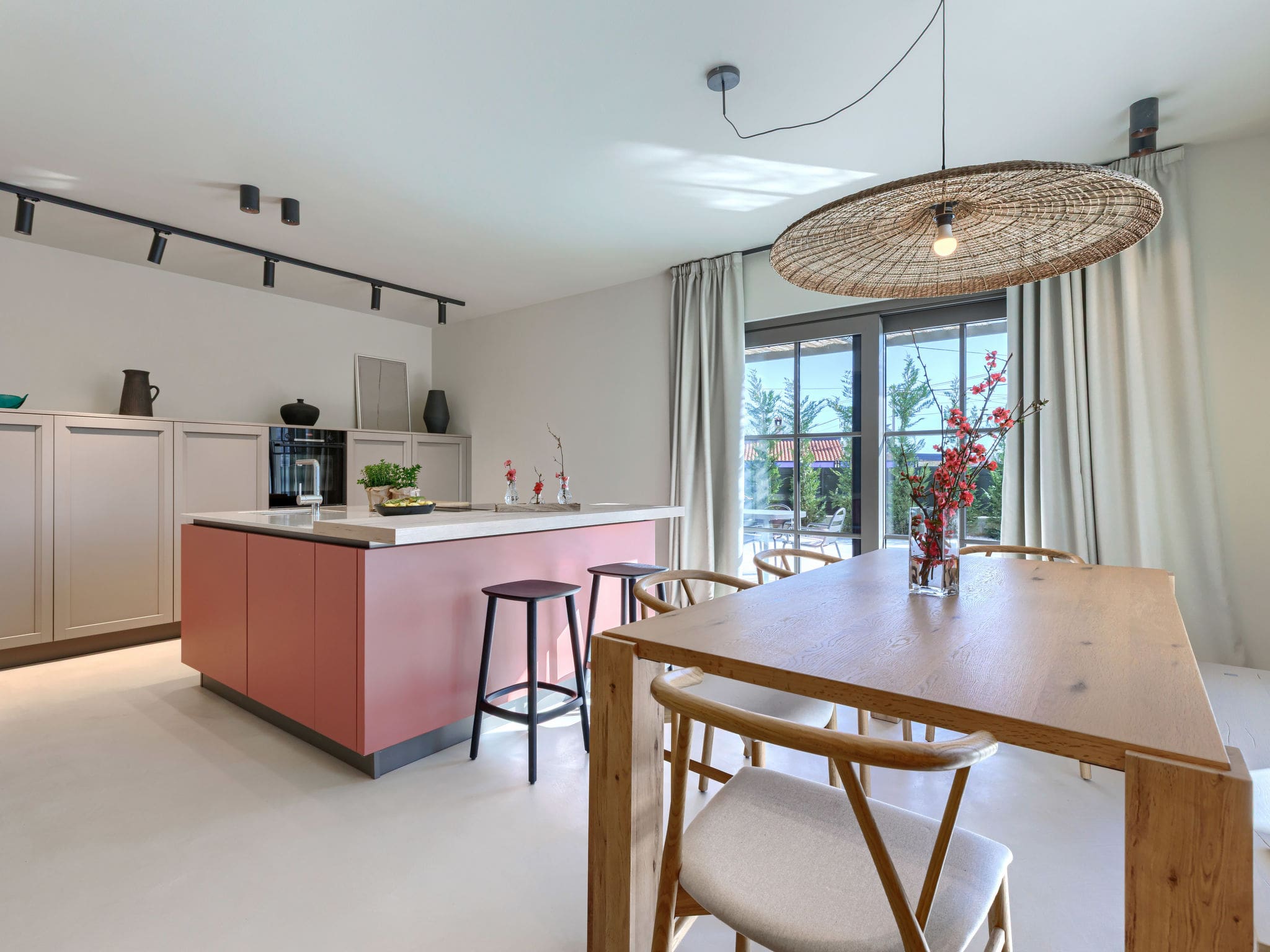 Built in 2024, this immaculate semi-detached house showcases the very best in modern villa design across 150 square metres of elegant living space. The open-plan ground floor seamlessly connects the living and dining areas, centred around a decorative open-hearth fireplace that creates a warm focal point. The space flows naturally onto the terrace and pool area through large glazed doors, while the state-of-the-art kitchen features premium appliances including a dishwasher, microwave, electric coffee machine, and ceramic hob.