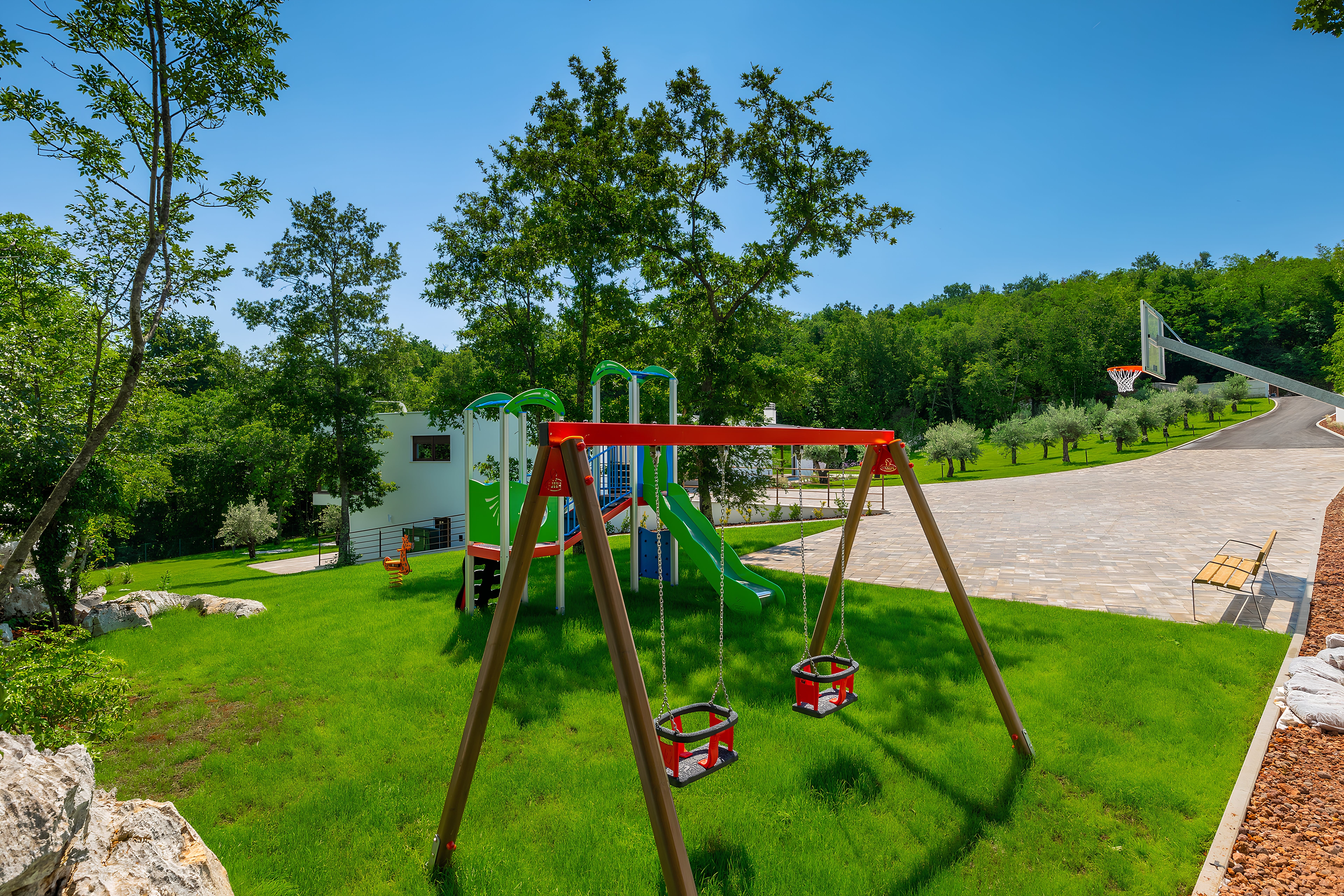 The outdoor areas of this luxury villa rental in Istria are equally impressive, featuring a heated swimming pool surrounded by sun loungers and lush gardens. A sleek outdoor kitchen and dining space provide the perfect backdrop for alfresco meals, with stunning seaviews that enhance your dining experience. Children can enjoy the dedicated play area while adults can unwind in the various lounge spots scattered around the property.