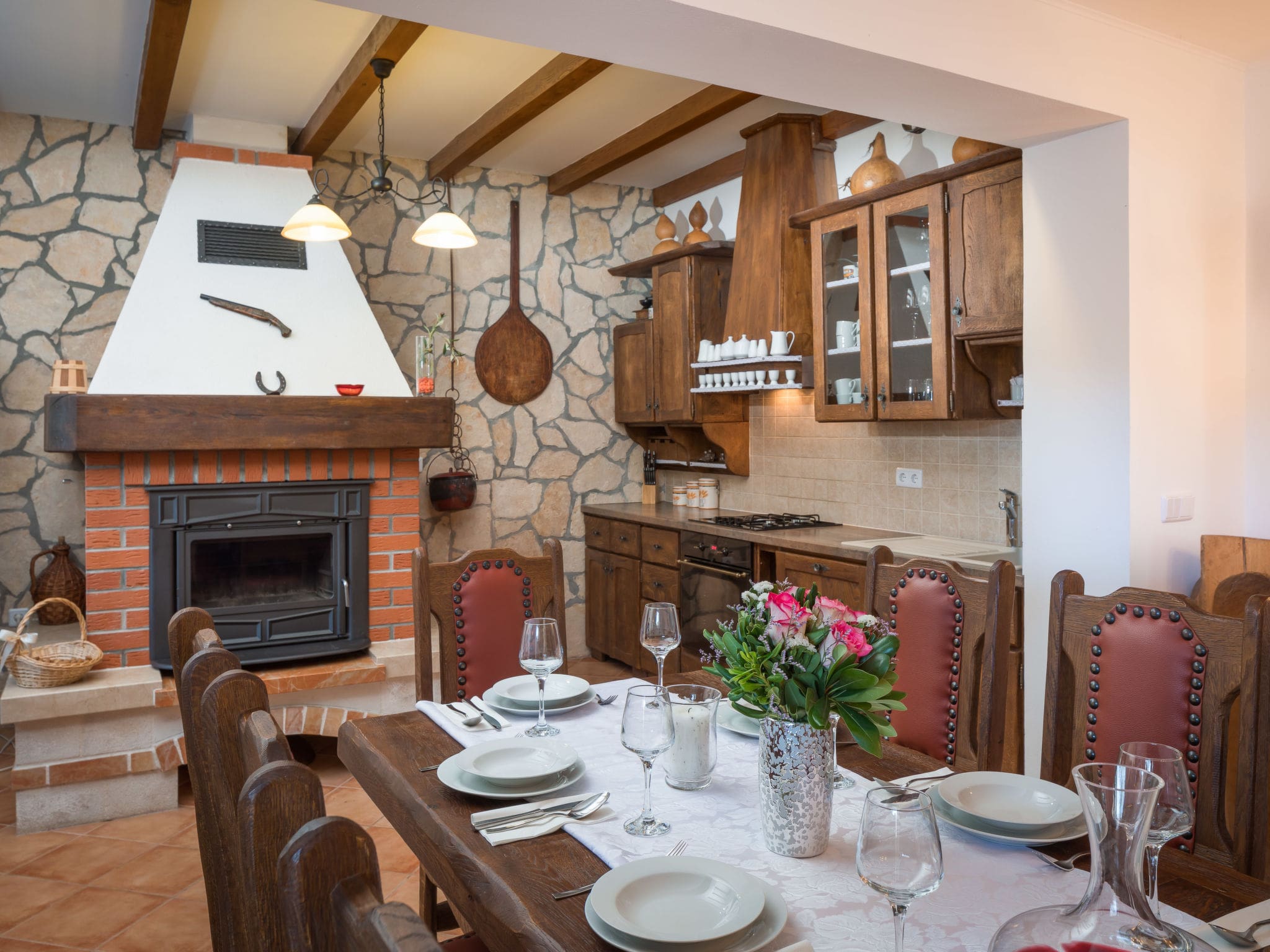 The heart of the villa lies in its spacious living and dining area, where floor-to-ceiling windows flood the space with natural light. An open-hearth fireplace creates a cosy atmosphere during cooler evenings, while air conditioning ensures comfort throughout the warmer months. The fully equipped kitchen features modern appliances including a dishwasher, microwave, oven, and electric coffee machine, perfect for preparing everything from quick breakfasts to elaborate family meals.