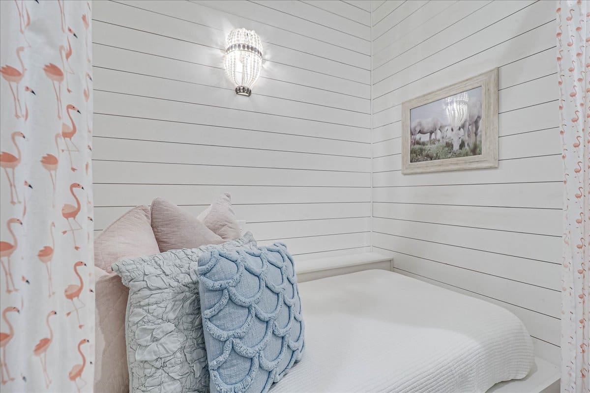 The villa welcomes you with bright, open-plan living spaces that blend contemporary comfort with family-friendly functionality. The main living area features comfortable seating including a sofa bed for additional guests, while the well-appointed kitchen provides everything needed for group dining and entertaining. Five thoughtfully designed bedrooms include a dedicated bunk room perfect for children, featuring both single-over-single bunks and extra-short twin configurations ideal for younger guests. A convenient single bed tucked into the hallway alcove maximizes sleeping capacity while maintaining the home’s spacious feel throughout.