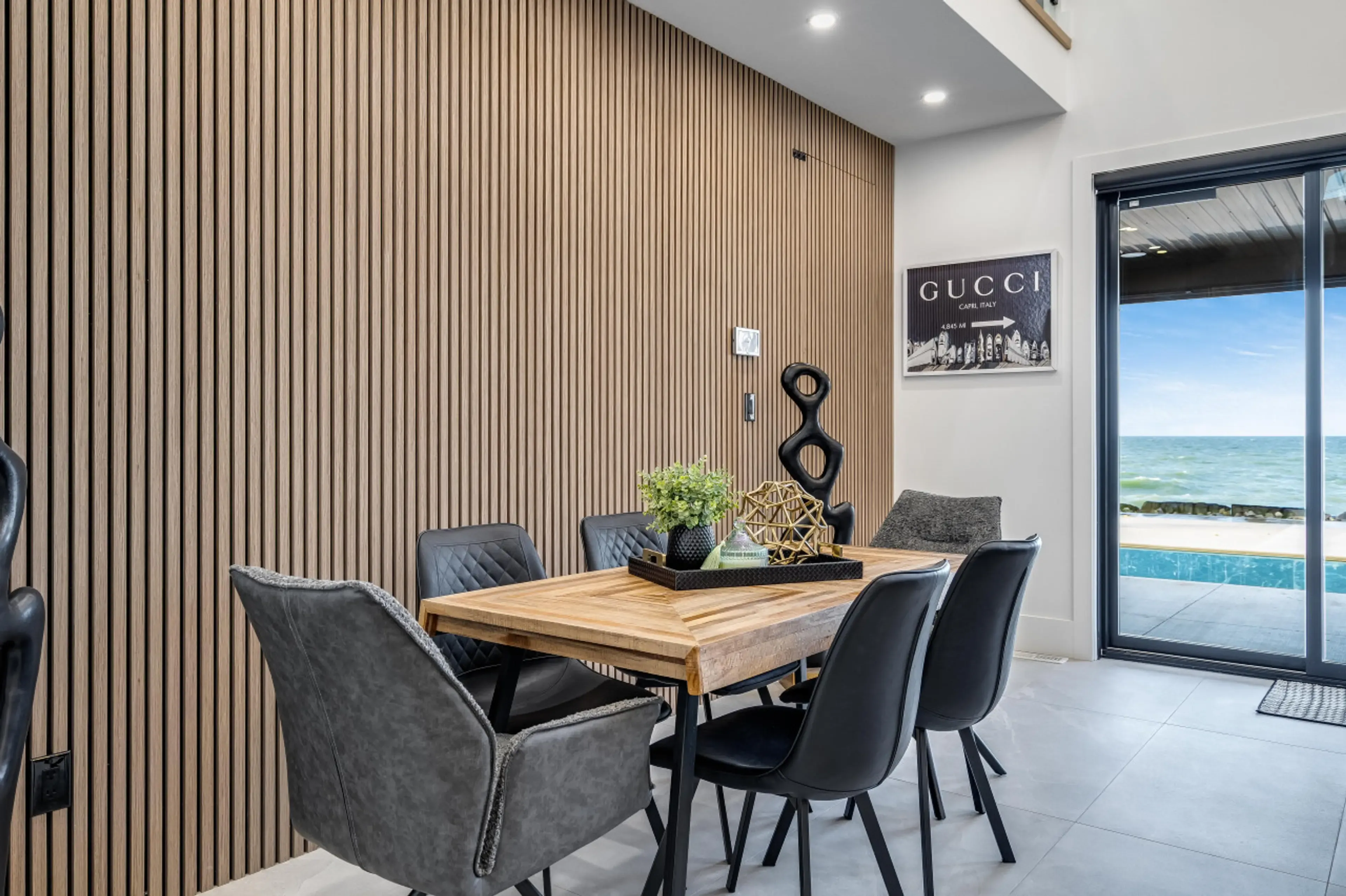 The saltwater swimming pool serves as the centrepiece of outdoor living, available from May through September with unobstructed lake panoramas. Multiple balconies and terraces provide varied vantage points for sunrise coffee and sunset cocktails. A private gate leads to an exclusive viewing platform positioned directly on the water’s edge, offering front-row seats to Lake Erie’s natural theater. Mature landscaping frames the property while maintaining those coveted sightlines across Canada’s southernmost waters.