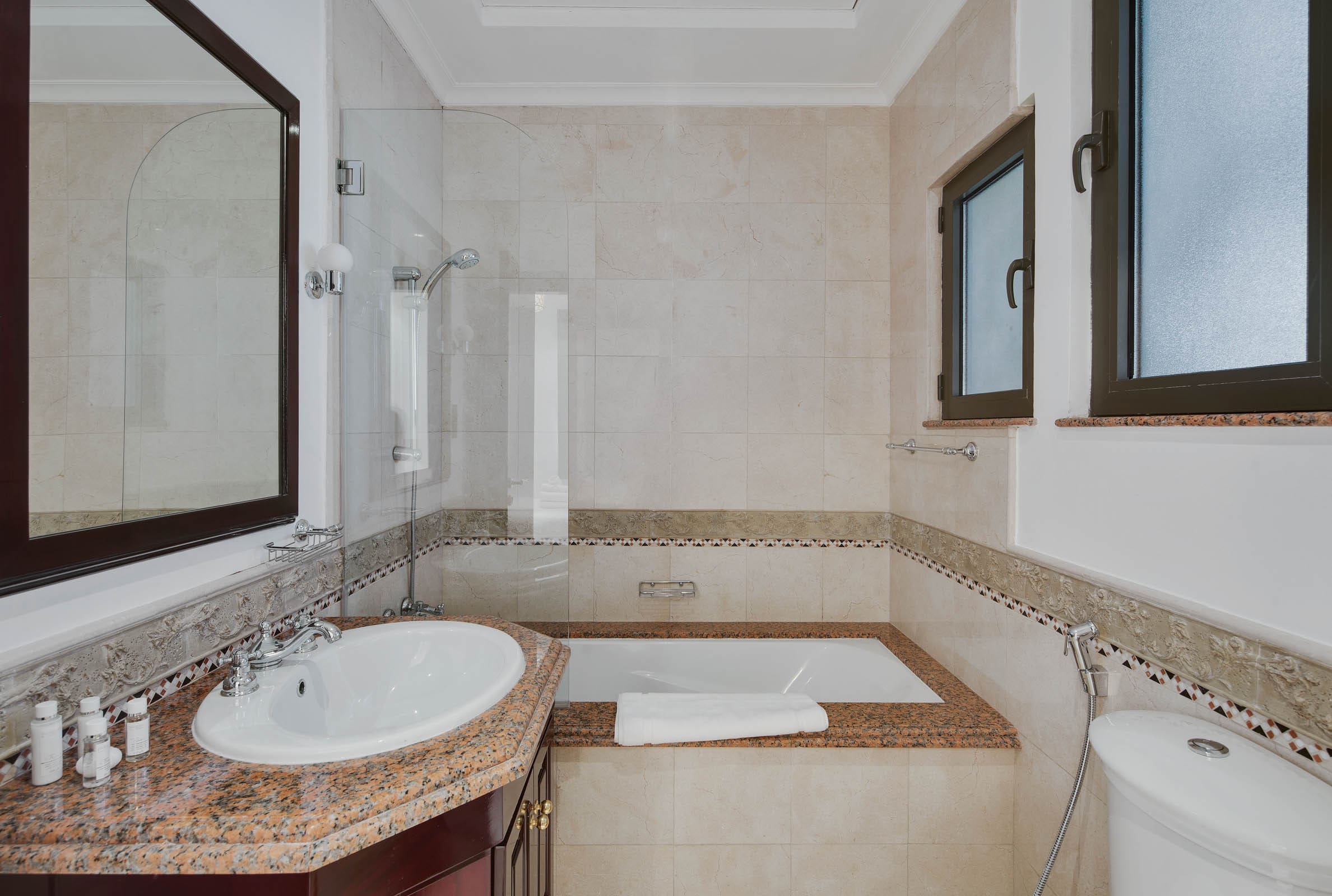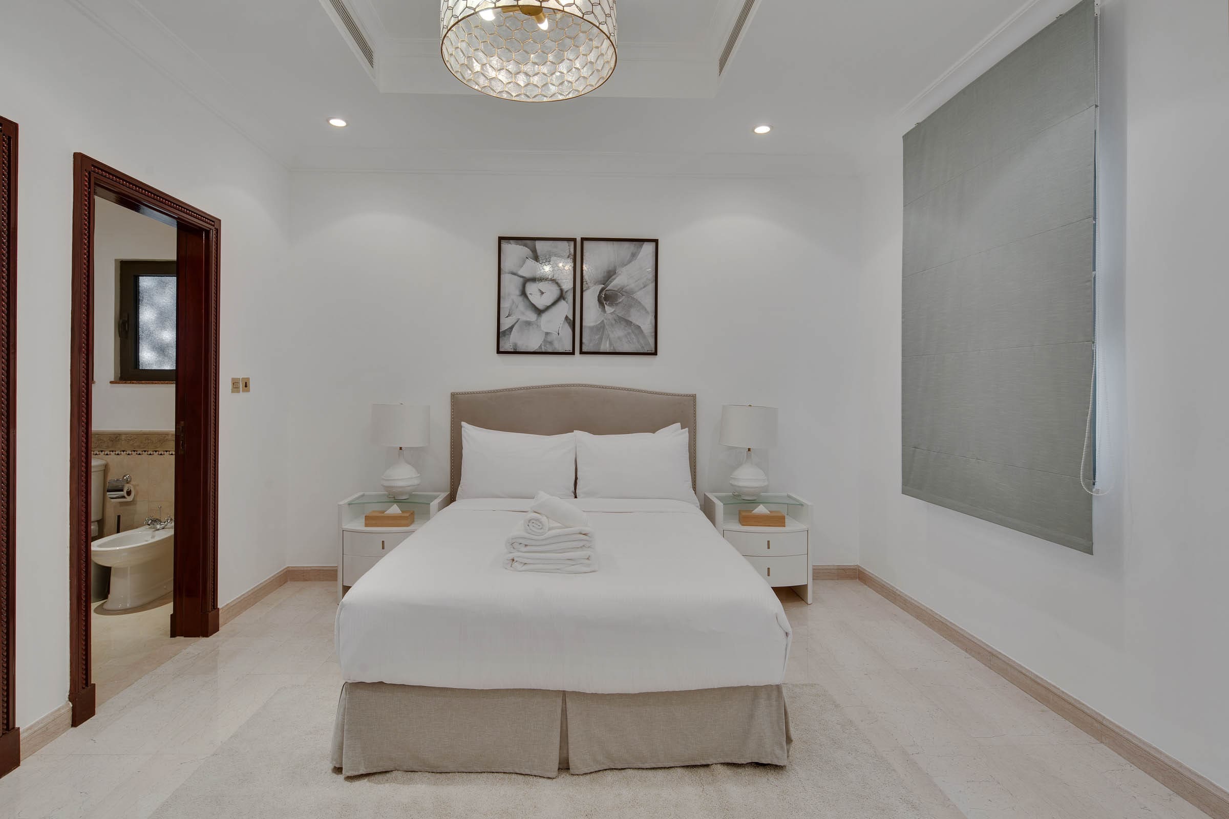 Upon entering the apartment, you’re welcomed into a world of sophistication where contemporary design meets Arabian charm. The expansive living area, adorned with tasteful furnishings and large windows, provides a bright and airy ambiance. The gourmet kitchen is equipped with state-of-the-art appliances, perfect for whipping up a feast. Each of the six bedrooms is a sanctuary of tranquility, featuring plush bedding and en-suite bathrooms, ensuring privacy and comfort for all guests. The decor reflects a refined taste with a soothing color palette that enhances the serene atmosphere.