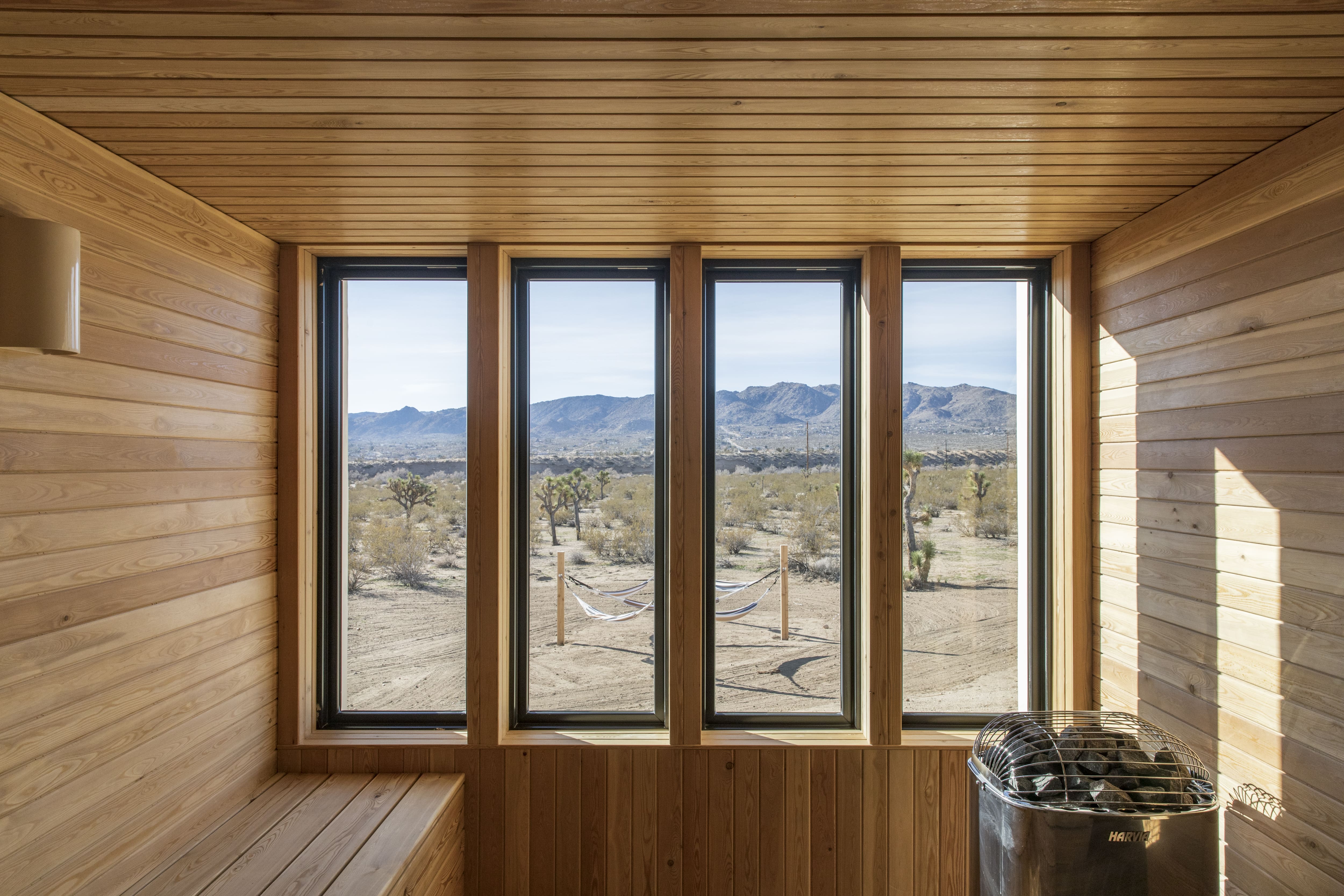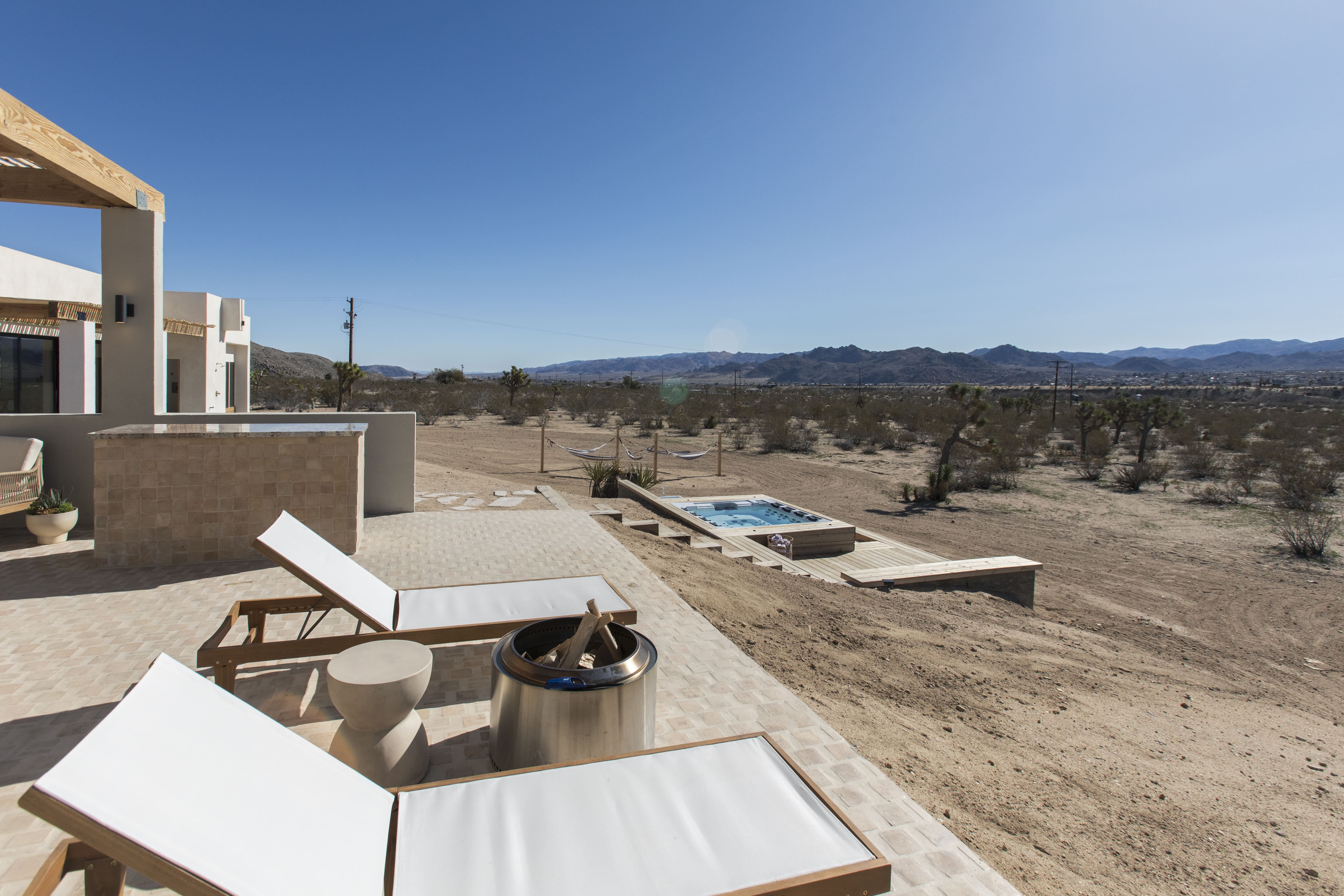Step outside to discover the villa’s enchanting outdoor spaces. The expansive terrace is perfect for al fresco dining under the starlit sky, while the hot tub and sauna offer ultimate relaxation. Surrounded by fifty acres of untouched desert landscape, the villa provides a private oasis where guests can unwind and soak in the natural beauty of Joshua Tree.