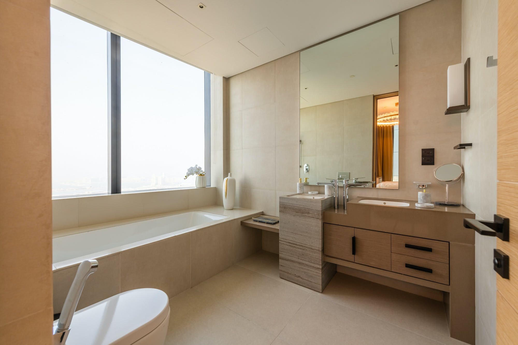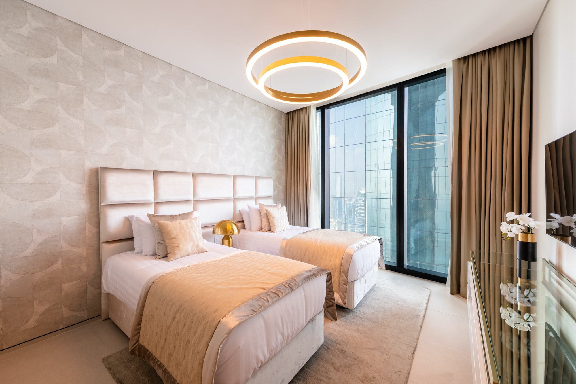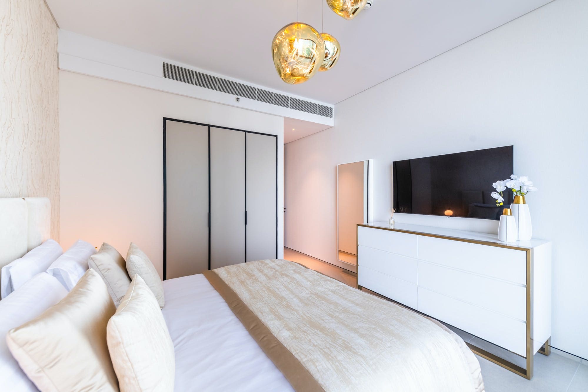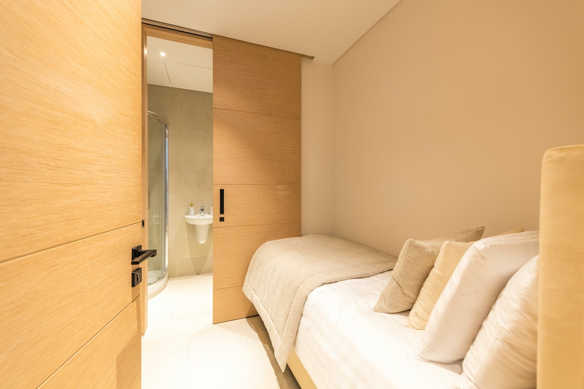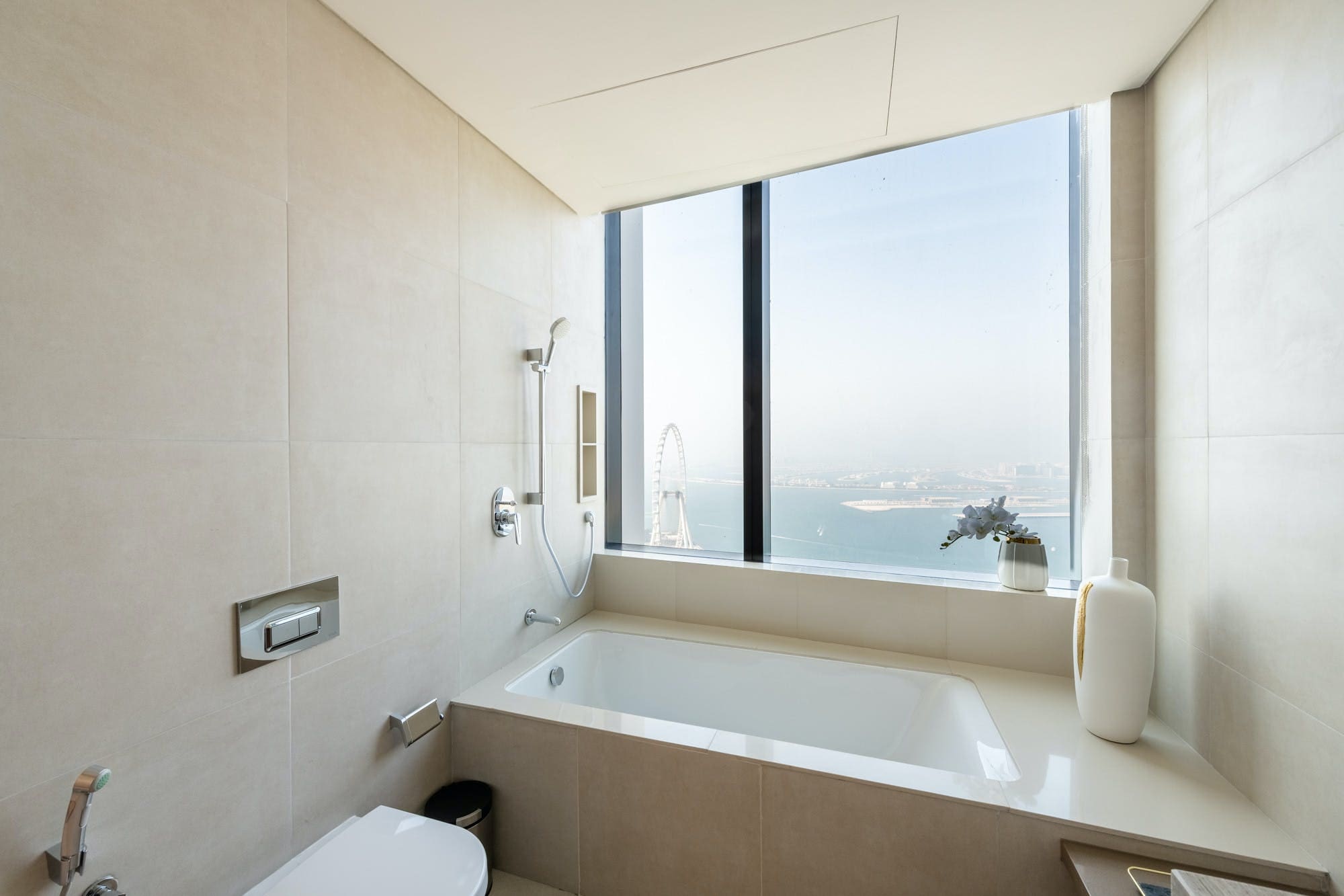 Step inside, and you’ll be greeted by opulently designed interiors that exude sophistication. The open-plan living area is a masterpiece of modern design, featuring plush furnishings, ambient lighting, and floor-to-ceiling windows that frame the stunning seascape. The fully equipped kitchen is a gourmet’s delight, with top-of-the-line appliances and sleek countertops. Each of the four bedrooms offers a sanctuary of tranquility, boasting comfortable beds and stylish decor. The master suite is particularly impressive, with its en-suite bathroom and private balcony with panoramic views of the Arabian Gulf.