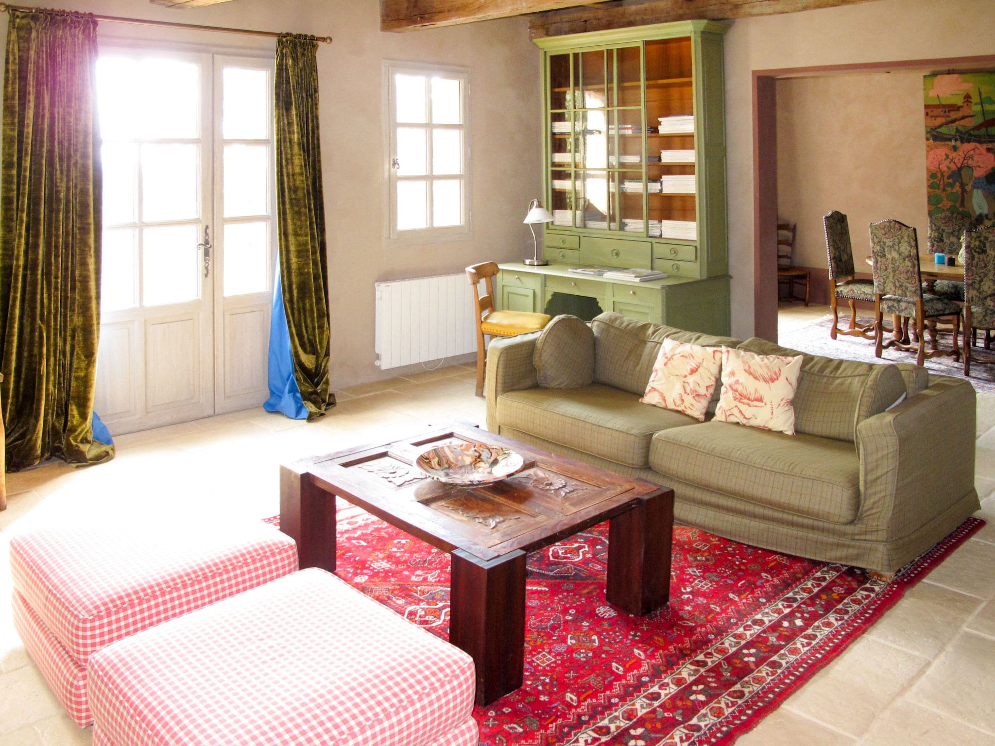 The property combines rustic Provençal charm with modern comfort across two carefully designed levels. The main house welcomes guests through spacious reception rooms featuring natural stone floors and traditional open-hearth fireplace. The large living room flows seamlessly to outdoor terraces, while the separate dining room provides elegant space for memorable meals. A well-equipped kitchen with seven gas rings, dishwasher and electric coffee machine opens directly to the terrace, perfect for al fresco dining. The ground floor includes one bedroom with ensuite bathroom, while four additional bedrooms occupy the upper level, each with private shower rooms. One bedroom features a dressing room for extended stays, and the property includes both bathtub and shower facilities throughout.