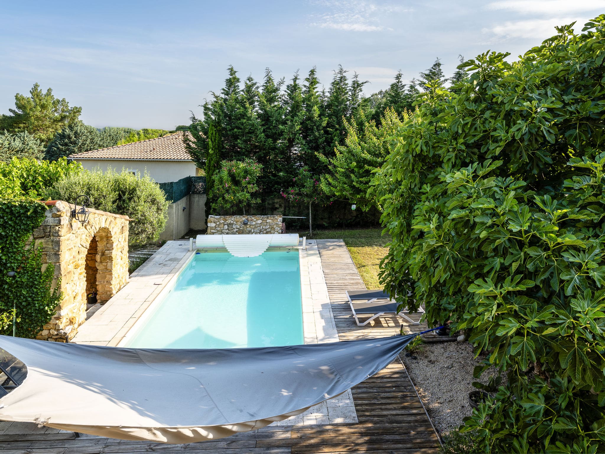 The private grounds encompass 1,200 square metres of beautifully landscaped gardens featuring manicured lawns and a wildlife garden that attracts local birds and butterflies. The swimming pool measures an impressive 8 by 5 metres with depths ranging from 1.3 to 1.9 metres, available seasonally from June through September with convenient shutter cover. Multiple terraces provide varied outdoor living spaces, including a large 15-square-metre terrace and an intimate 8-square-metre terrace, both furnished with comfortable seating areas. The property includes barbecue facilities and eight deck chairs for ultimate relaxation under the Provençal sun.