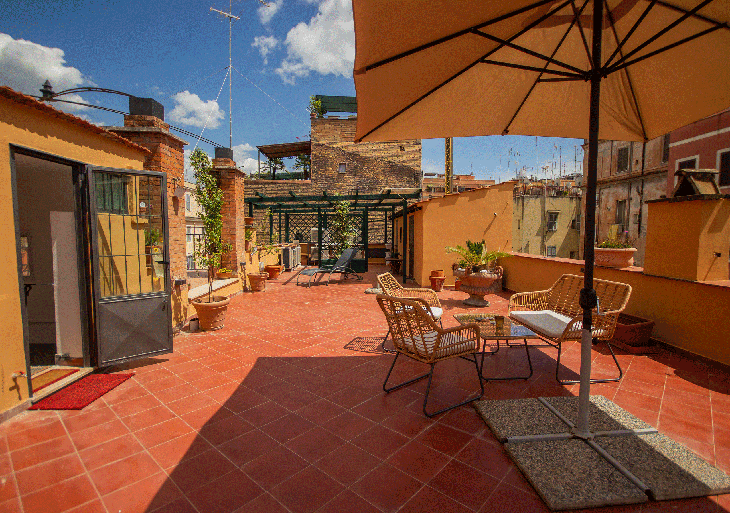 A: The terrace offers stunning views of the Roman cityscape, perfect for relaxation and dining.