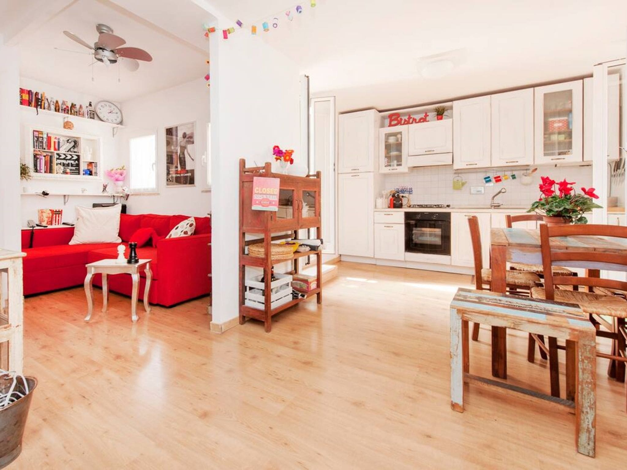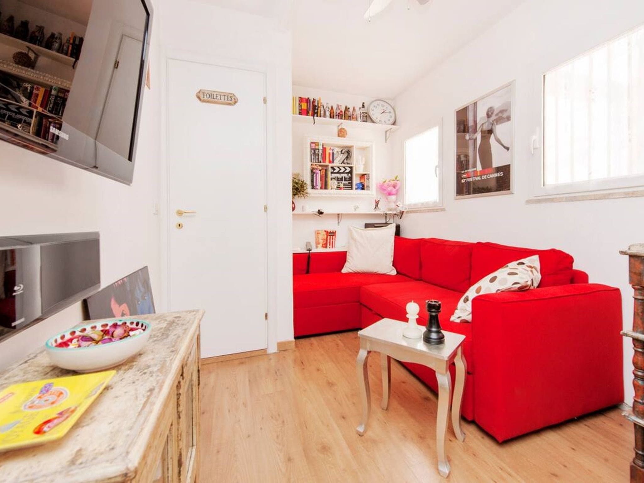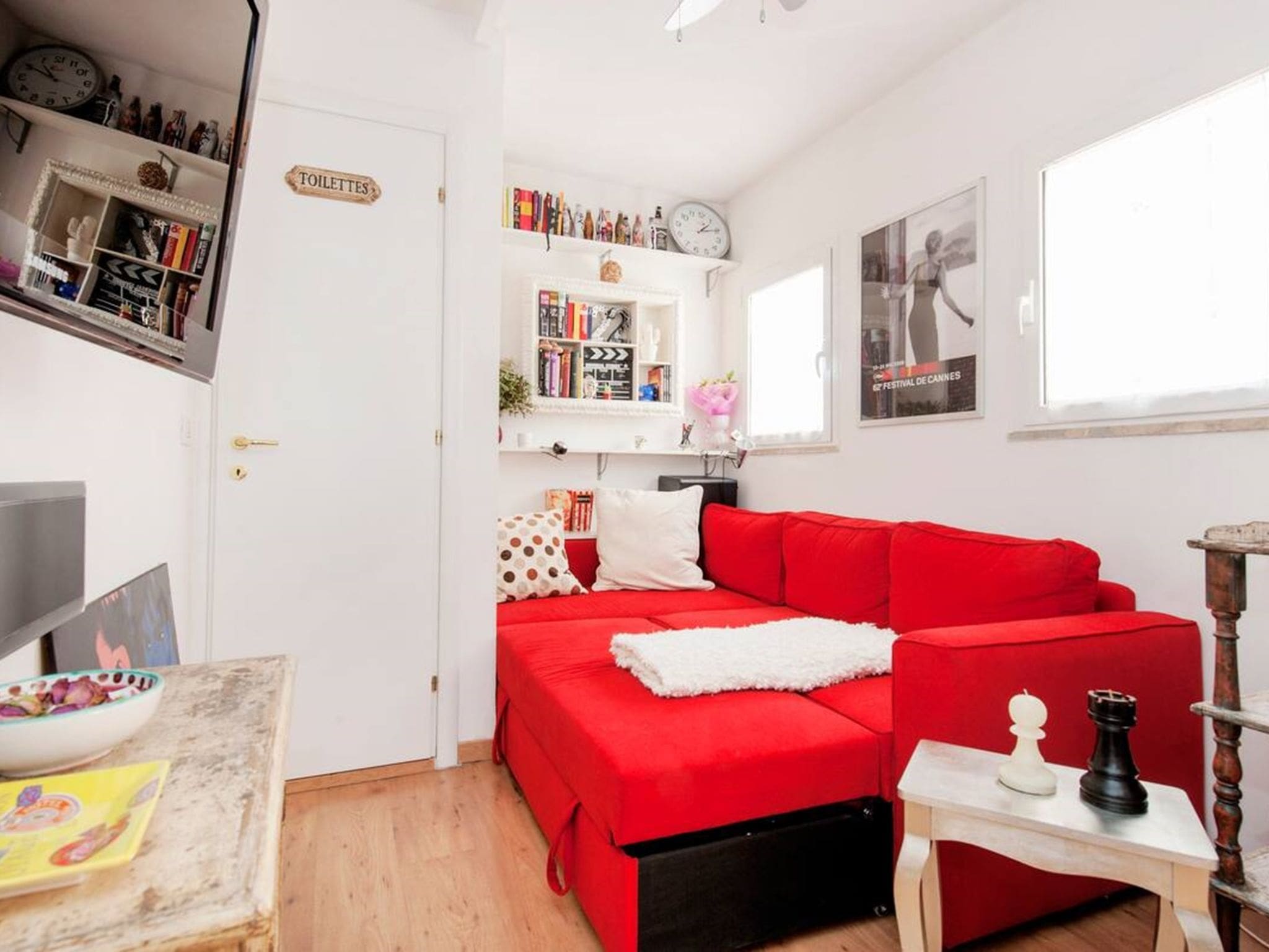 The 70-square-meter apartment unfolds across carefully designed spaces that maximize both comfort and functionality. The open-plan living area seamlessly integrates sleeping, dining, and kitchen areas, creating a versatile space perfect for couples or small families. High-quality furnishings complement the apartment’s architectural character, while large windows flood the interior with natural light. The separate double bedroom provides peaceful rest after days of exploration, while the well-appointed bathroom features both shower and bidet facilities. Throughout the apartment, thoughtful touches including air conditioning, heating, and complimentary WiFi ensure modern comfort in this historic setting.