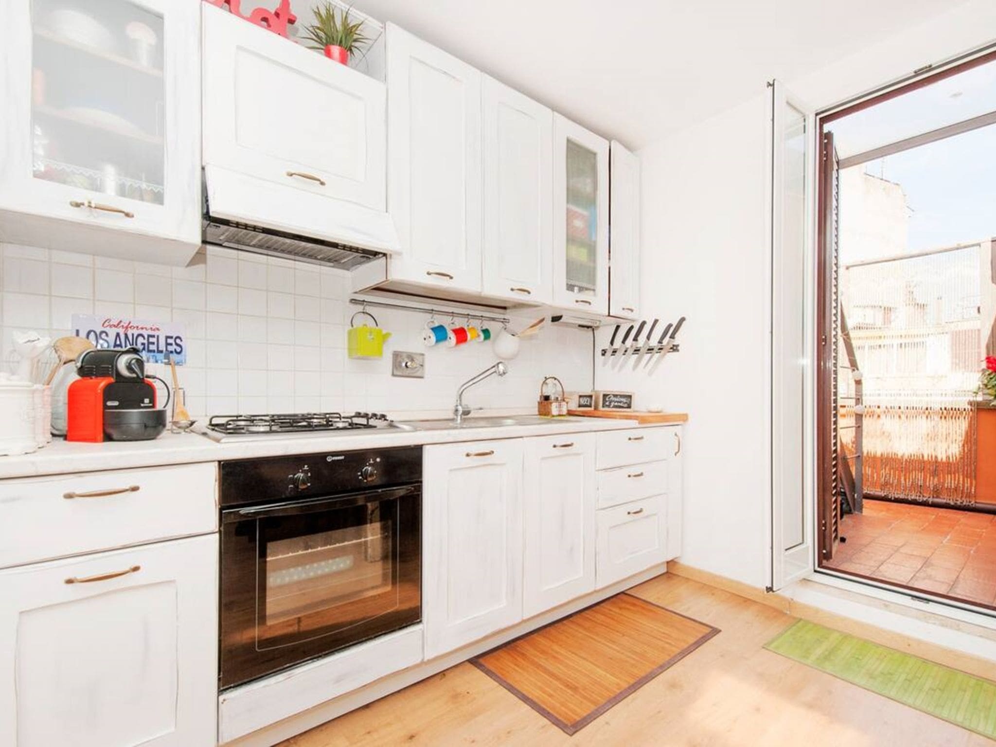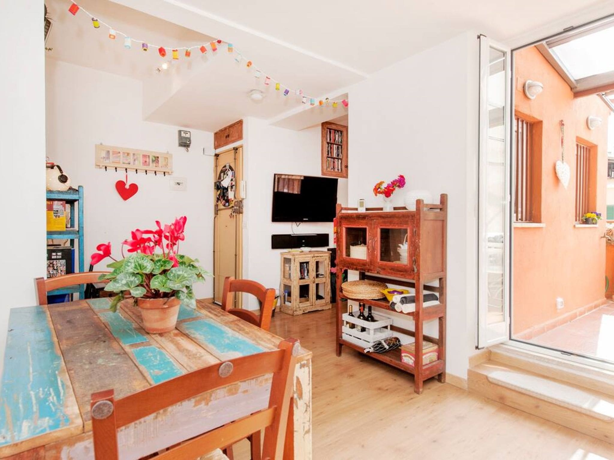 The apartment’s crowning feature is its private terrace, accessible from the main living area. This partly covered outdoor space provides a tranquil refuge from the bustling city below, furnished with comfortable seating where guests can enjoy morning coffee or evening aperitivos. The terrace offers charming views over the surrounding neighborhood, creating an intimate connection with authentic Roman residential life. Whether planning the day’s adventures or unwinding after visiting nearby attractions, this outdoor sanctuary adds immeasurable value to the Roman experience.
