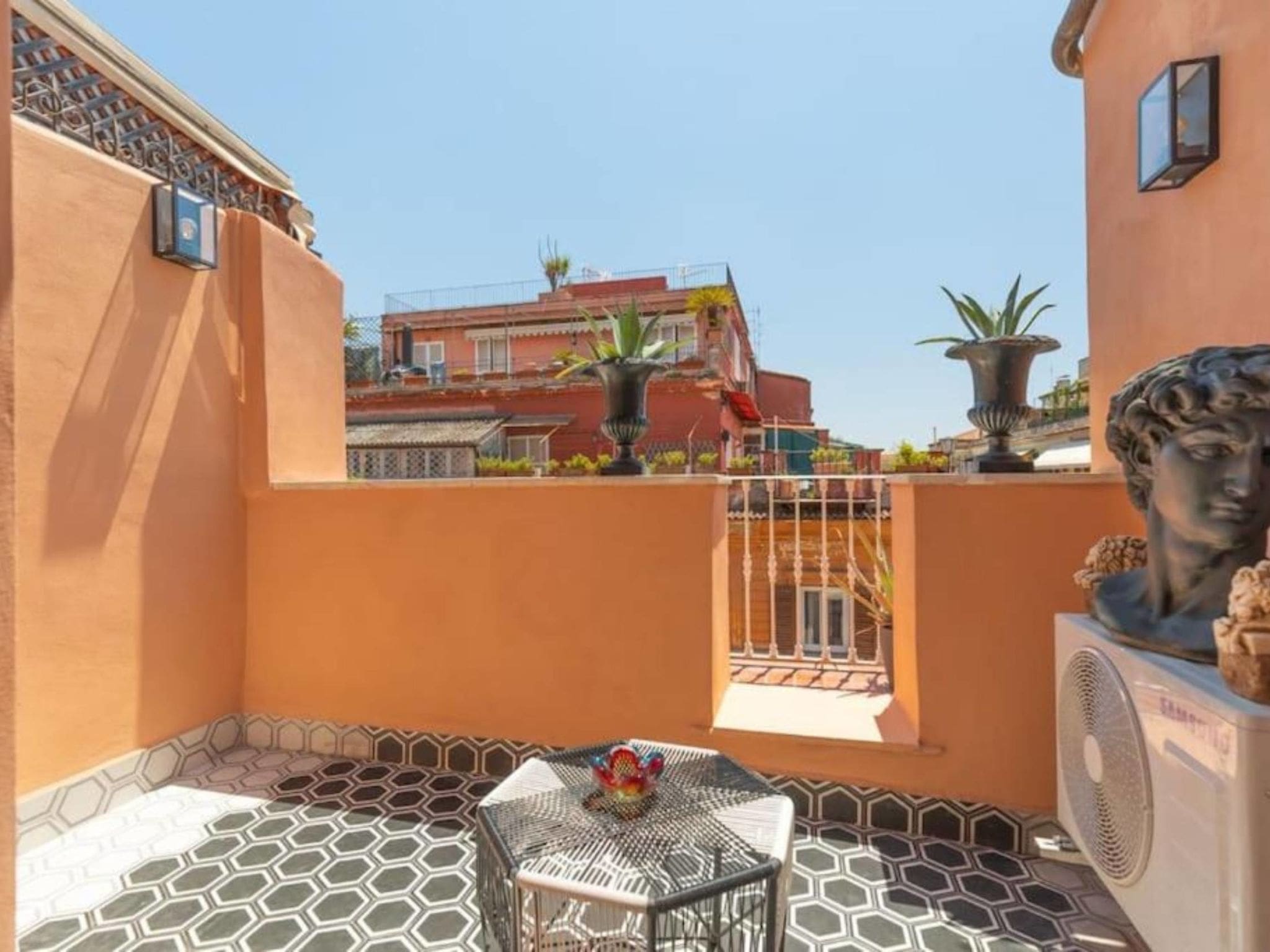 The furnished terrace provides an intimate outdoor sanctuary where you can enjoy morning espresso or evening aperitivos while taking in views over this historic quarter of Rome. Though compact, this outdoor space offers a rare luxury in central Rome – your own private slice of sky above one of the world’s most magnificent cities. The terrace furniture invites relaxation after days spent exploring the nearby attractions.
