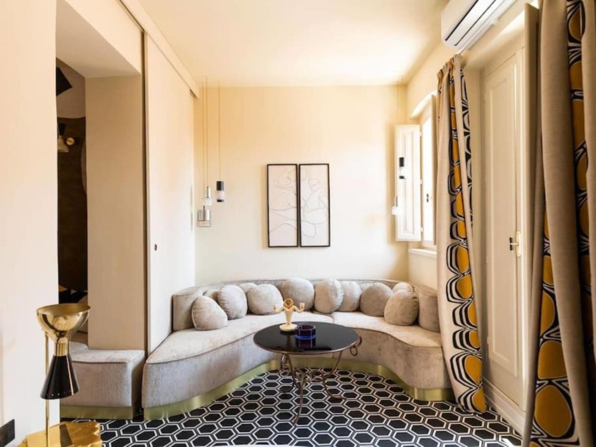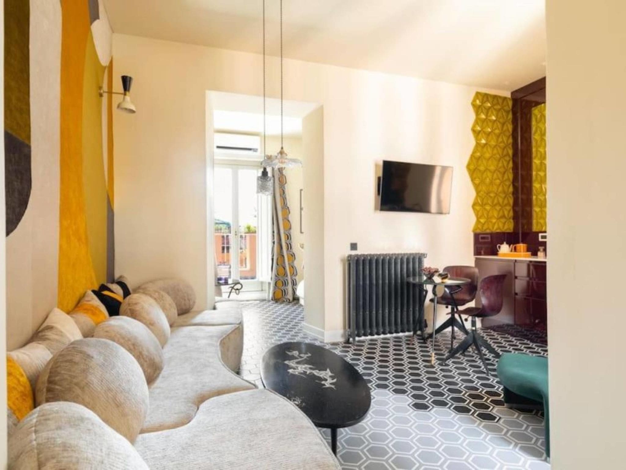 Palazzo Ludovisi Roma occupies the fifth floor of a distinguished historical building, accessible via private elevator. The 90-square-meter apartment has been thoughtfully designed to maximise both space and style, featuring contemporary comforts within a classic Roman setting. The entrance hall leads to an open-plan living and dining area that seamlessly connects with a modern kitchen corner, equipped with dishwasher and induction cooking facilities. The master bedroom offers generous proportions with sliding doors for flexible living arrangements, while a second sleeping area provides comfortable accommodation for additional guests. The apartment includes a full bathroom with bathtub and a separate guest WC for added convenience.