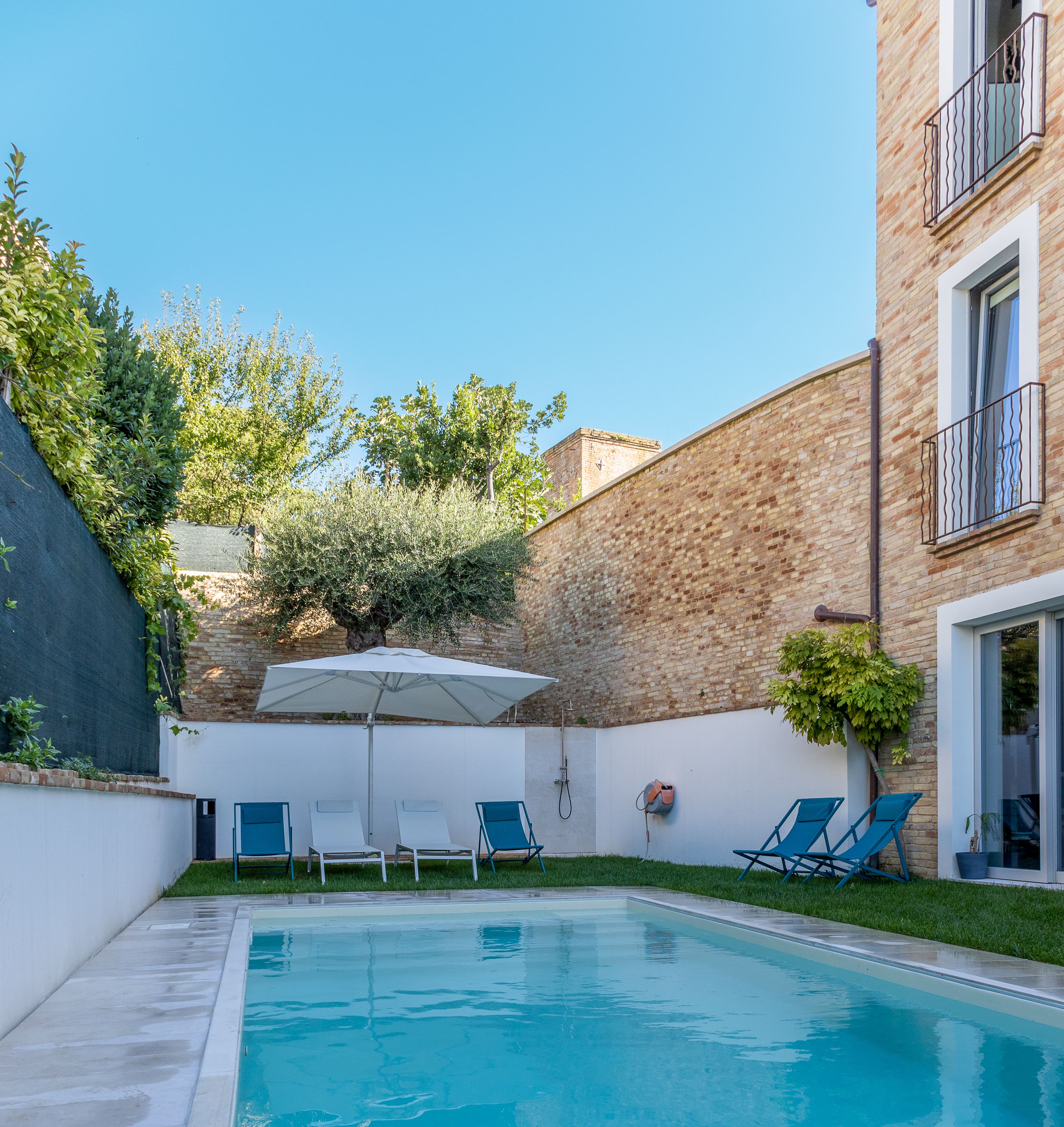 Step outside to discover a serene garden that extends alongside the apartment, offering ample space for relaxation and play. The unfenced swimming pool is a highlight, providing a refreshing escape on warm days, although supervision is necessary for younger guests. An outdoor shower adds convenience, and the terrace is perfect for al fresco dining against the backdrop of Marche’s rolling hills.