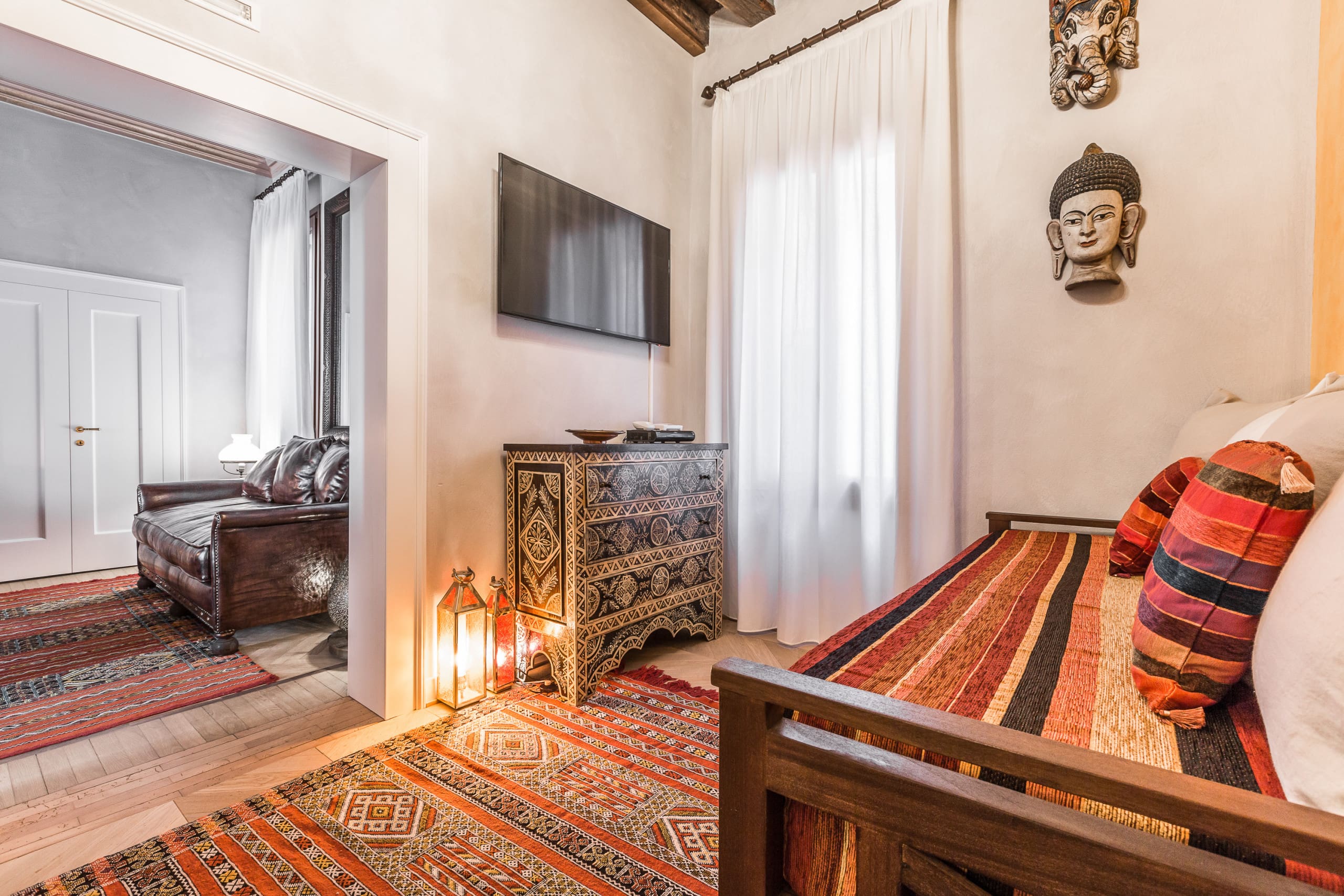 Step inside this beautifully appointed apartment and be greeted by the traditional Venetian allure. The spacious living area is adorned with unique curiosities, echoing the adventurous spirit of Marco Polo. The well-equipped kitchen invites culinary exploration, while the two elegant bedrooms offer serene retreats with plush bedding and en-suite bathrooms. A small single bed in the living area accommodates an additional guest, perfect for families or close friends.